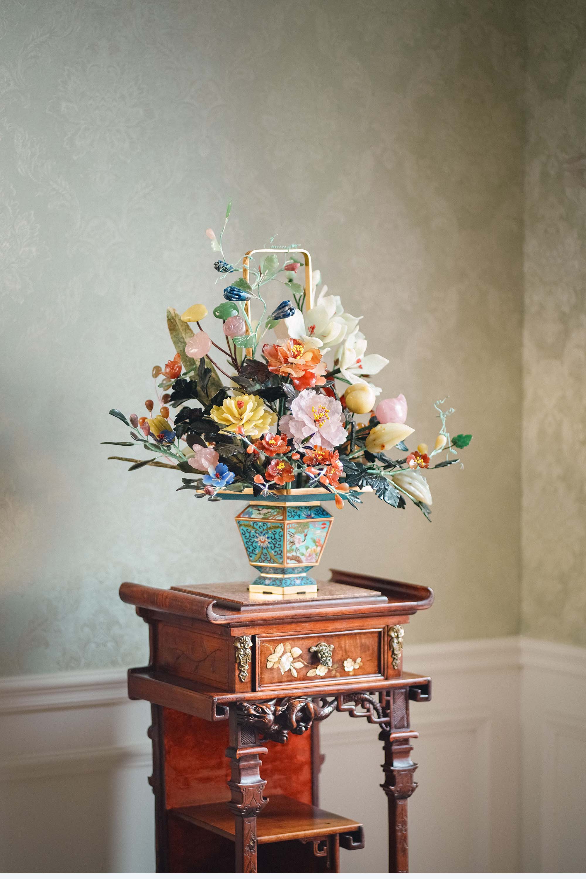 【已售】独角鹿西洋古董中国出品花篮造型飞鹤与宝相花纹景泰蓝盆装饰「玉堂富贵」珍宝像生盆景