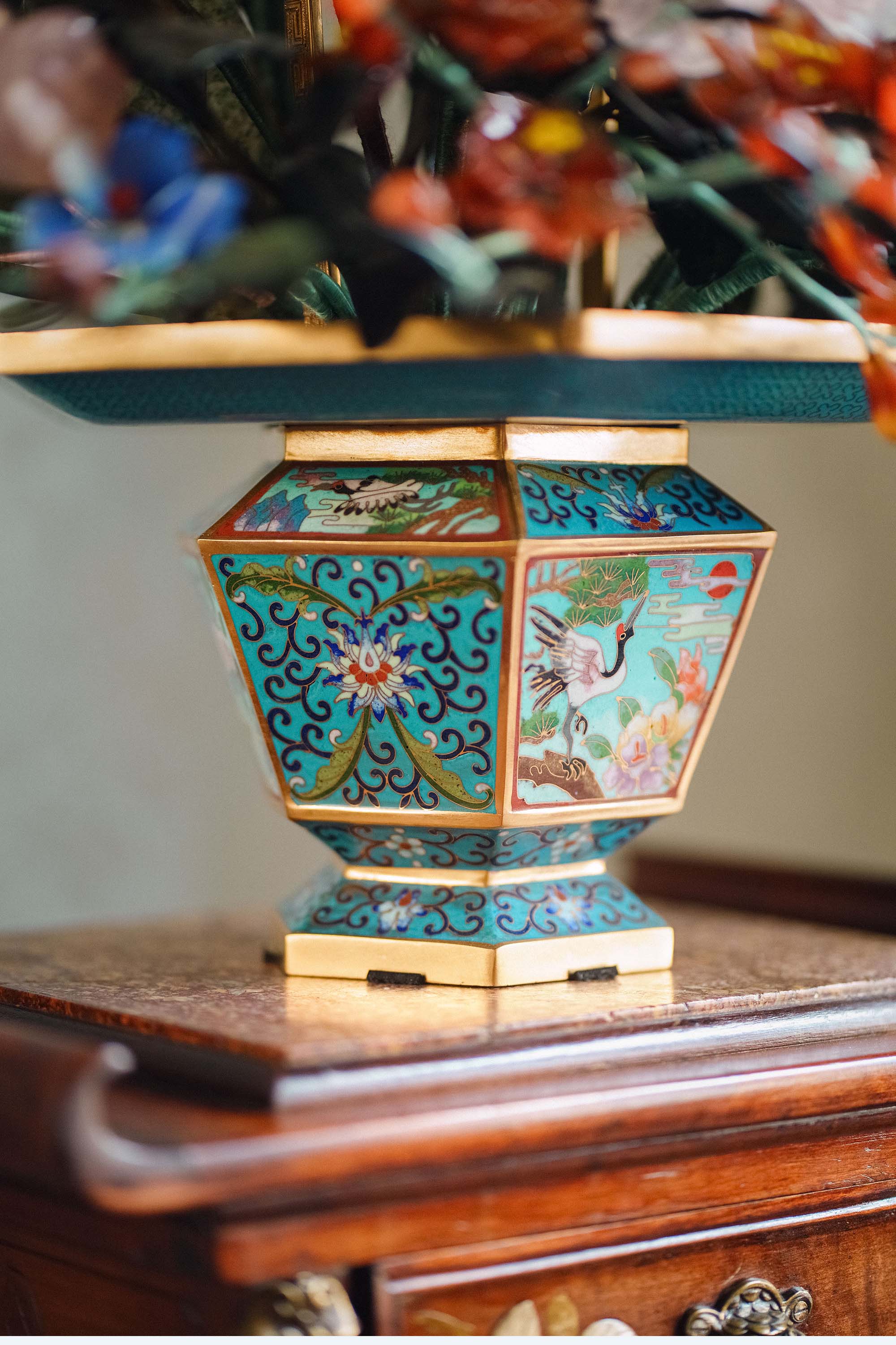 中国出品花篮造型飞鹤与宝相花纹景泰蓝盆装饰「玉堂富贵」珍宝像生盆景
