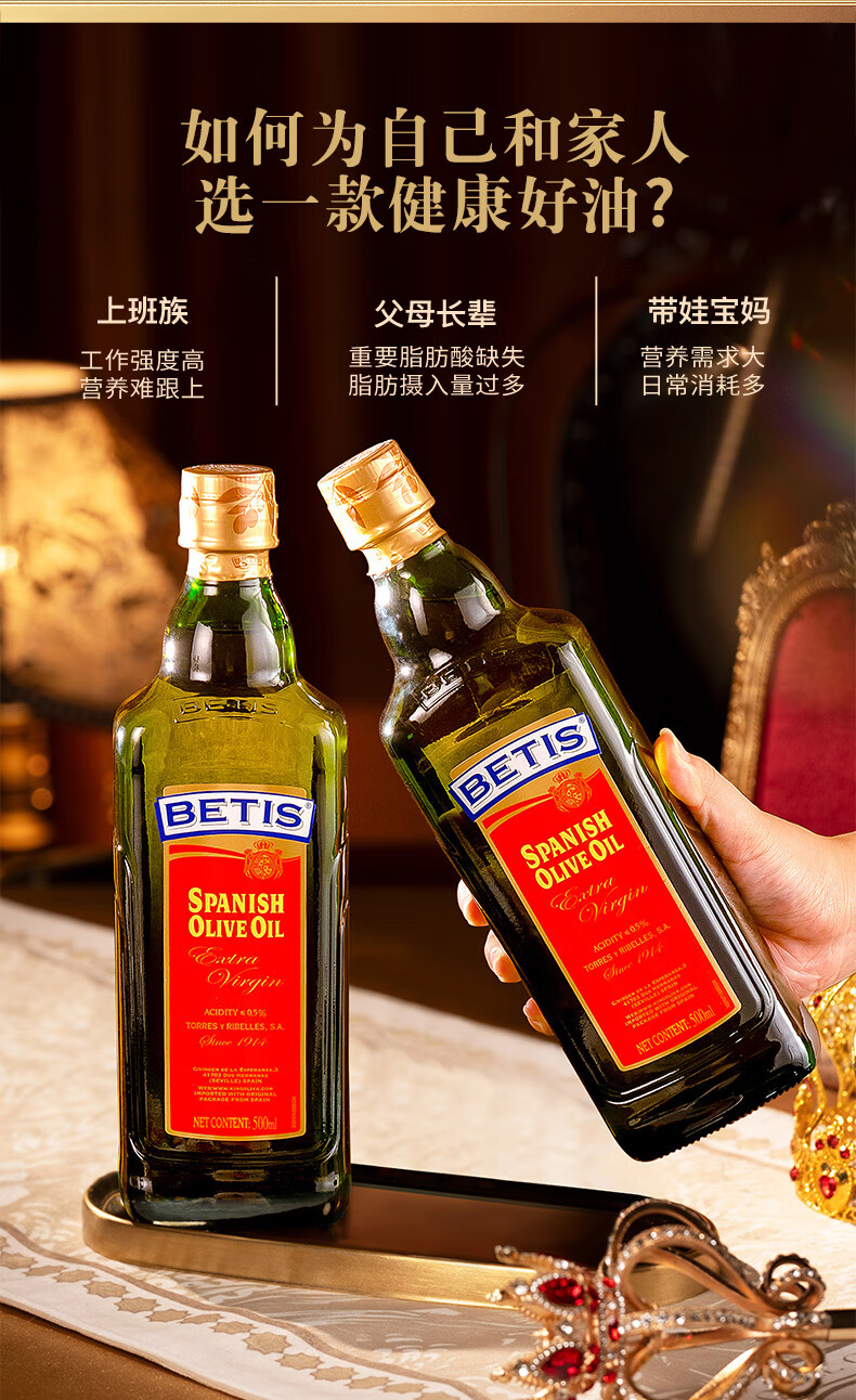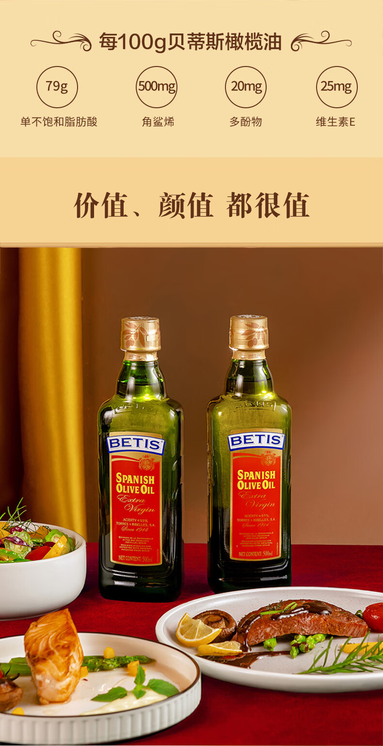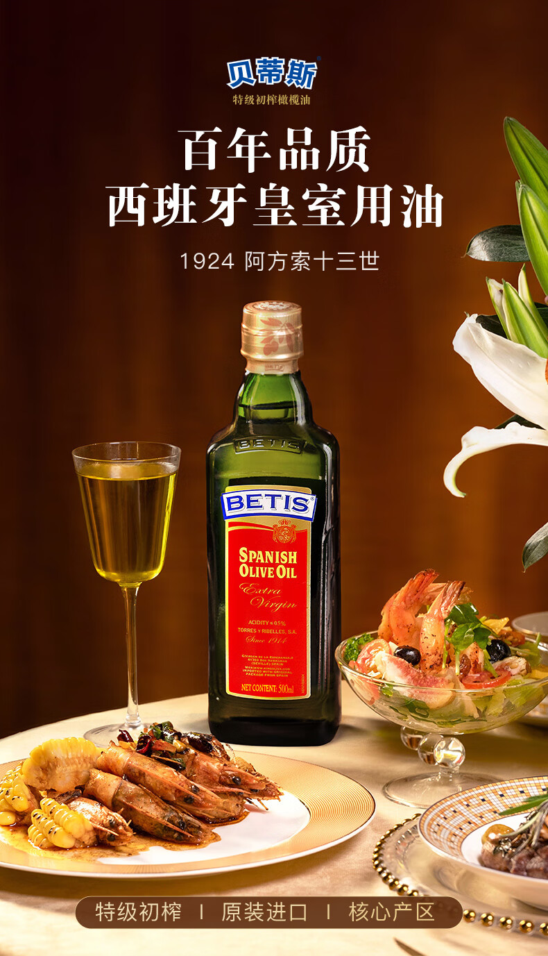 贝蒂斯(BETIS)特级初榨橄榄油 500ml/瓶 食用油 西班牙原装进口 热炒凉拌食用油