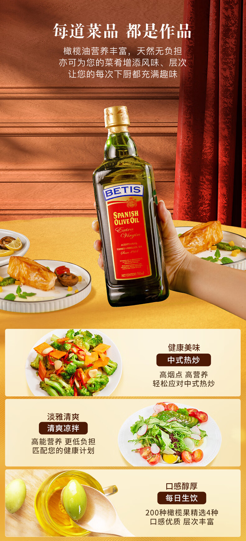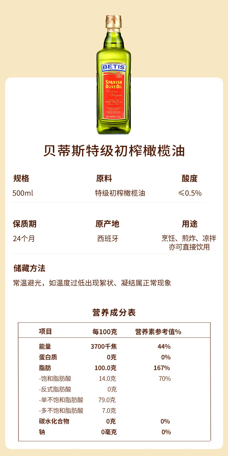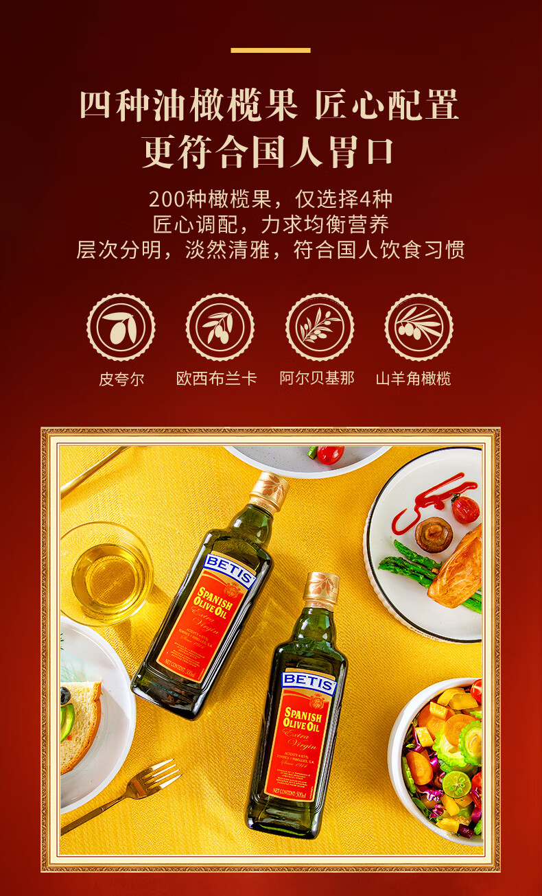 贝蒂斯(BETIS)特级初榨橄榄油 500ml/瓶 食用油 西班牙原装进口 热炒凉拌食用油