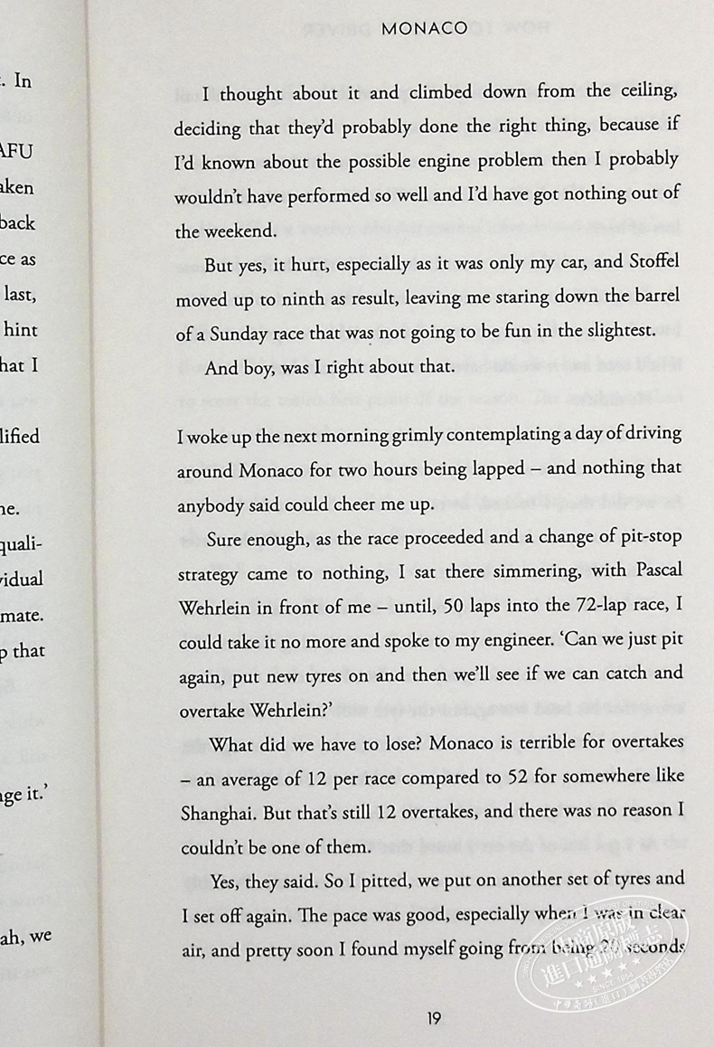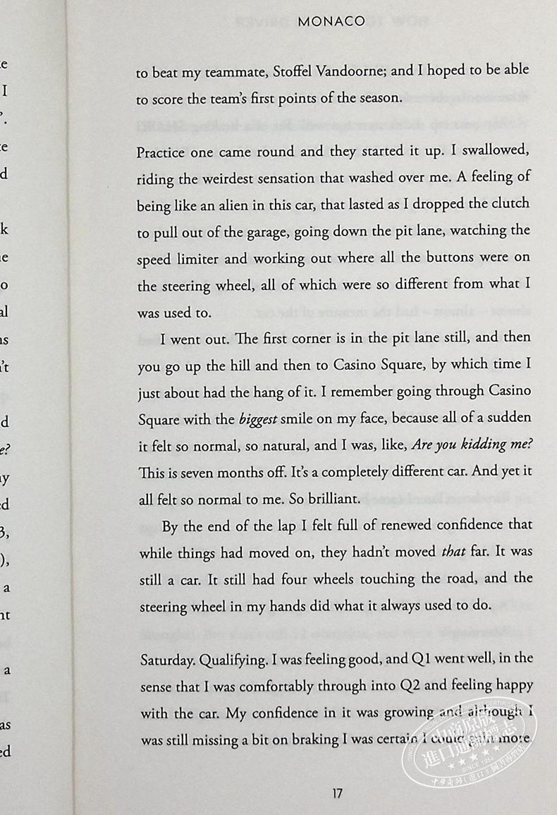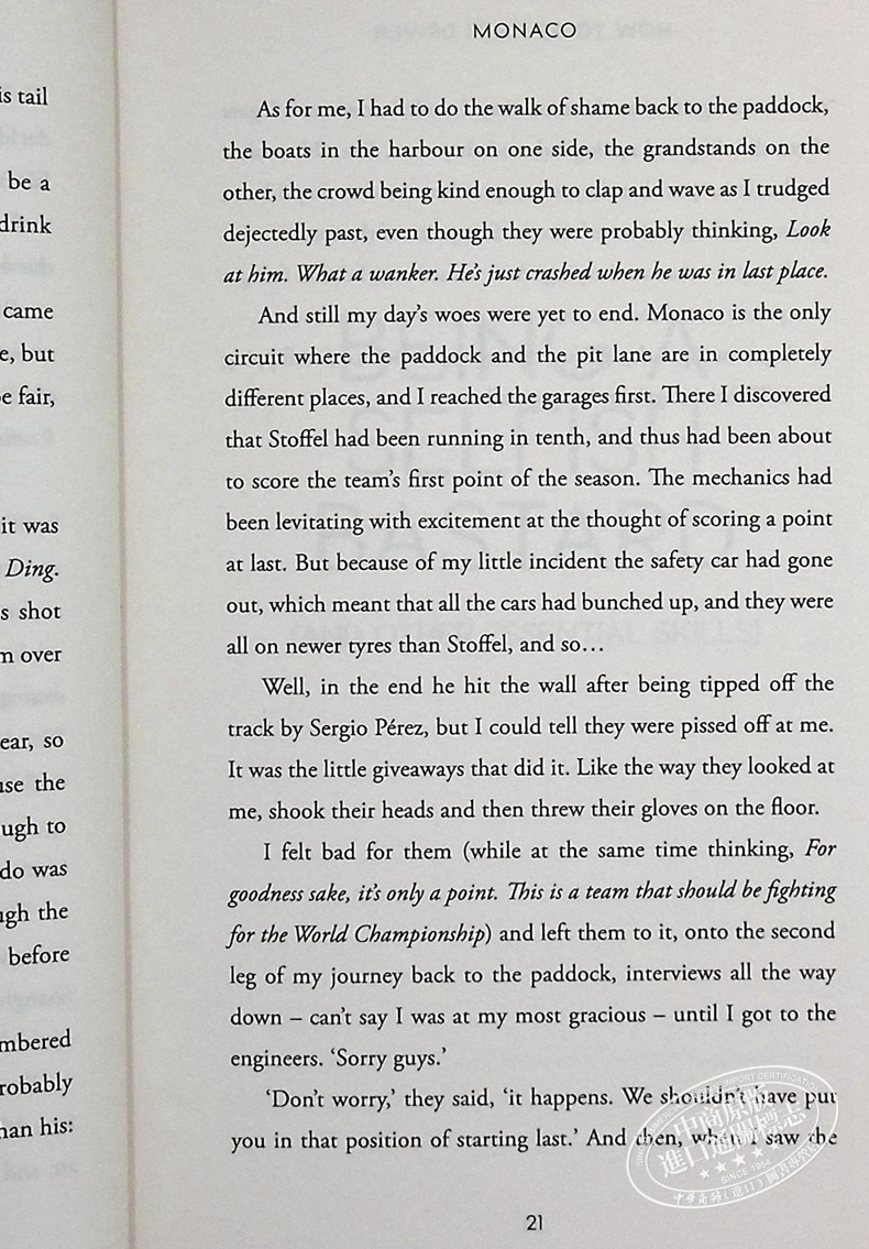 简森·巴顿是他这一代人中伟大的赛车手之一。在过去的17年里,他参加了一级方程式比赛,赢得了15场大奖赛。2009年,他为没有赞助的Brawn车队赢得了世界获胜者,这是本世纪不可思议的、逆天的体育故事之一。巴顿是体育界受欢迎的人物之一。他在Twitter上有270多万粉丝,在Facebook上有100万个赞,在Instagram上有60多万个粉丝。同为英国世界获胜者的刘易斯·汉密尔顿的书卖出了30多万册,而达蒙·希尔和马克·韦伯的书在过去两年里也分别卖出了5万多册。詹森的第二本书充满了特别见解和不为人知的故事,提供了了解一级方程式赛车生活的幕后途径。它是2018年畅销的体育书籍,通过TCM销售了13.3万册。