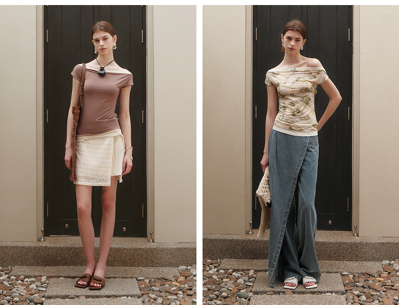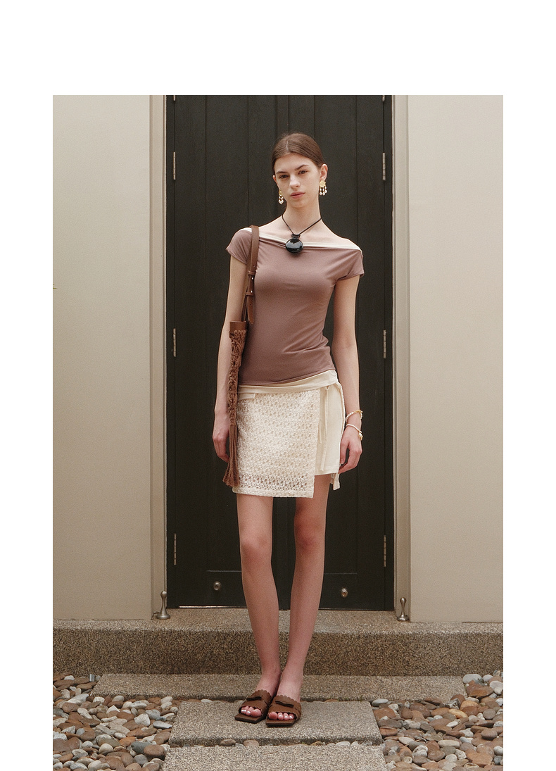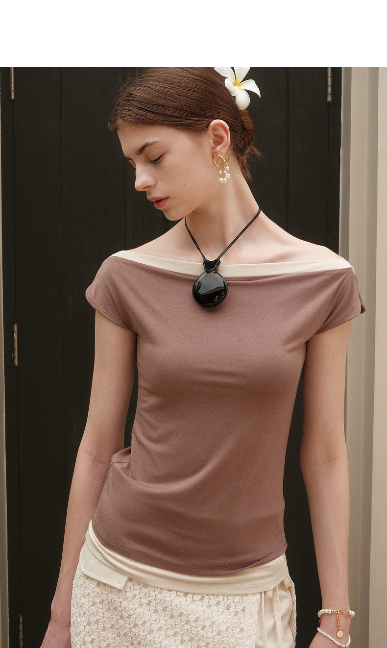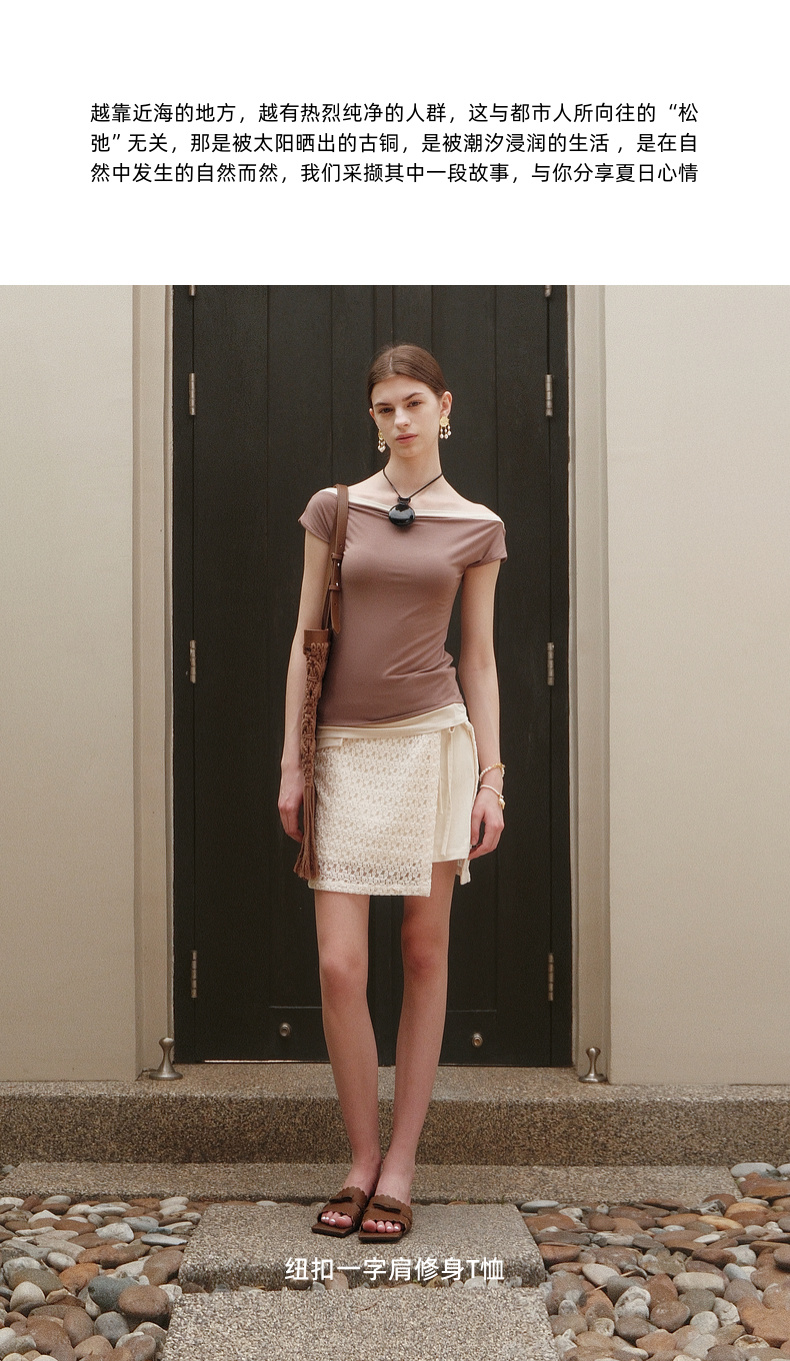 lost in echo2025夏季新款度假时尚纽扣一字肩透气短袖T恤上衣女
