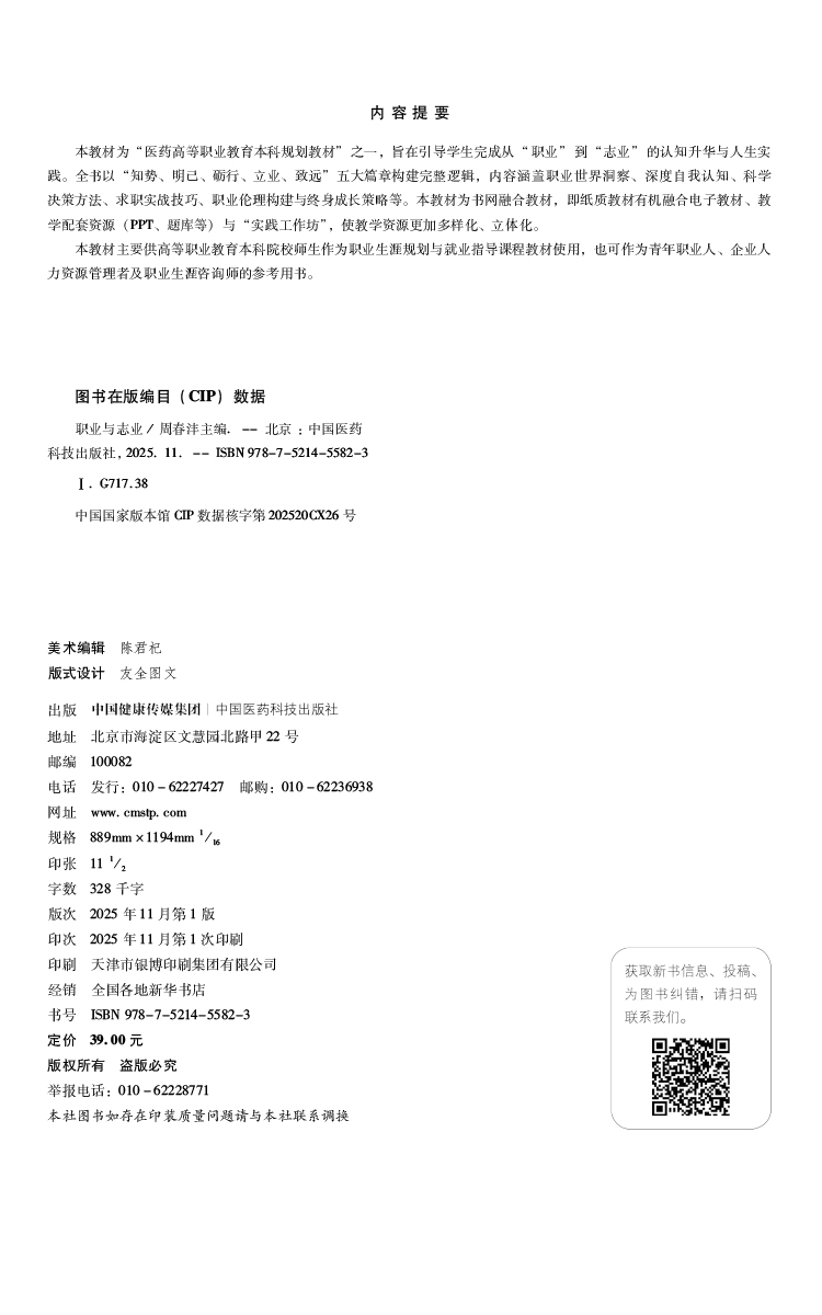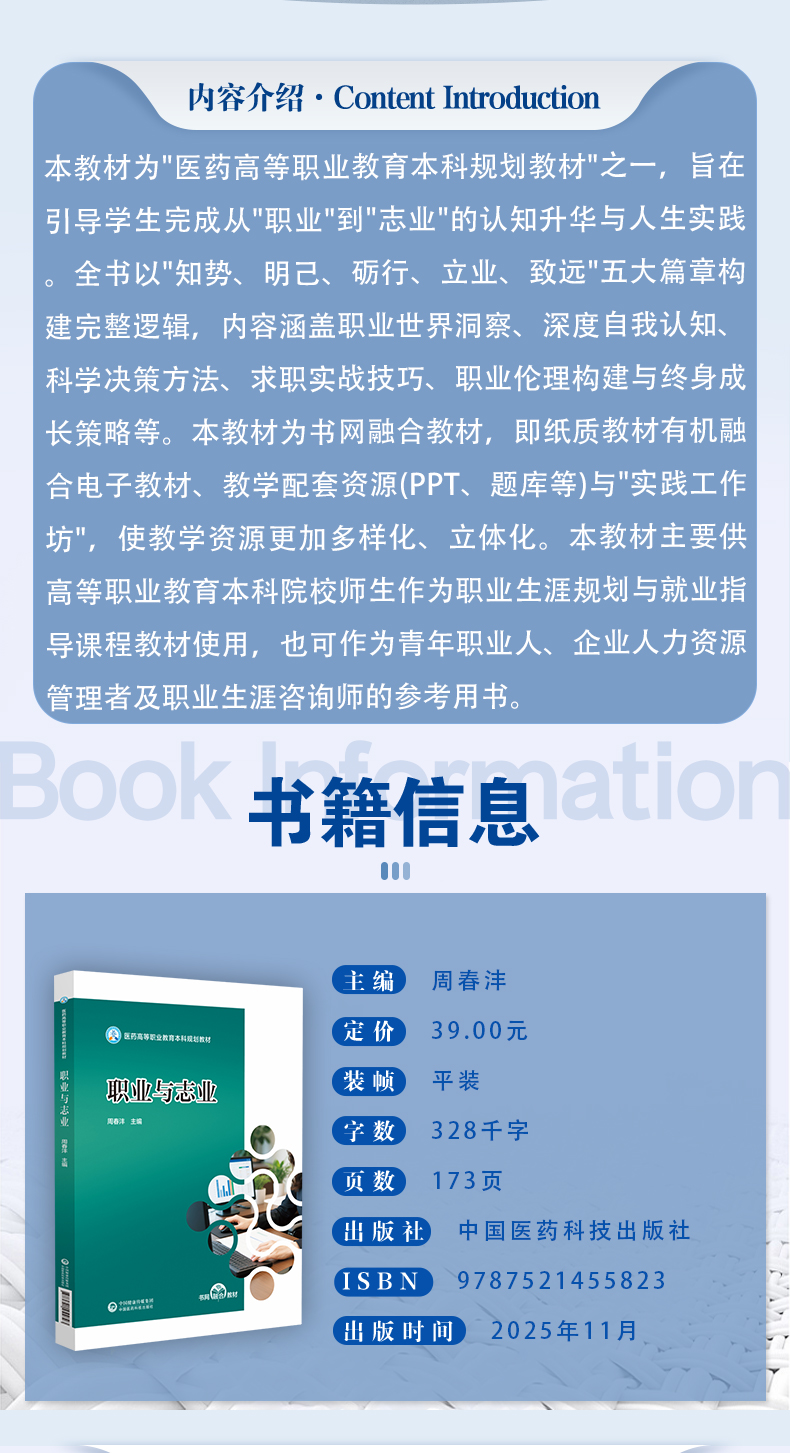 职业与志业(医药高等职业教育本科规划教材)周春沣 主编 本教材为书网融合教材 即纸质教材有机融合电子教材 中国医药科技出版社