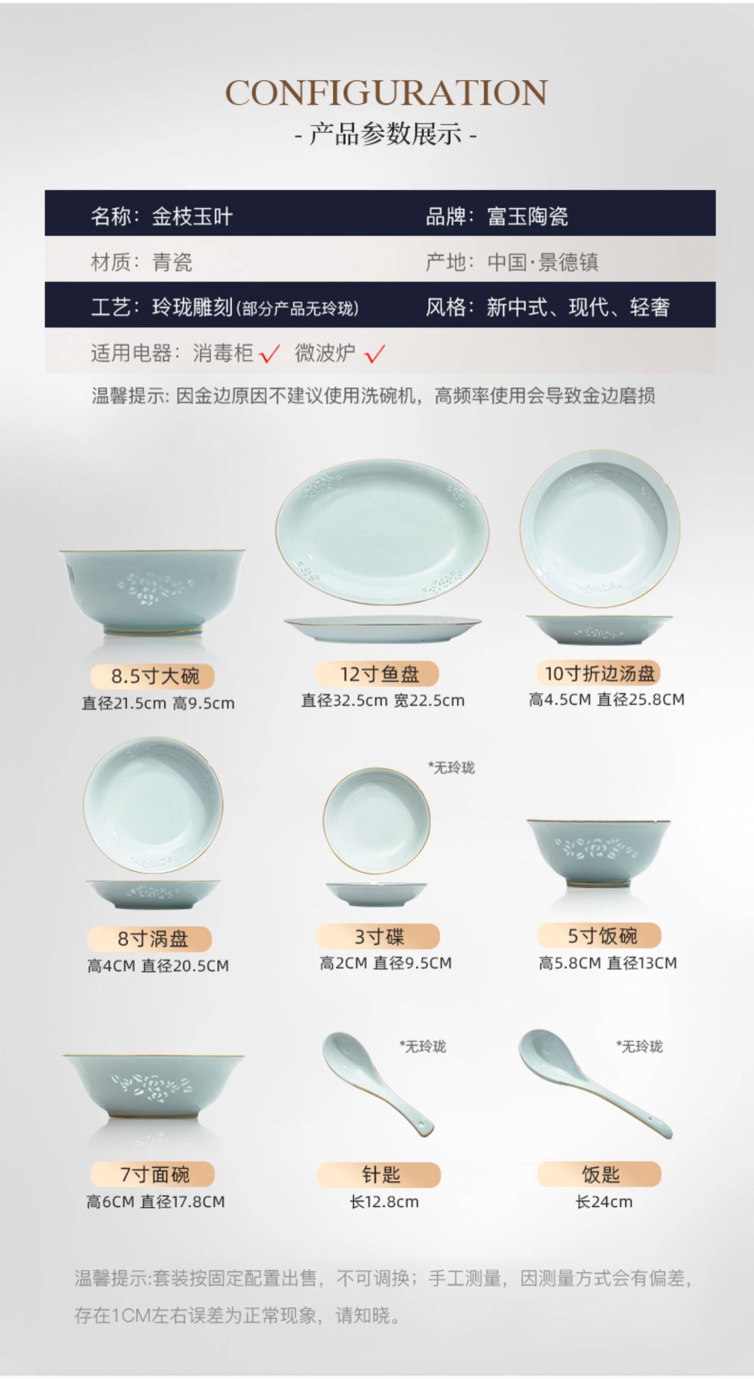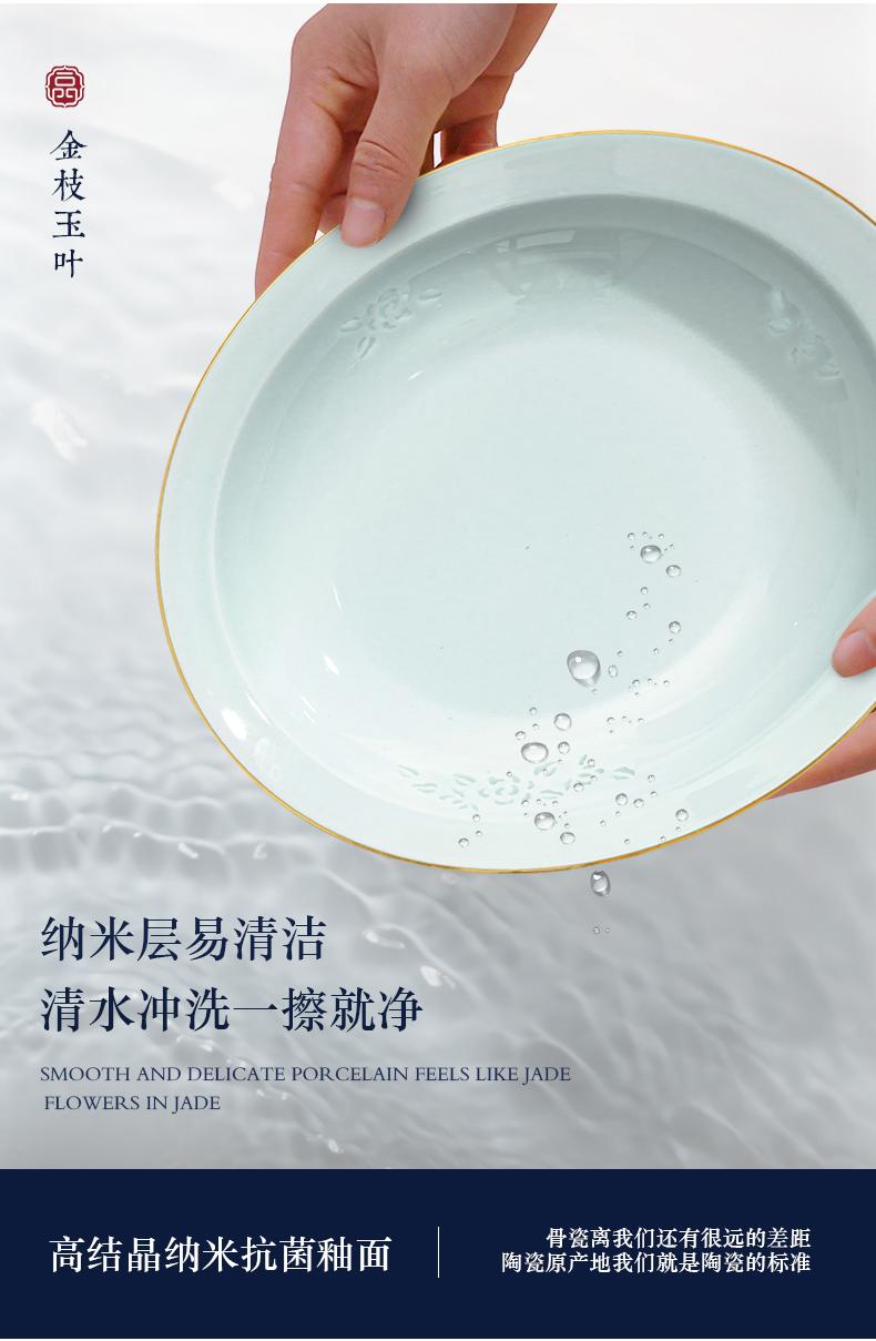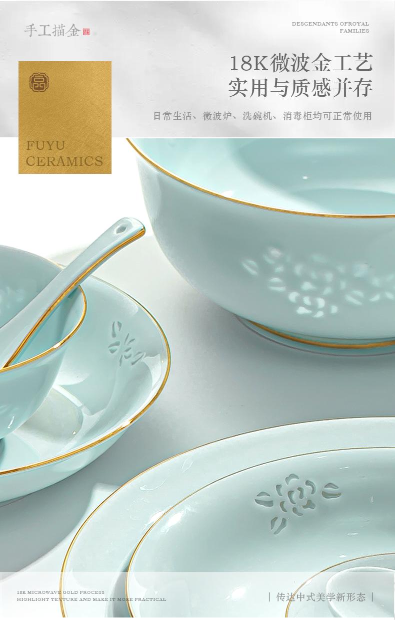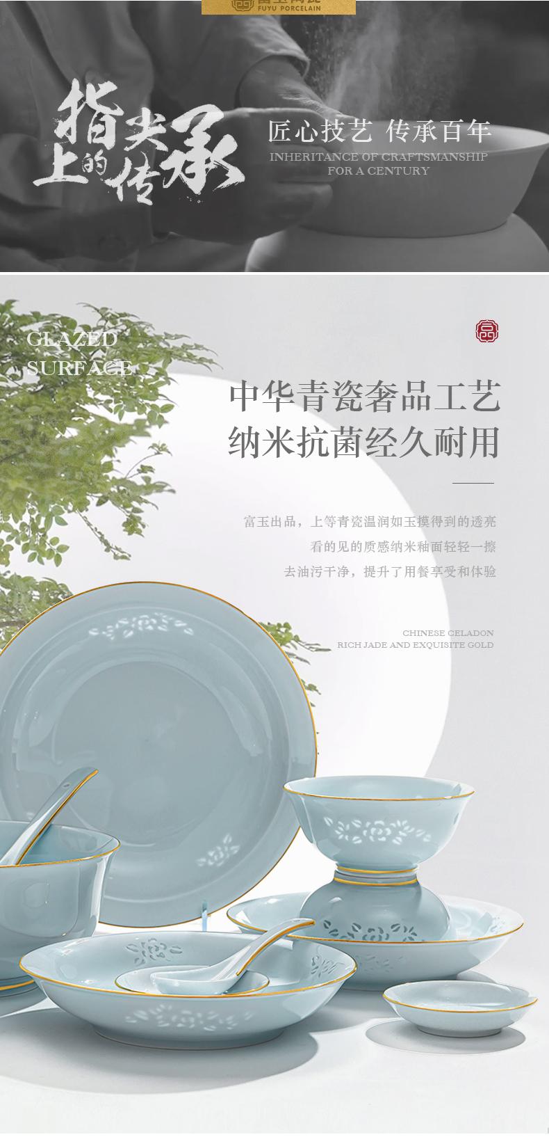 富玉 景德镇陶瓷餐具套组家用玲珑瓷 青釉金枝玉叶餐具