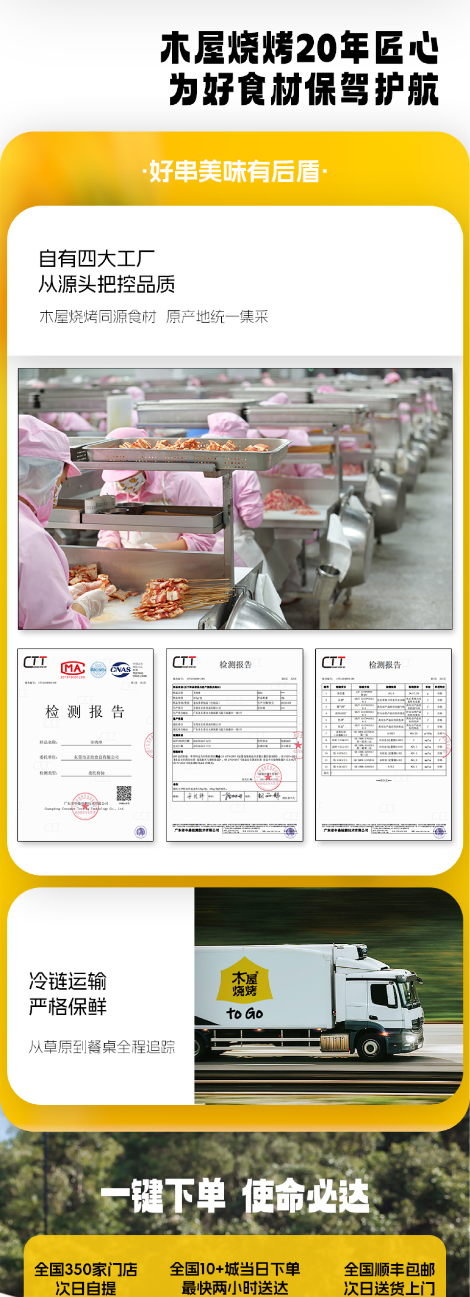 木屋烧烤半成品套装,一键下单,使命必达。 -全国300家门店支持次日到店自提 -全国顺丰包邮,当日下单,次日顺丰送货上门(部分区域除外,实际以顺丰时效为准)