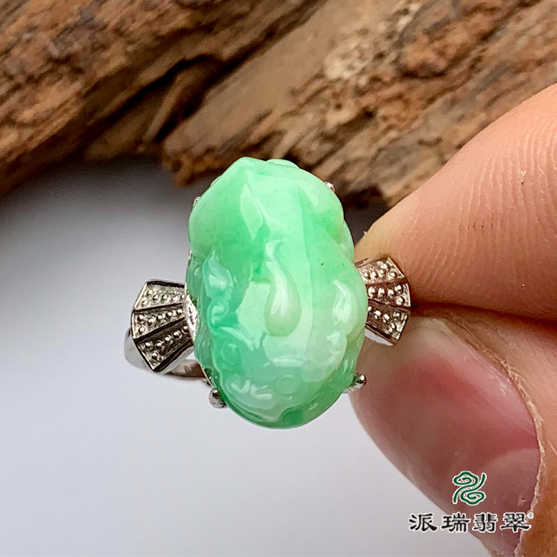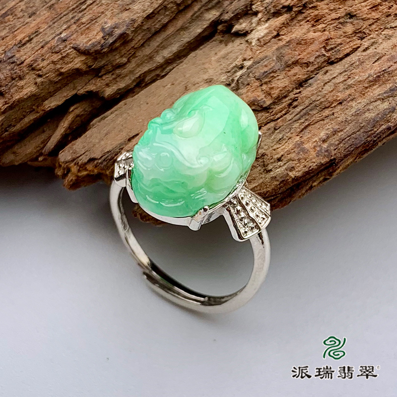 派瑞翡翠 翡翠戒面 糯种 绿色 银托镶嵌
