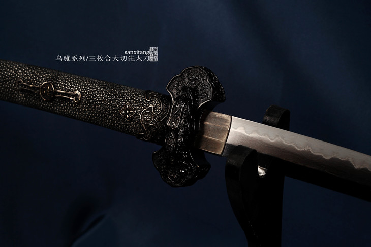 中配版 这一套是日本非常经典的金具 天皇近卫军标配 全长115cm 还有一个华丽的版本 这只我们做的是乌骓系列的配色 铜装雕刻做黑 手柄和鞘都是东南亚进口的优质珍珠鱼皮 表面手工打磨光滑 不上清漆 手感真实非常不错 里面刀条是我们自己锻打的三枚合夹钢 就是三层钢夹在一起锻打 旁边两片是硬度低韧性好的 中间是硬度高的 这样取长补短 让这把东西在拥有高硬度的同时也兼具韧性 大大提升实用性能 叨条的形状和线条打磨的很清楚 这次做了大切先 还挺好看 规则的丁子烧刃 表面手工研磨 整个东西质感还是不错的 收藏或者送人都是很好的选择