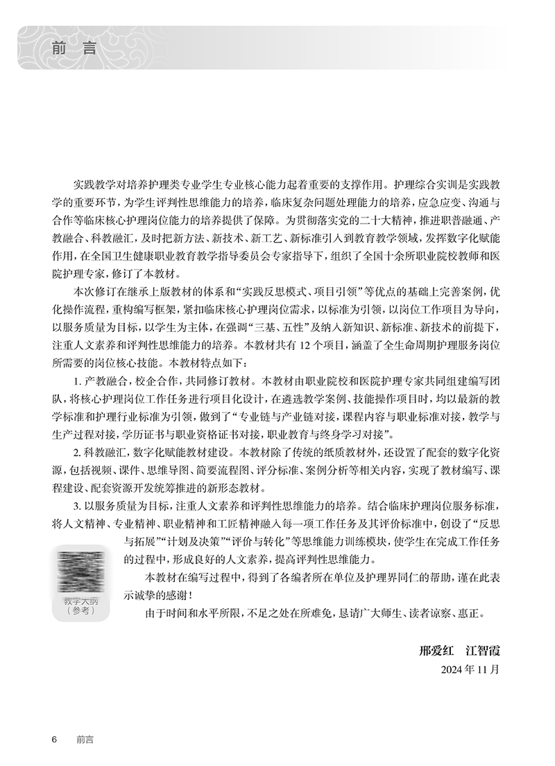 本教材为高等职业教育专科护理类专业“十四五”规划教材之一、国家卫生健康委员会“十四五”规划教材之一。护理综合实训是护理类专业学生进入临床实习前开设的一门专业必修课。对提高学生职业能力、评判性思维能力以及职业素养起着重要的支撑作用。如何解决学生在掌握护理类专业核心技术技能基础上,用评判性思维方式解决岗位实际问题,是该教材的主旨思想。按照护理工作岗位组织教学内容,分为门诊病人的护理技能、急诊病人的护理技能、急危重症病人的护理技能、围手术期病人的护理技能、内科病人的护理技能、外科病人的护理技能、孕产妇及疾患妇女护理技能、早产儿及婴幼儿护理技能、老年人护理技能等9个模块内容。
