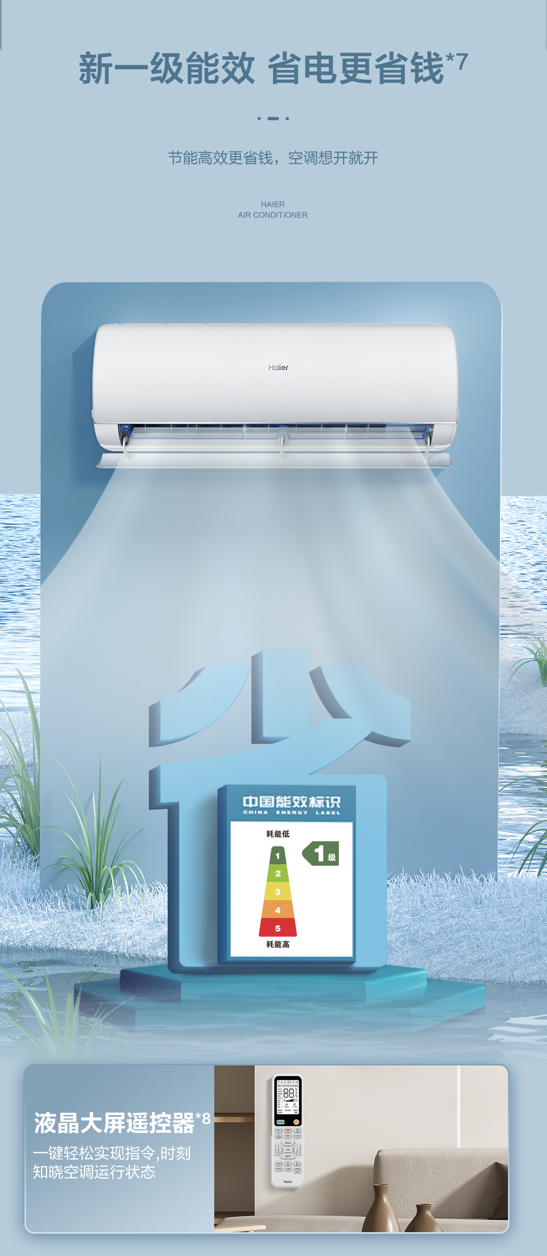 海尔空调(140195)KFR-35GW/CAB-1 62℃高温制冷不停机,53℃能力足,酷暑也清凉。 强劲(高能效):新一级能效APF5.32 省电31%
