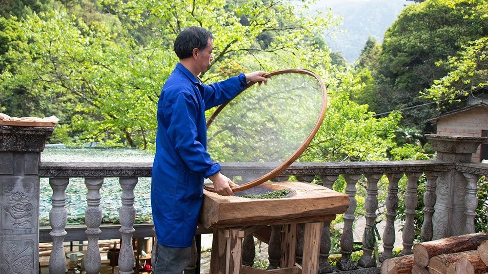 芽头在青筛上进行日光萎凋