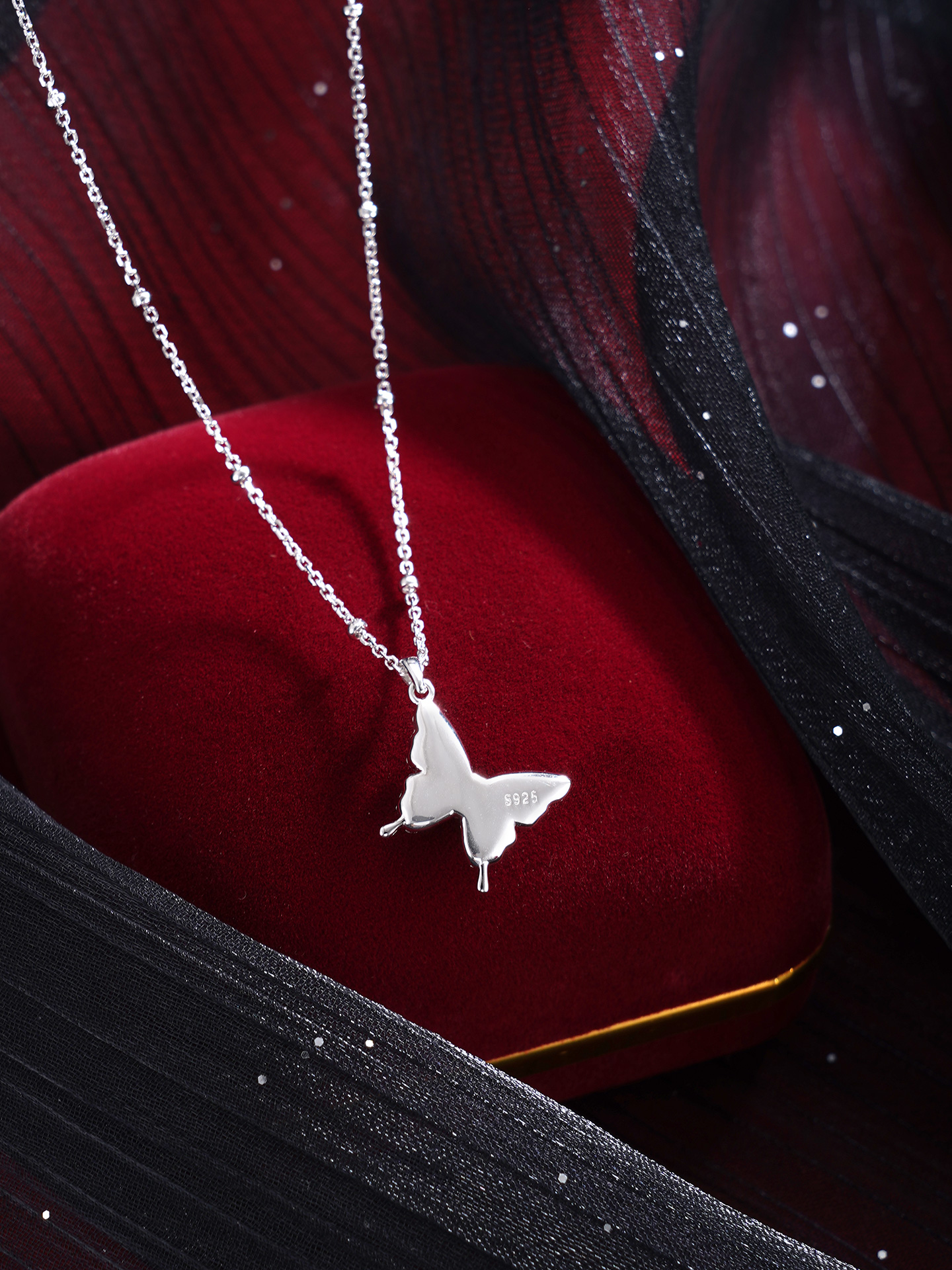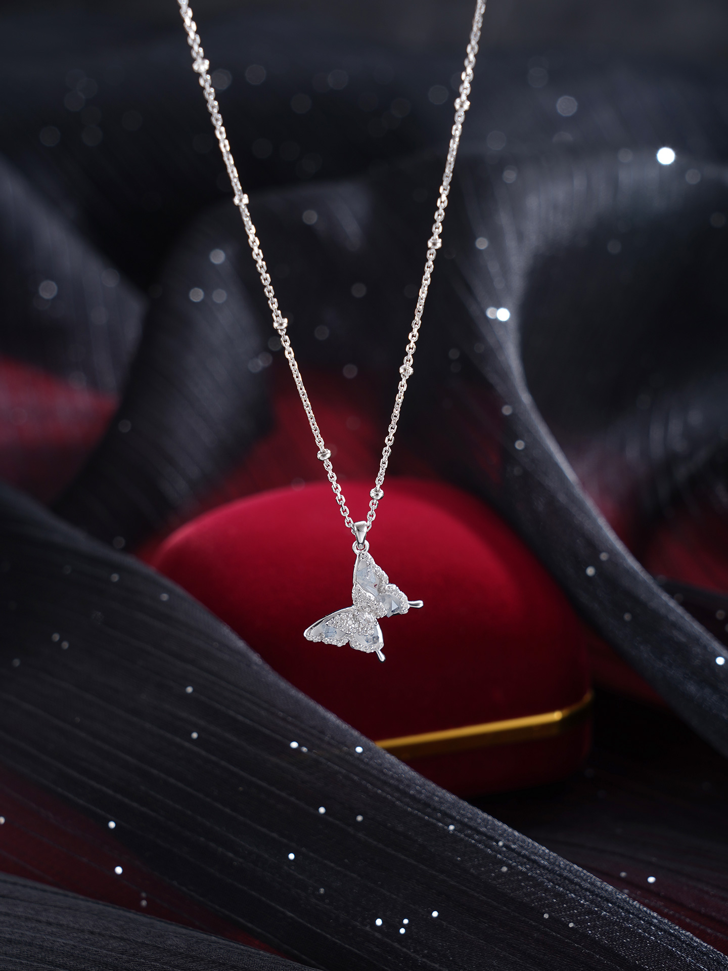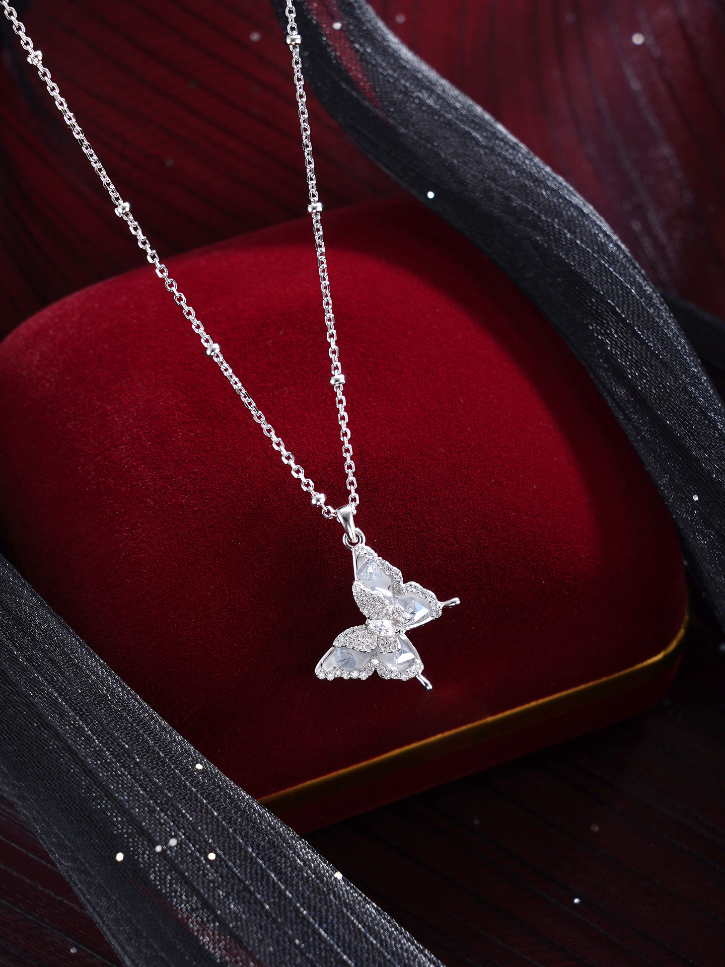 【寓意】:项链灵感源自蝴蝶,锆石镶嵌,尽显优雅与灵动。双层蝴蝶设计,寓意福气叠加,好运绵绵。