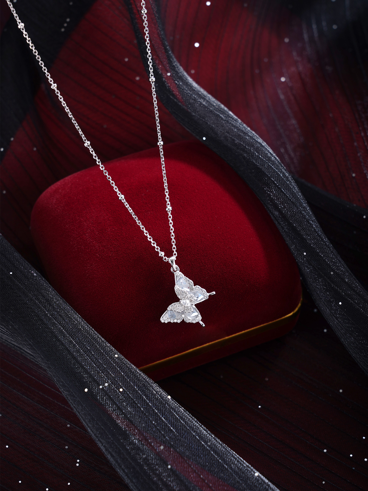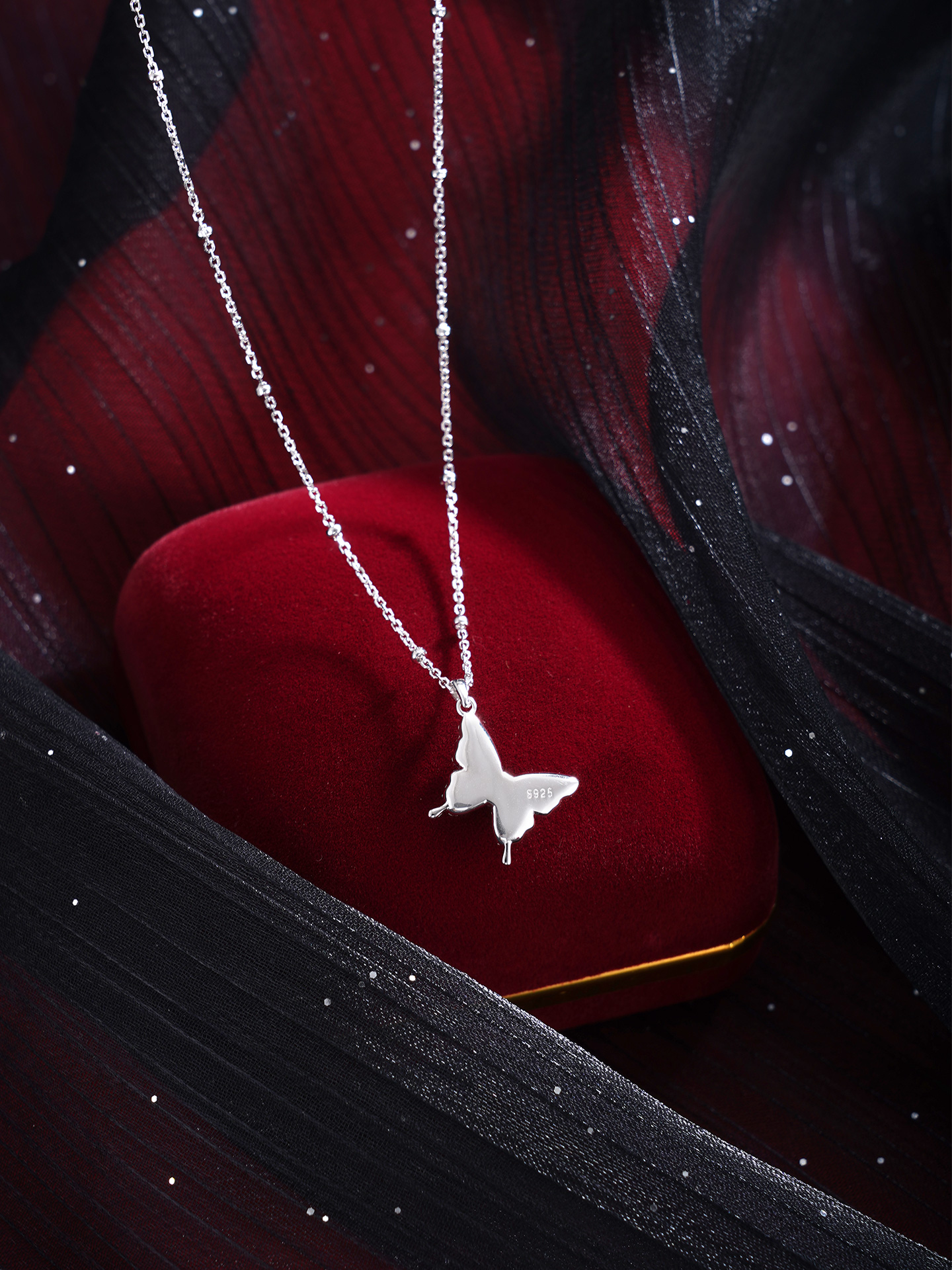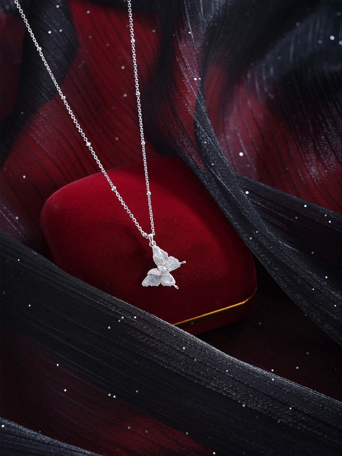 【寓意】:项链灵感源自蝴蝶,锆石镶嵌,尽显优雅与灵动。双层蝴蝶设计,寓意福气叠加,好运绵绵。
