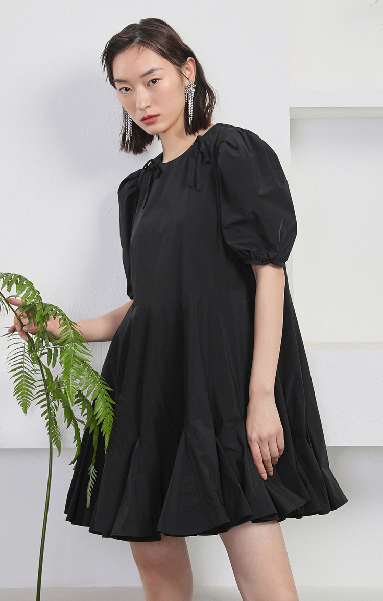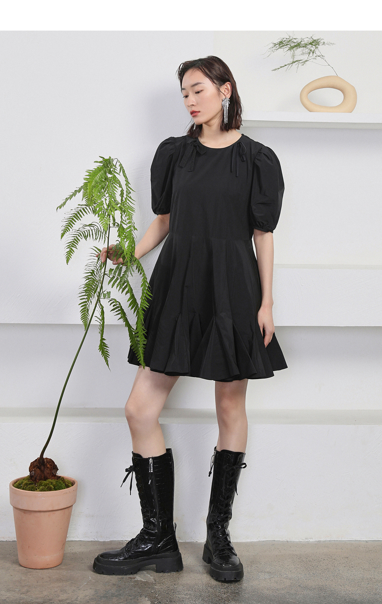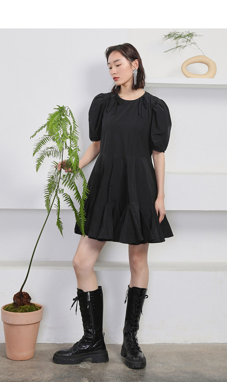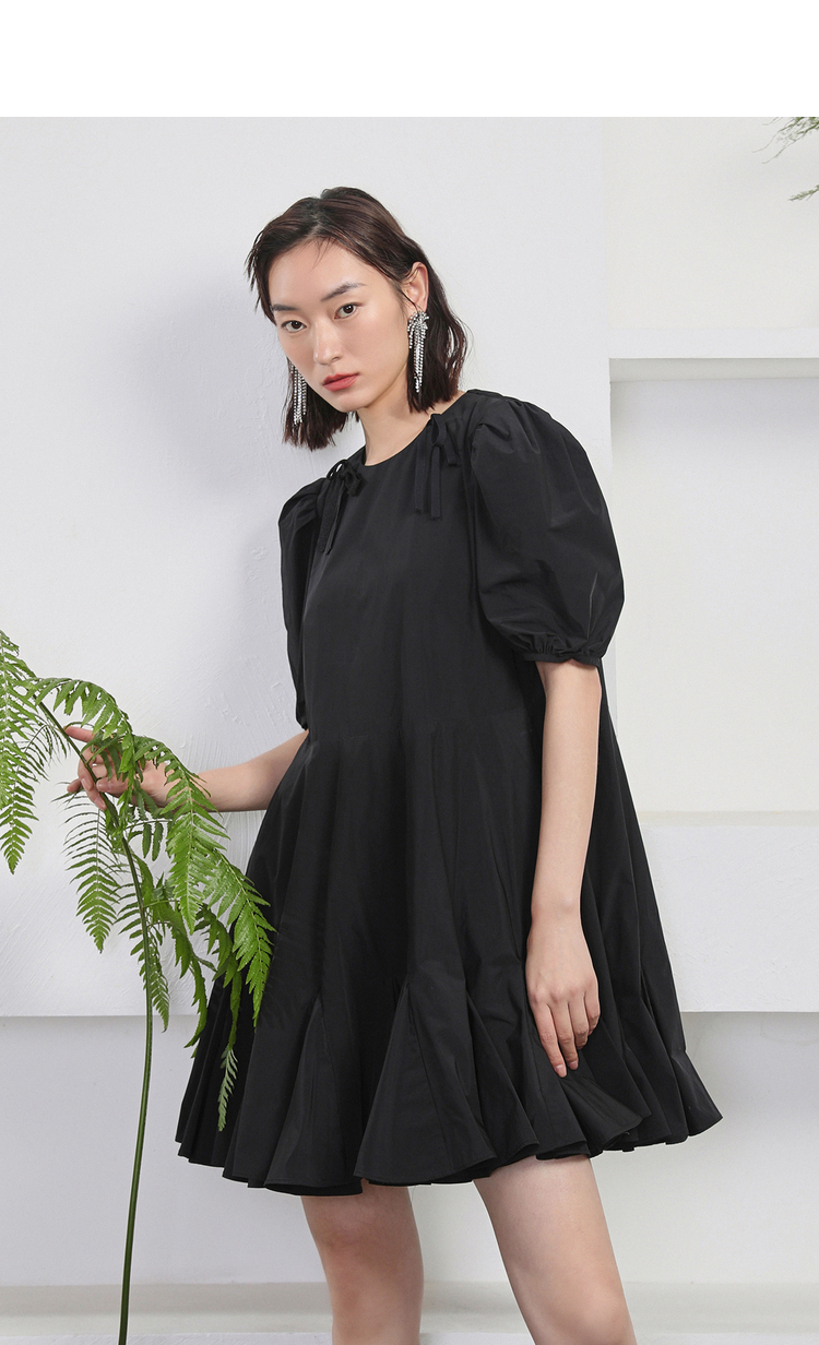 NEELLY纳俪商场同款夏季新款黑色娃娃裙设计感泡泡袖连衣裙减龄N22044Y04418