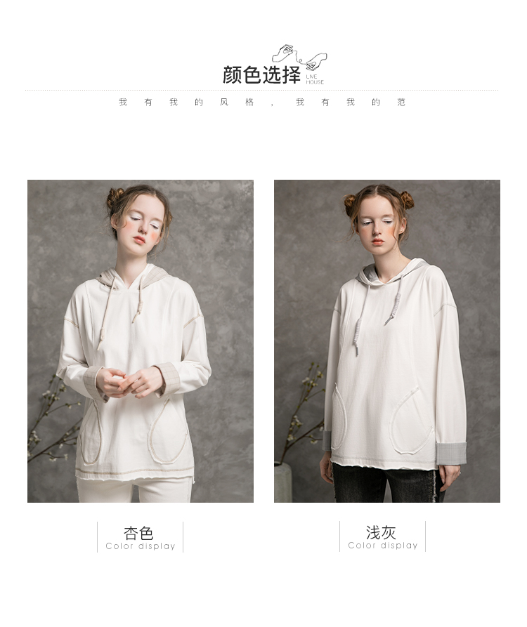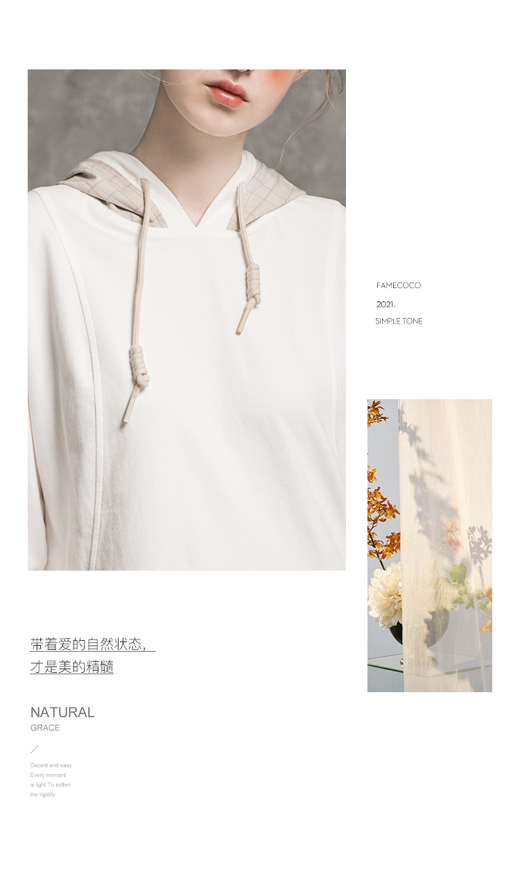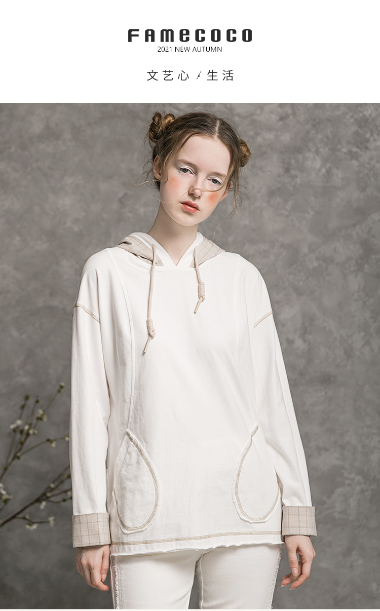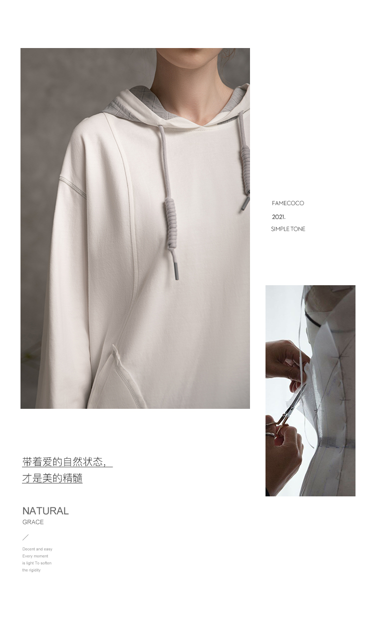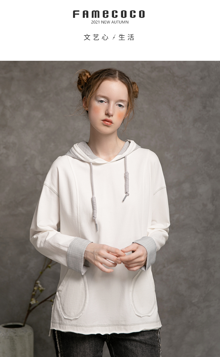 famecoco范可儿秋季连帽卫衣女纯棉长袖设计感宽松灰色上衣D216BL300