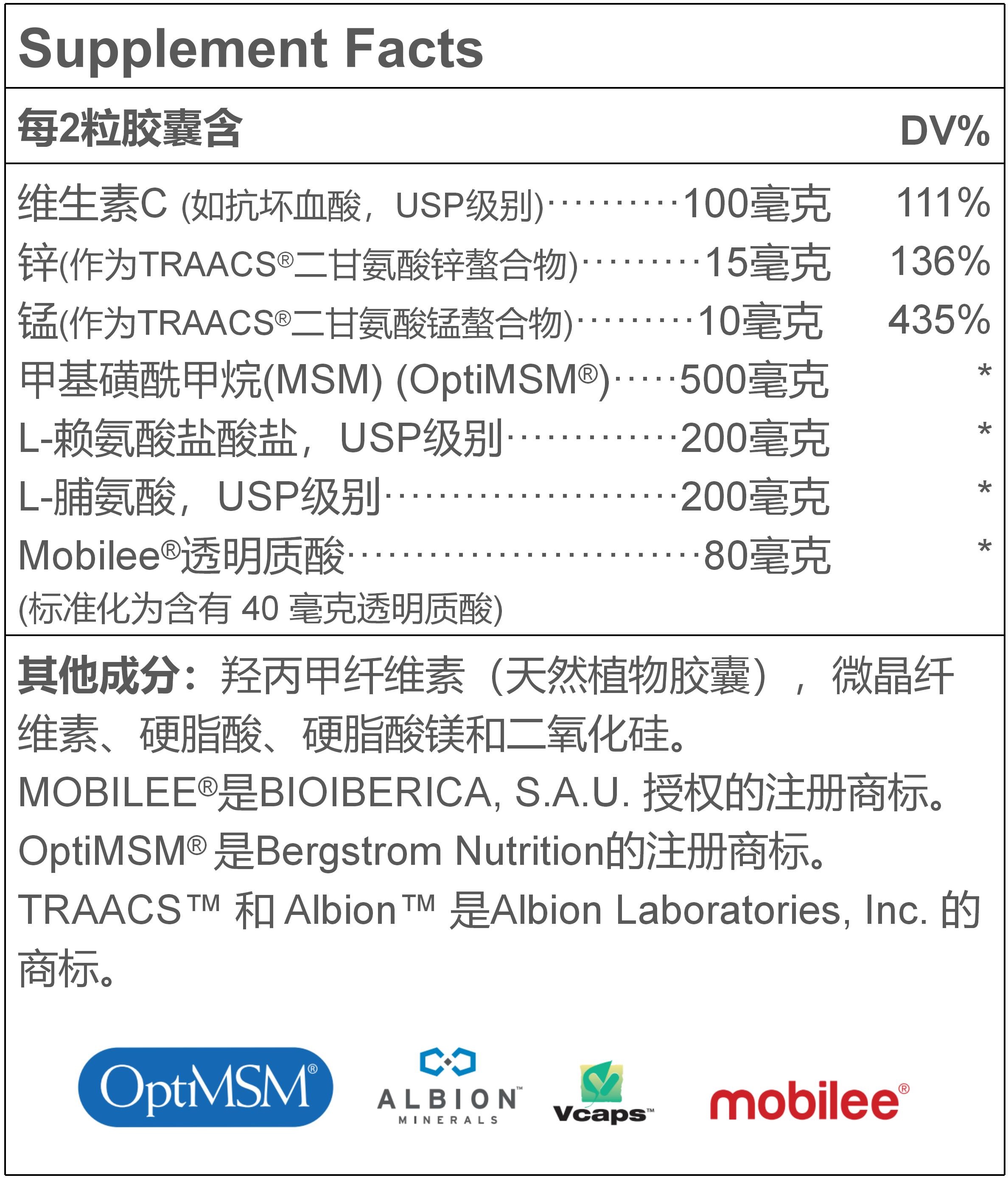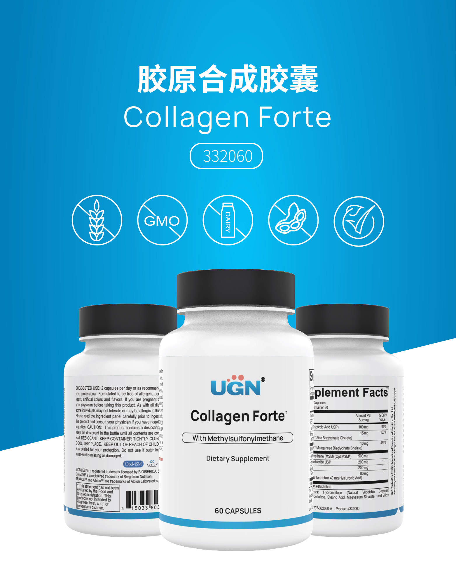 Collagen Forte(胶原合成胶囊)含有专利透明质酸和几种合成胶原蛋白的关键营养素:甲基磺酰甲烷(MSM)、维生素C、锌、 锰、L-赖氨酸和L-脯氨酸,主要用于支持体内胶原蛋白的合成。