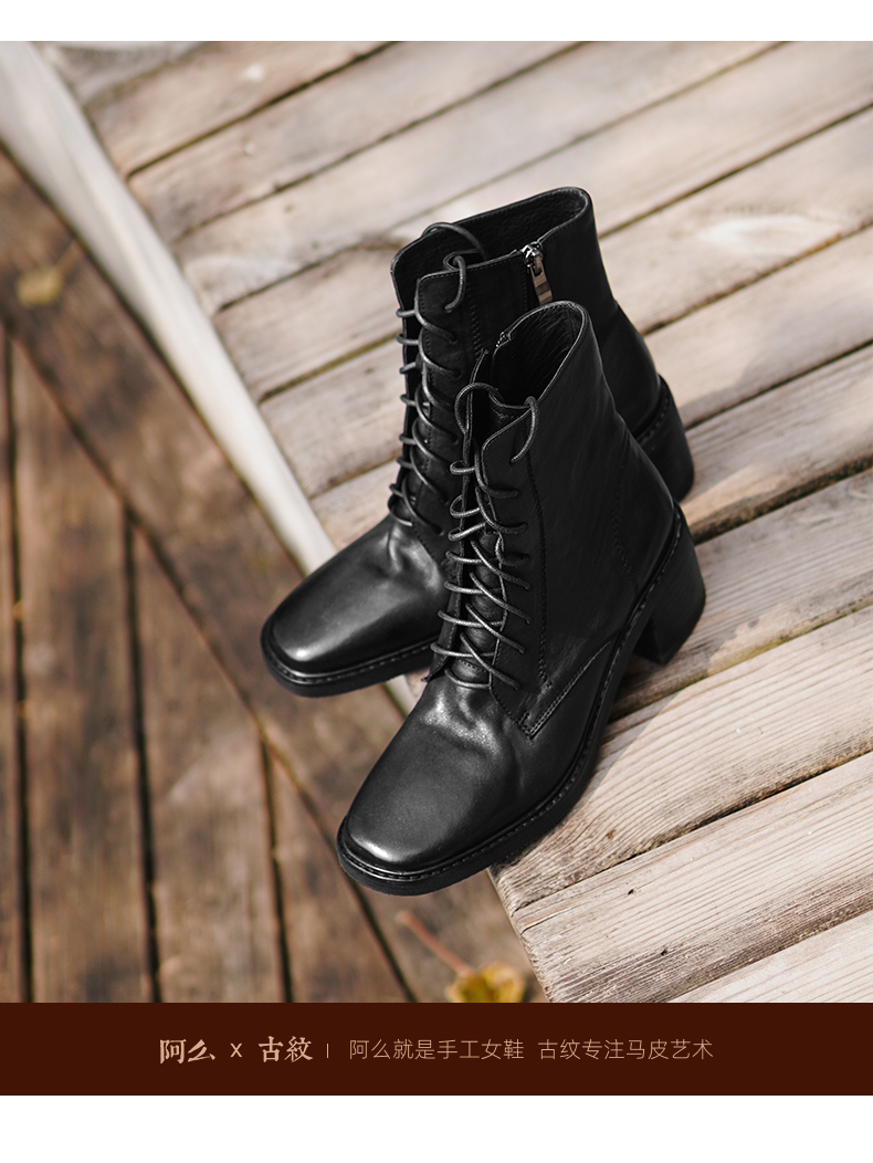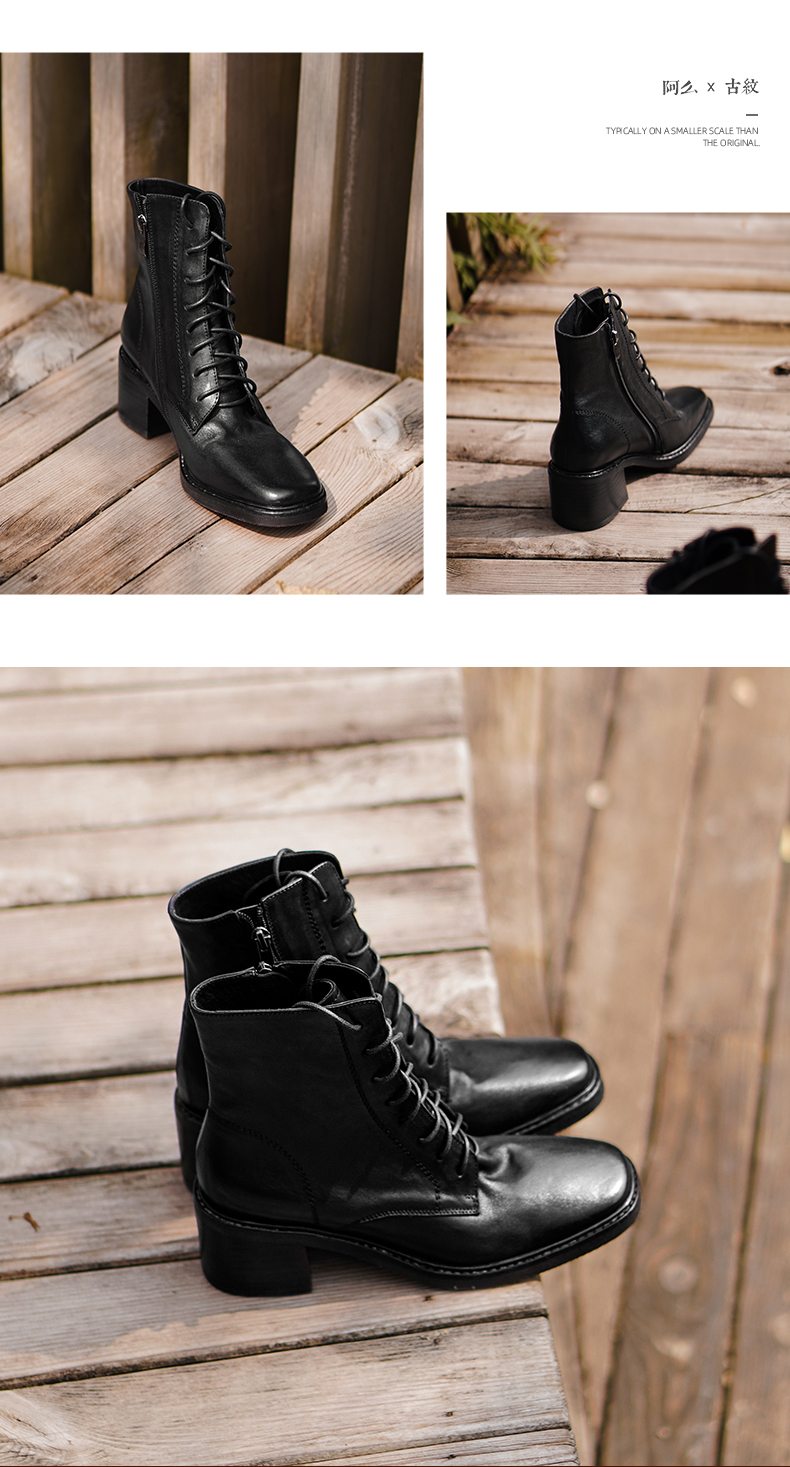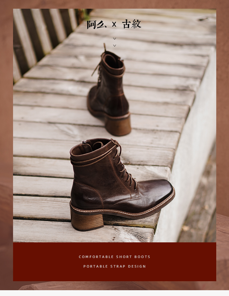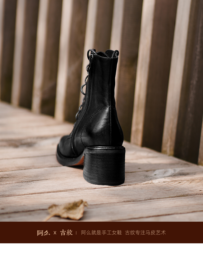 【阿么古纹马皮鞋】复古雅丹风绑带高跟短靴6CM英伦风职业时装靴女