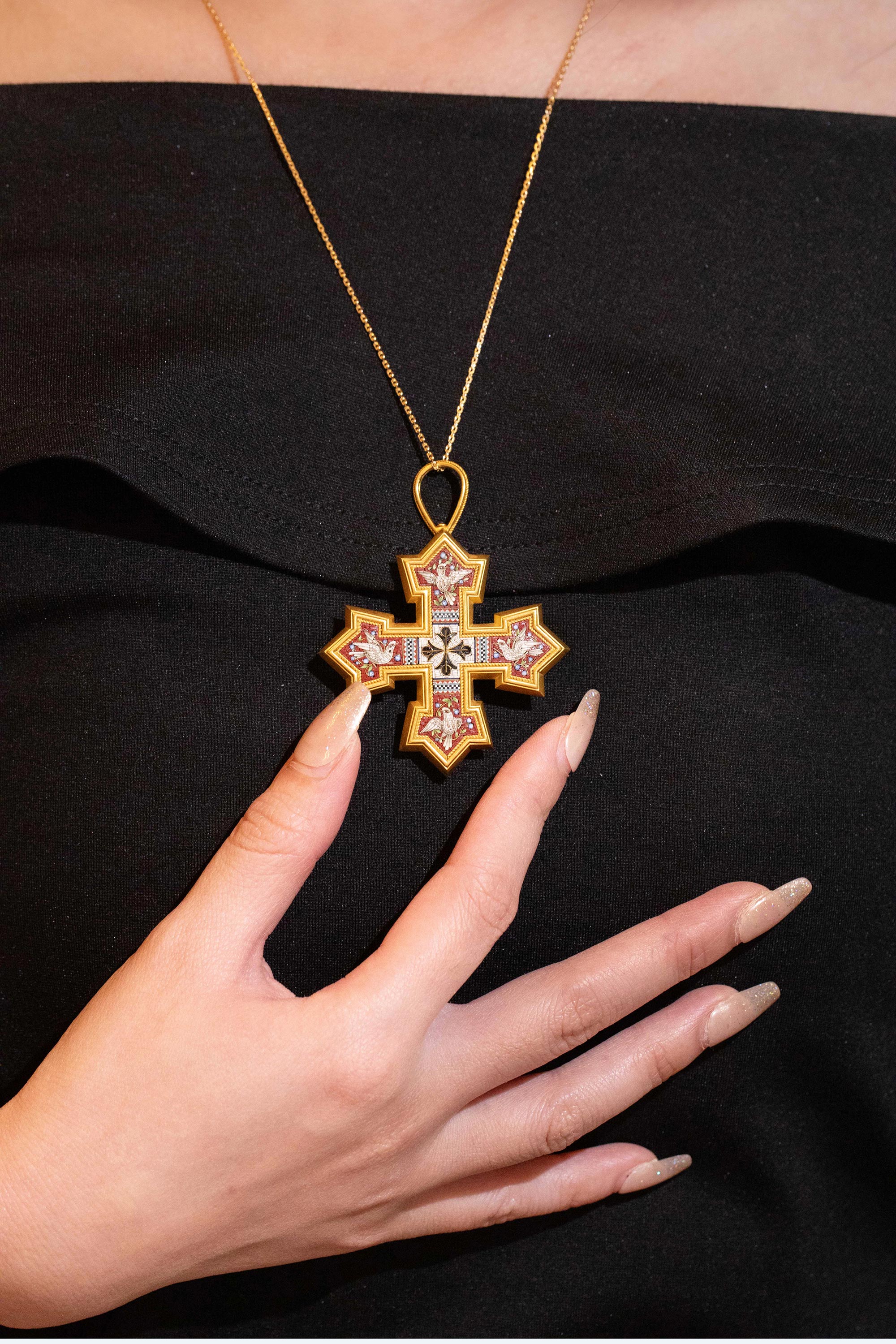 19世纪中期法国出品18K黄金精雕镶嵌鲜花与飞鸽主题极细马赛克吊坠/胸针