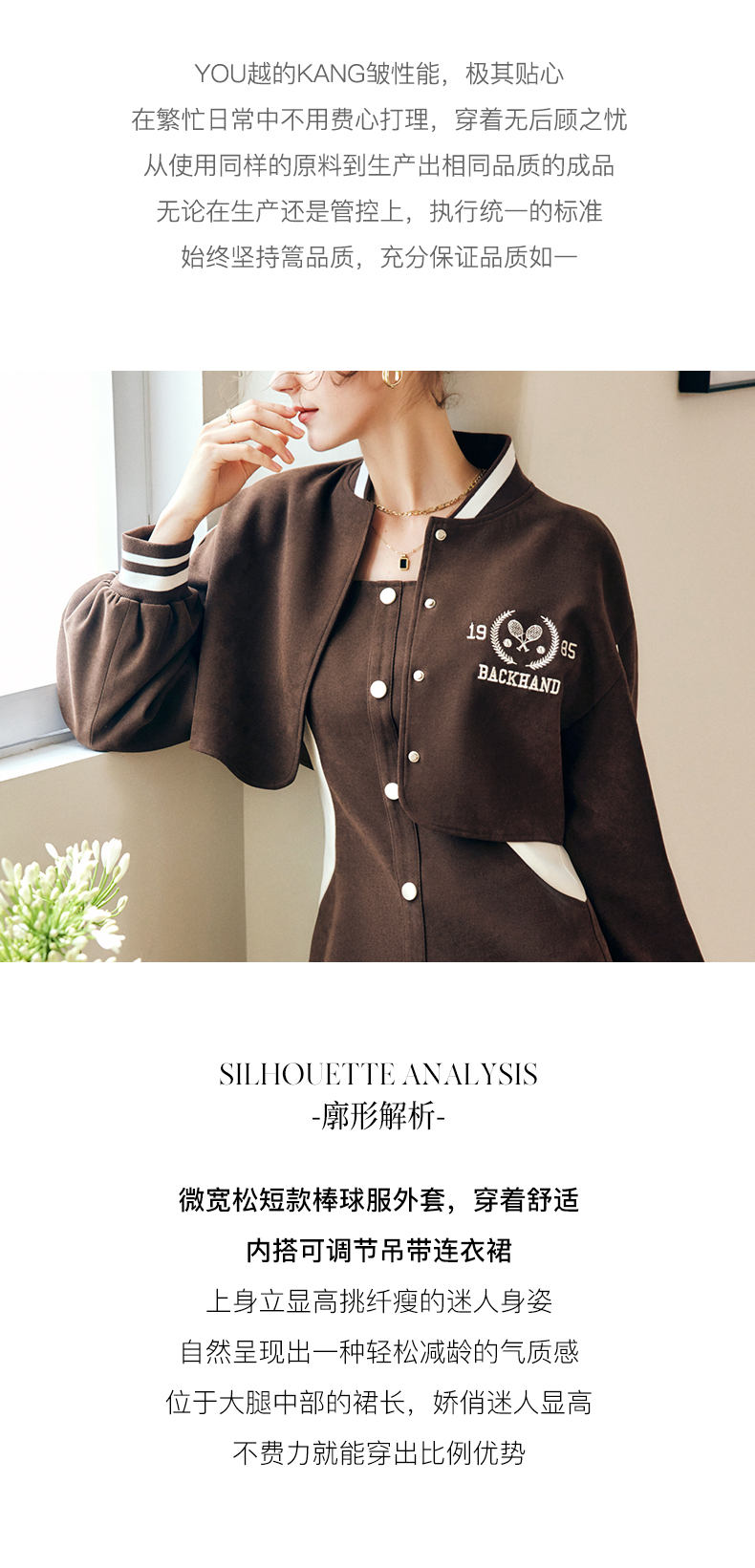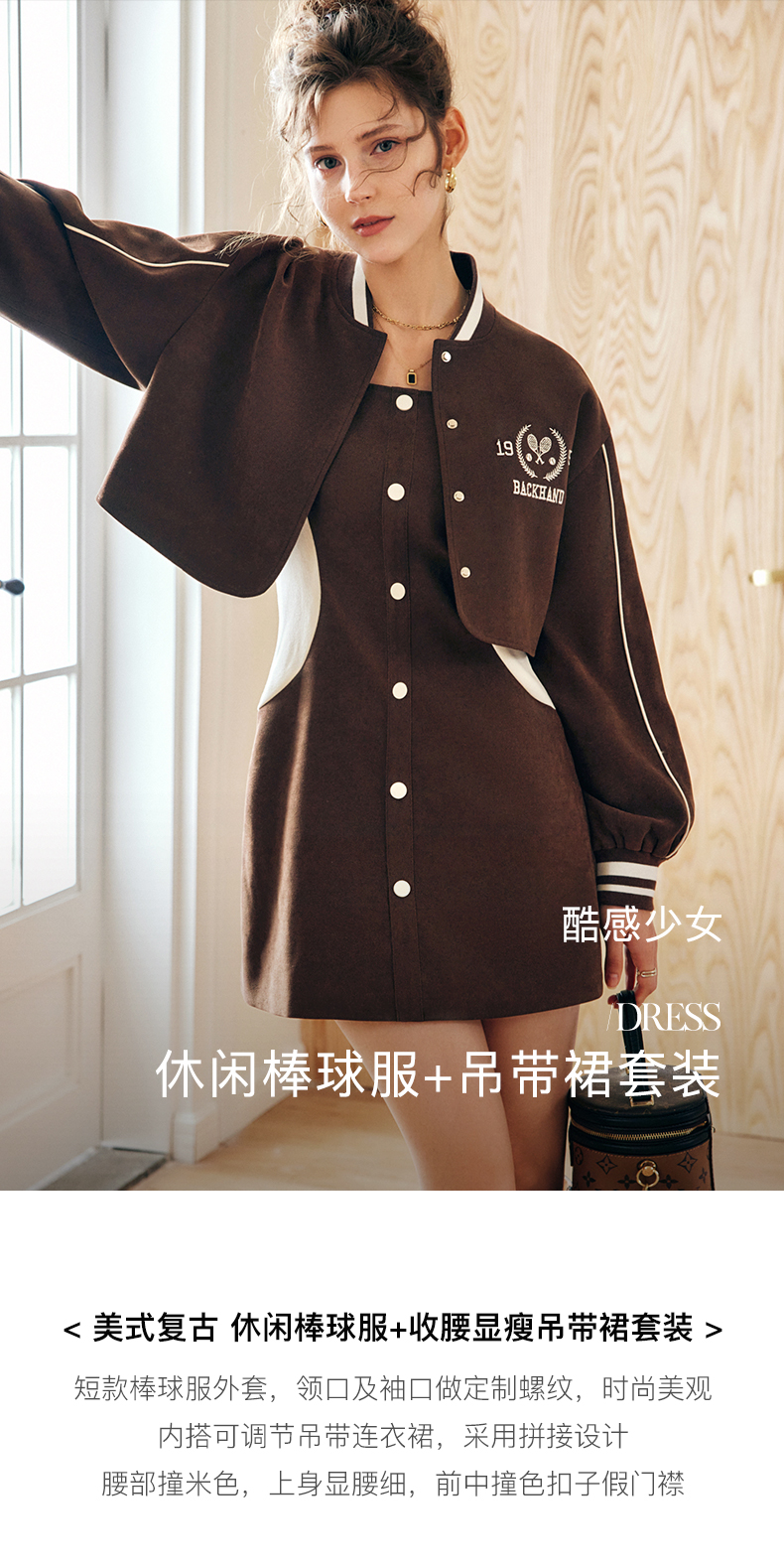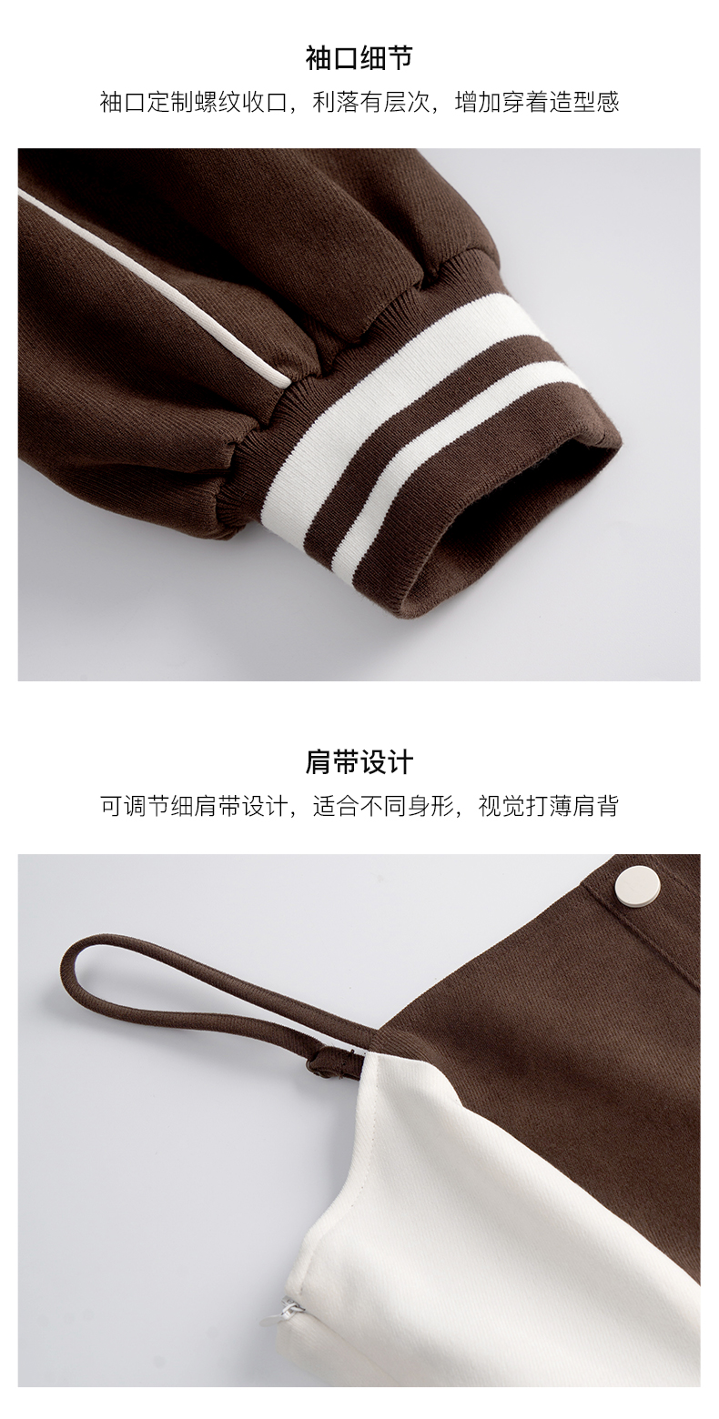 OLrain法式咖色时尚套装女早秋2022年新款美式棒球服吊带裙两件套