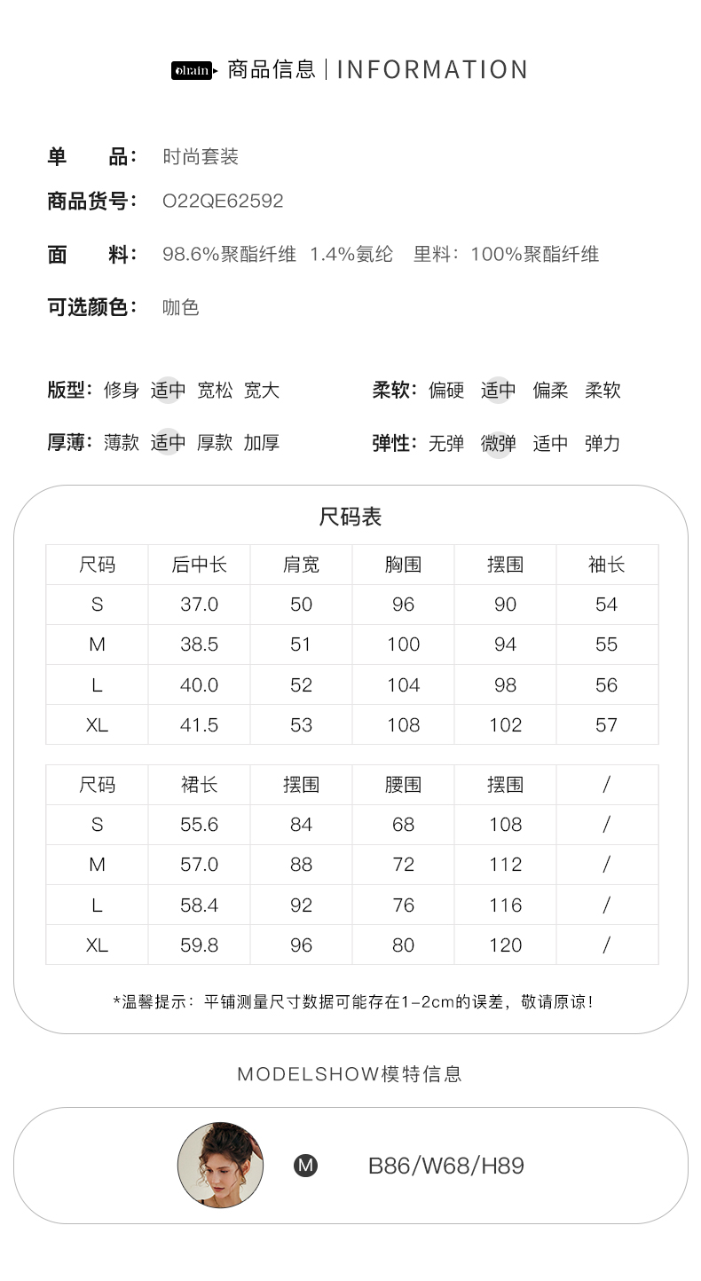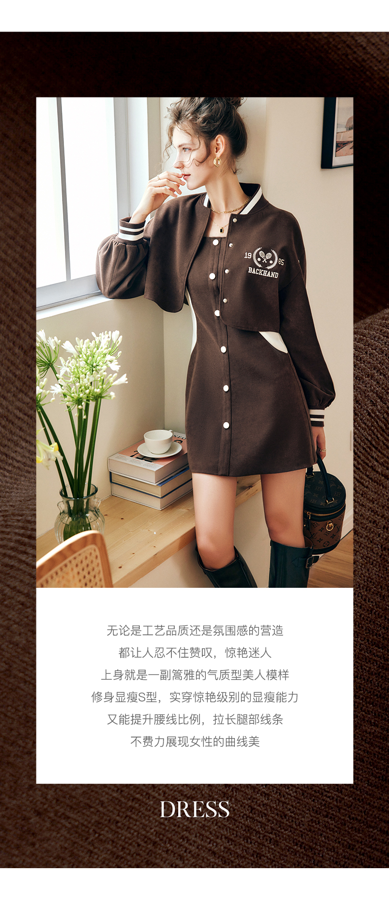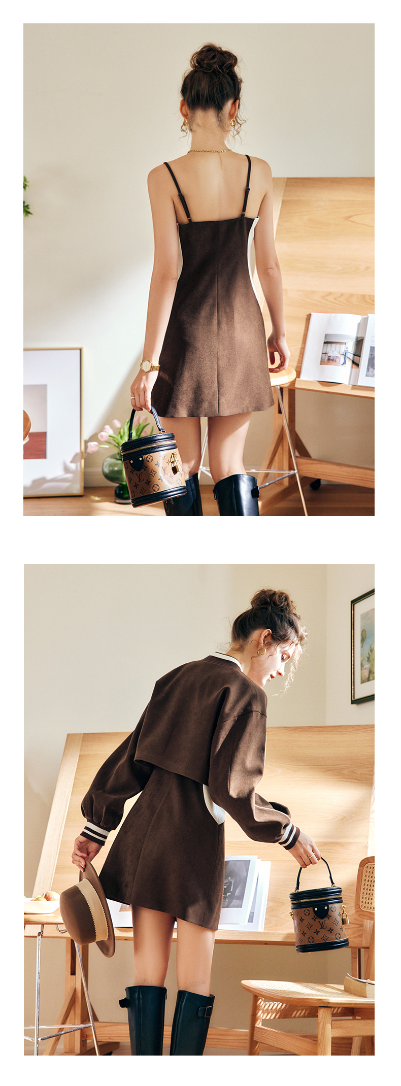 OLrain法式咖色时尚套装女早秋2022年新款美式棒球服吊带裙两件套