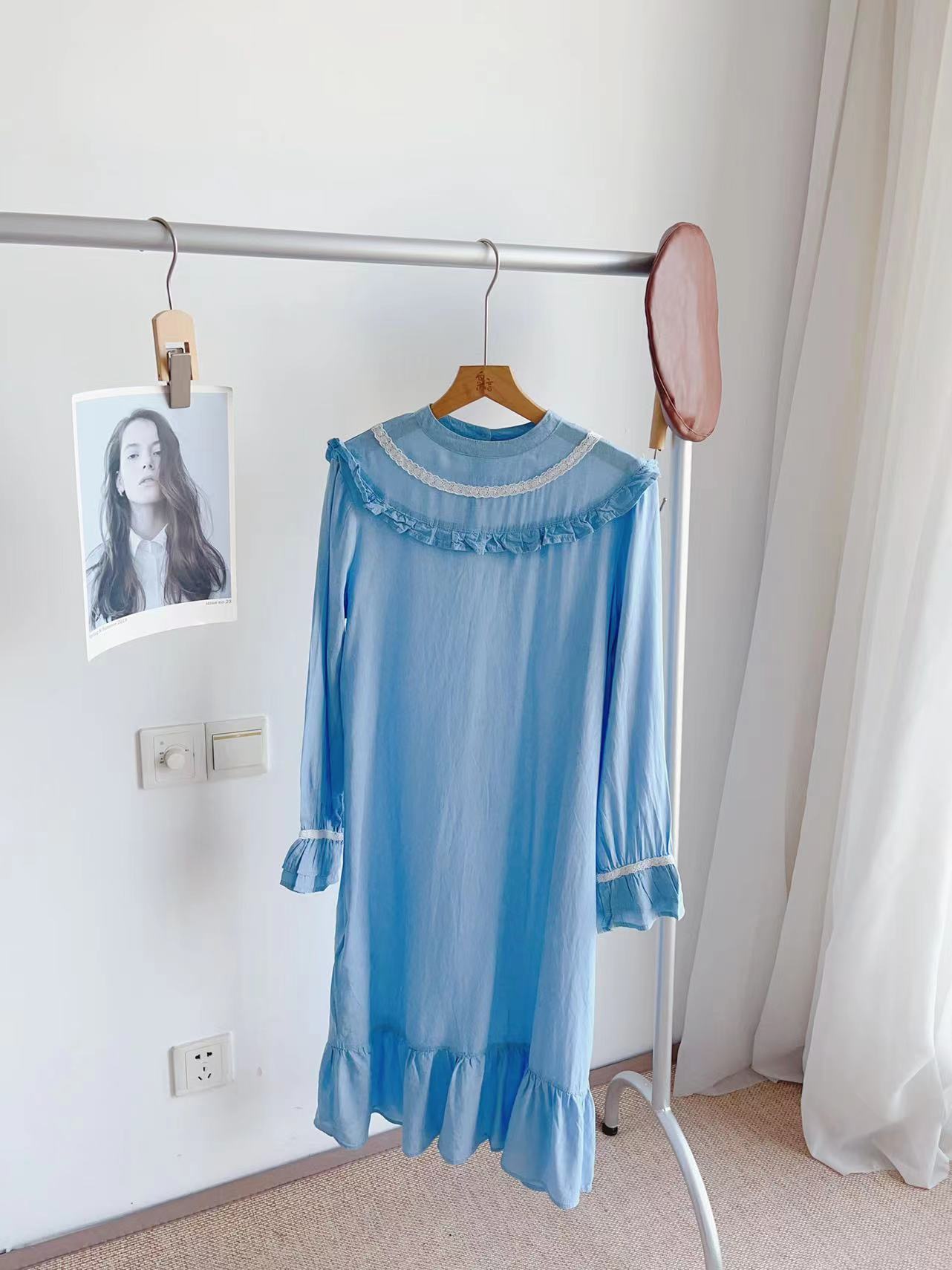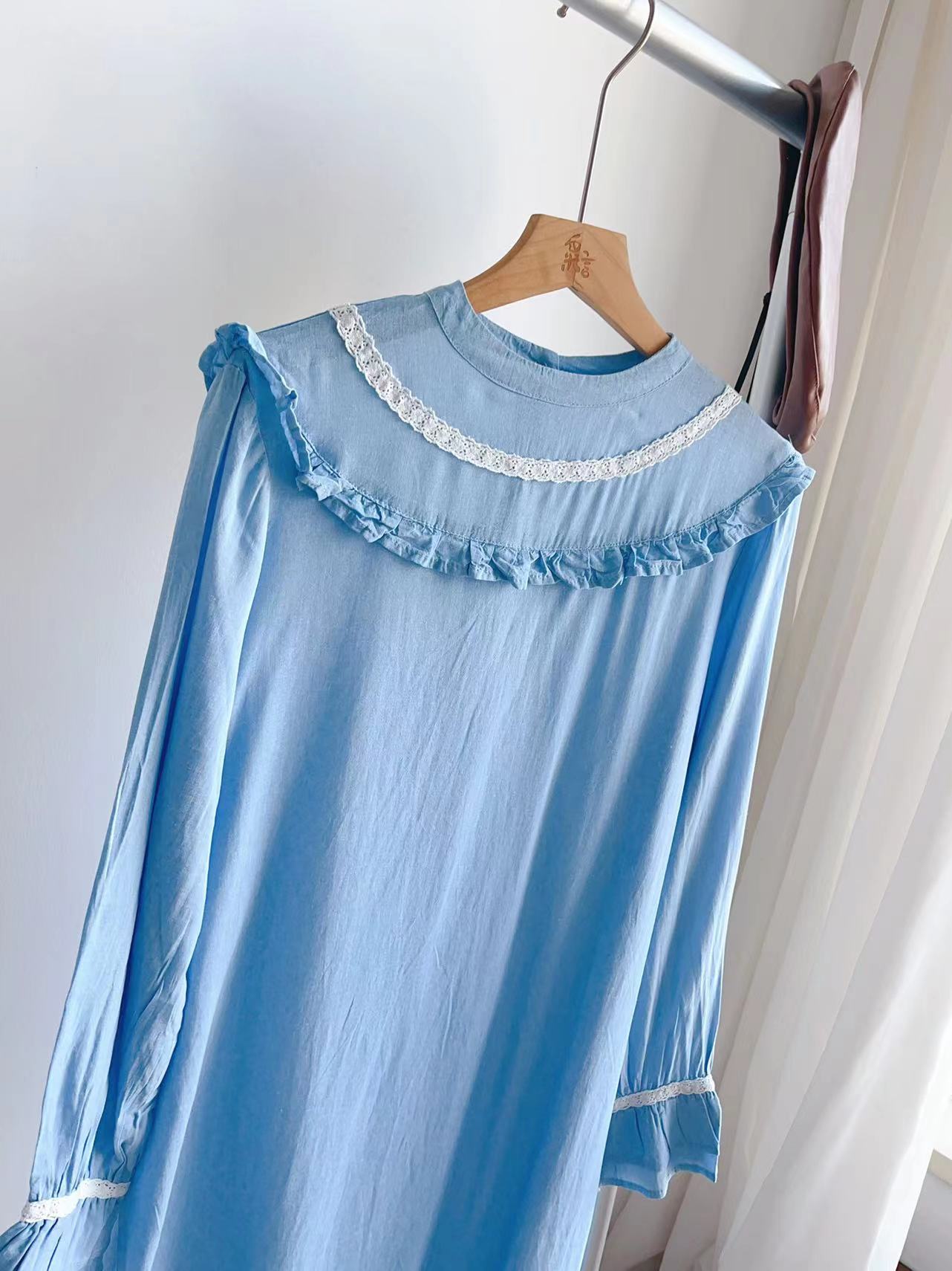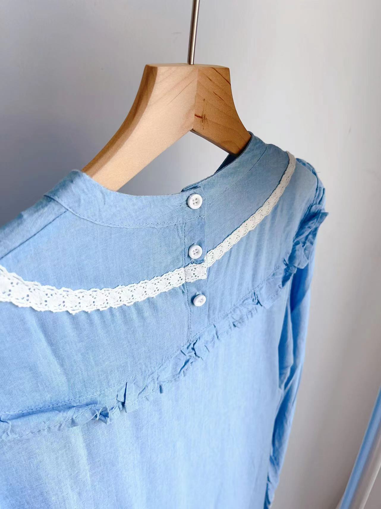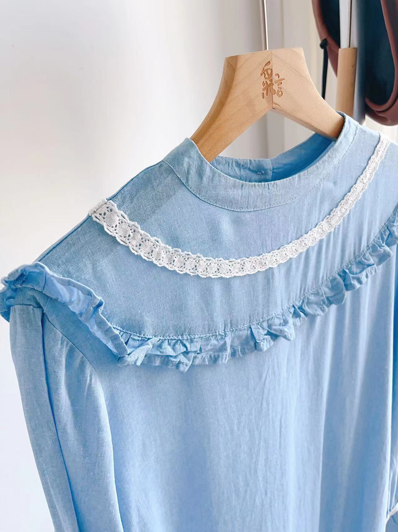这个天空海盐蓝,治愈极了。感叹怎么那么好看?小立领的感觉,带一点点复古,一点点国风,很美,一点儿也不会过时,就是复古vintage的感觉了。秋天单穿很仙,搭配毛衣外套,也很美。