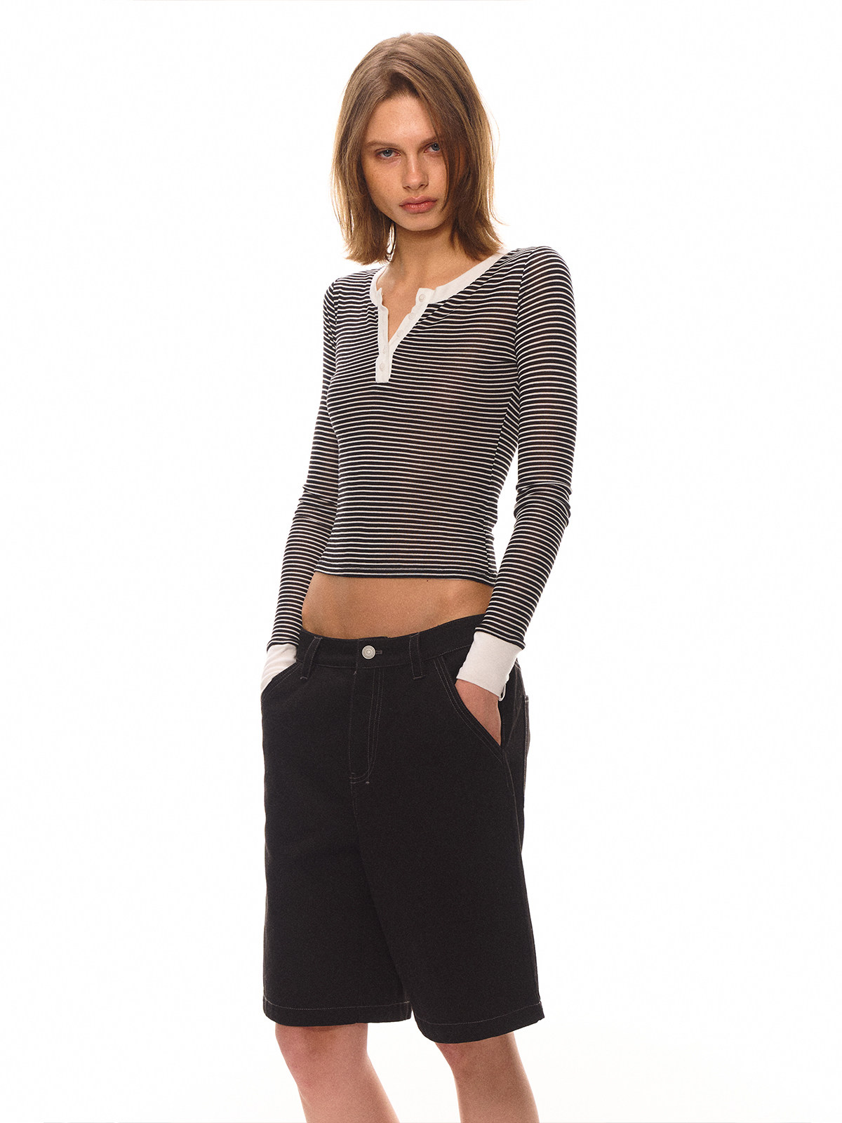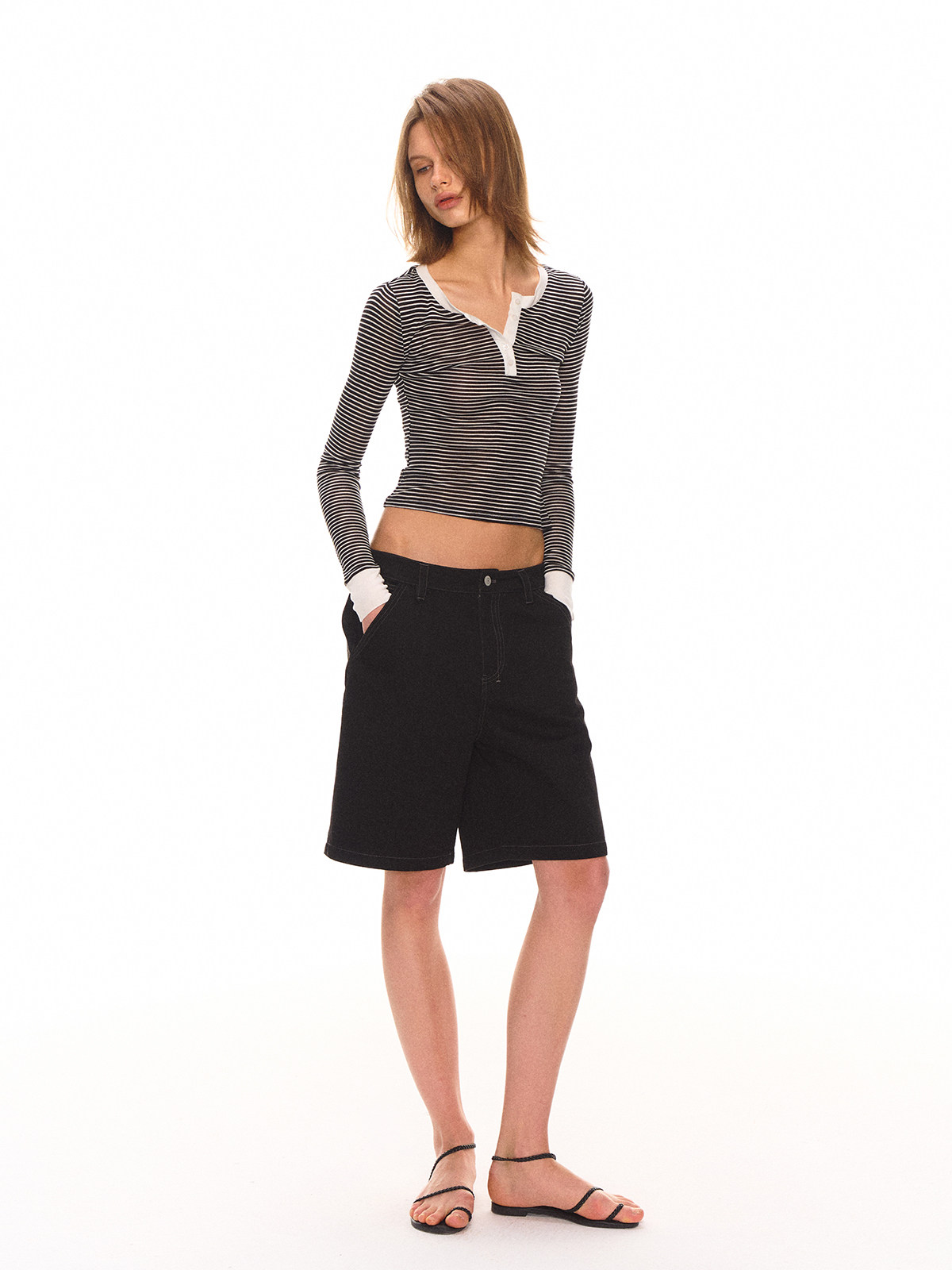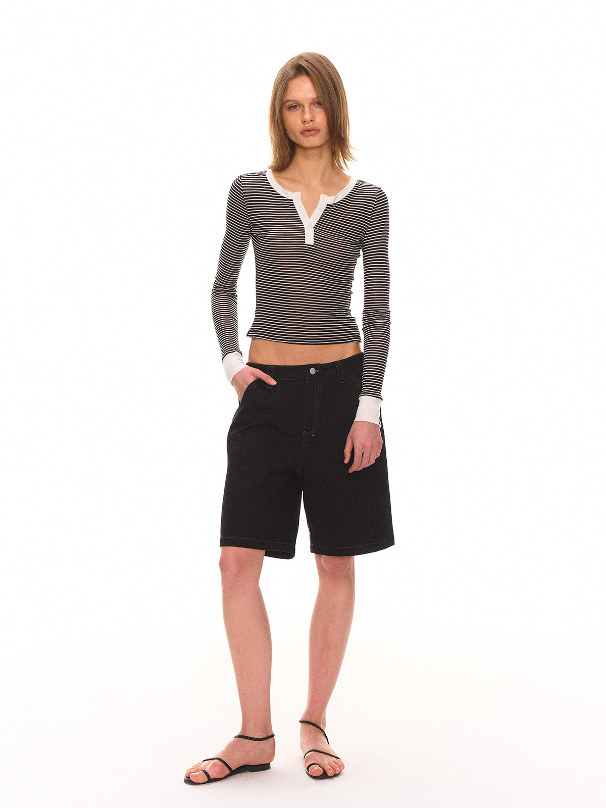 Evistub girls/E-6XCX1933/ 亨利领条纹长袖 天丝羊毛混纺修身正肩打底衫