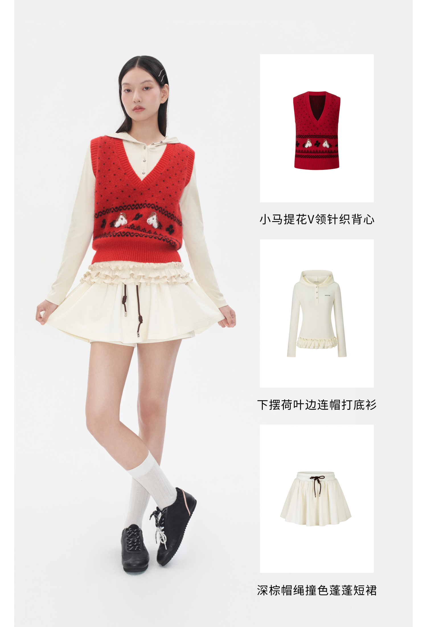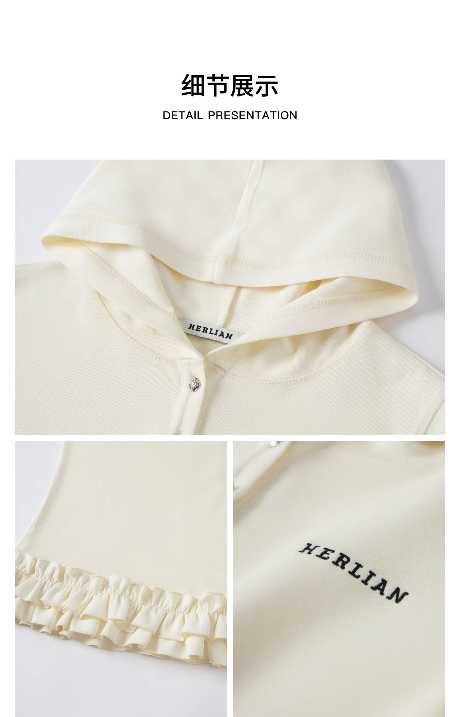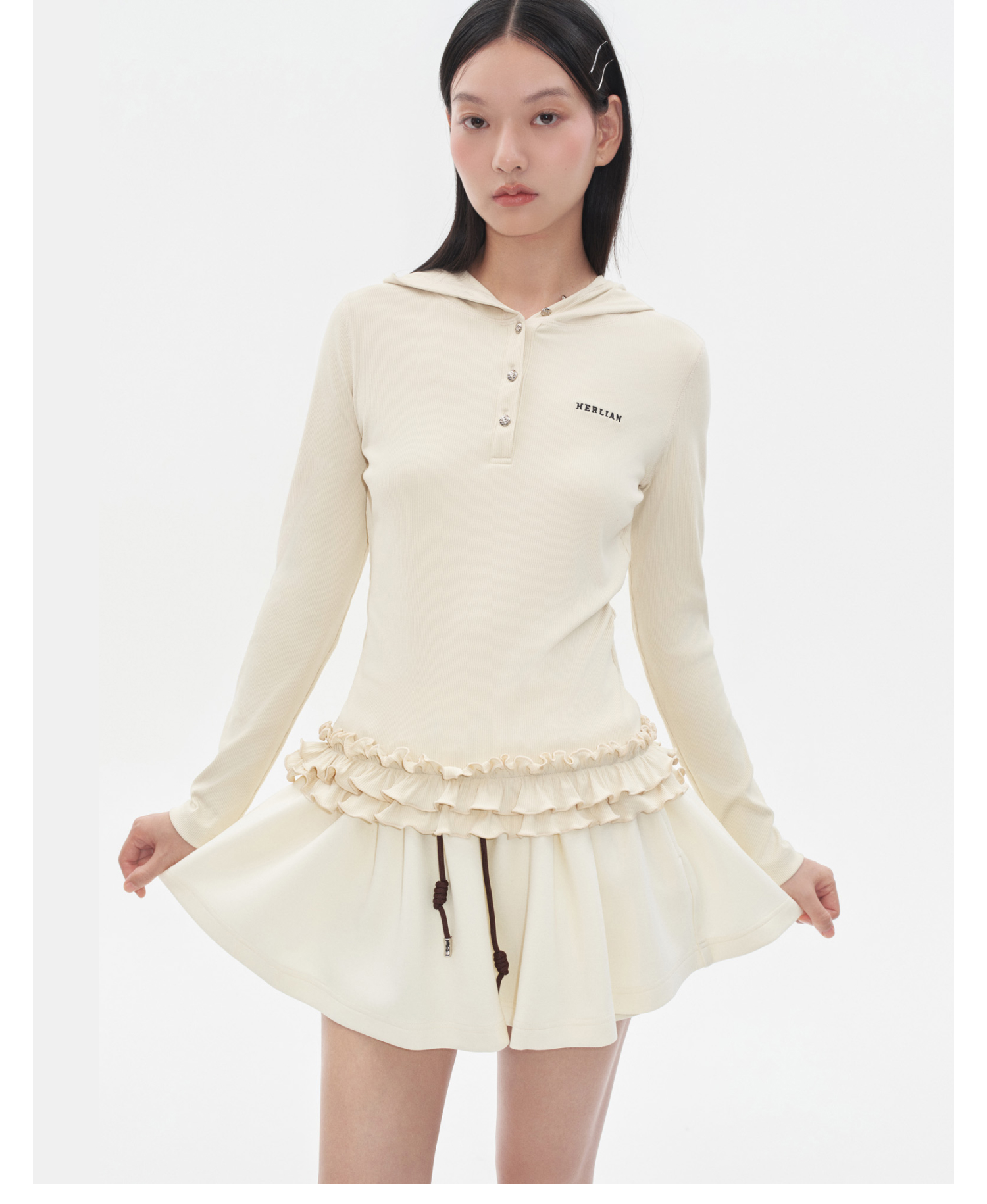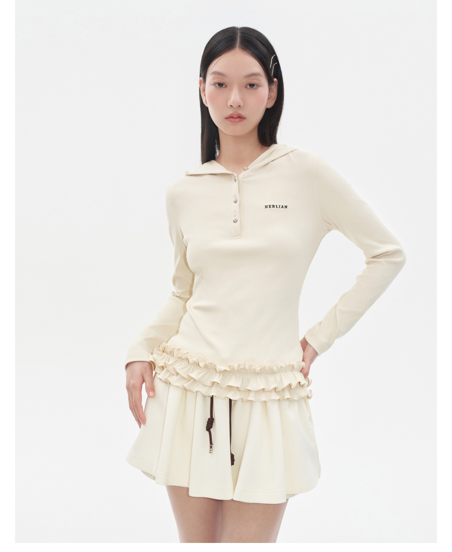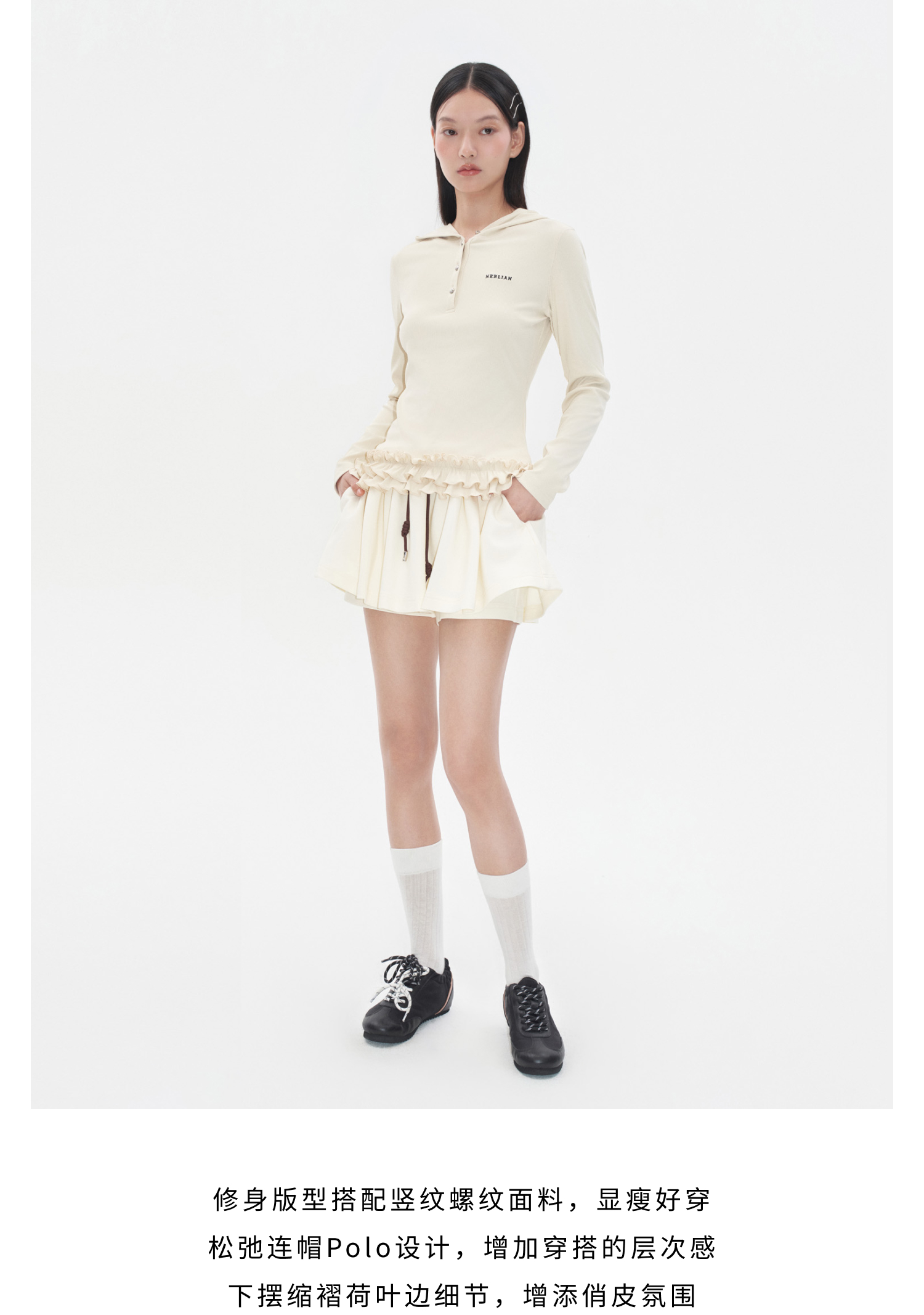 Herlian 2025冬季新品 下摆荷叶边连帽Polo打底衫女士