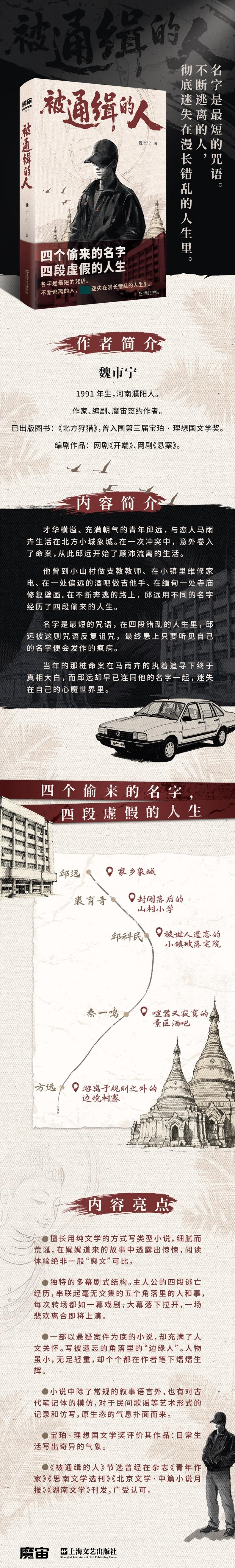 ★擅长用纯文学的方式写类型小说,细腻而荒诞,在娓娓道来的故事中透露出惊悚,阅读体验绝非一般“爽文”可比。 ★独特的多幕剧式结构。主人公的四段逃亡经历,串联起毫无交集的五个角落里的人和事,分别是:邱远的家乡象城、封闭落后的山村小学、被世人遗忘的小镇破落宅院、喧嚣又寂寞的景区酒吧、游离于规则之外的边境村寨。每次转场都如一幕戏剧,联成一体时又毫无割裂之感。每次大幕落下又拉开,一场悲欢离合即将上演。 ★一部以悬疑案件为底的小说,却充满了人文关怀。主人公四段逃亡经历中所遇到的人,都是被遗忘的角落里的“边缘人”。人物虽小,无足轻重,却个个都在作者笔下熠熠生辉。 ★小说中除了常规的叙事语言外,也有对古代笔记体的模仿,对于民间歌谣等艺术形式的记录和仿写,原生态的气息扑面而来。 ★宝珀•理想国文学奖评价其作品:日常生活写出奇异的气象。 ★《被通缉的人》节选曾经在杂志《青年作家》《思南文学选刊》《北京文学•中篇小说月报》《湖南文学》刊发,广受认可。