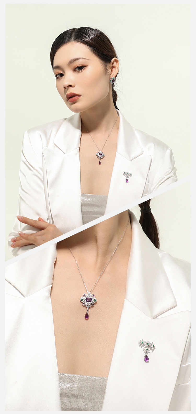【花园】JULEE JULEE茱俪珠宝 18K白金紫晶祖母绿白蓝宝 钻石胸针/吊坠两用款