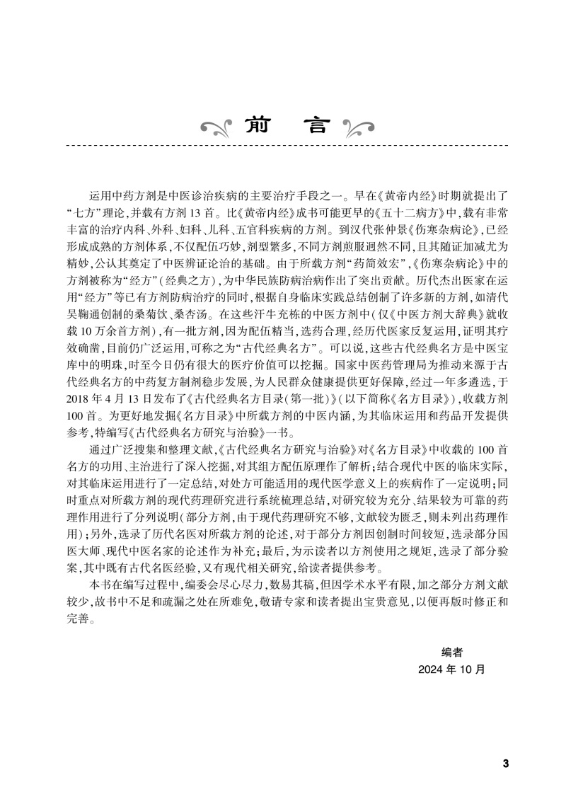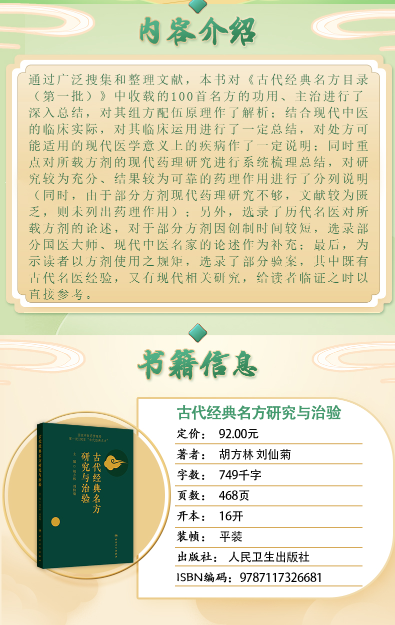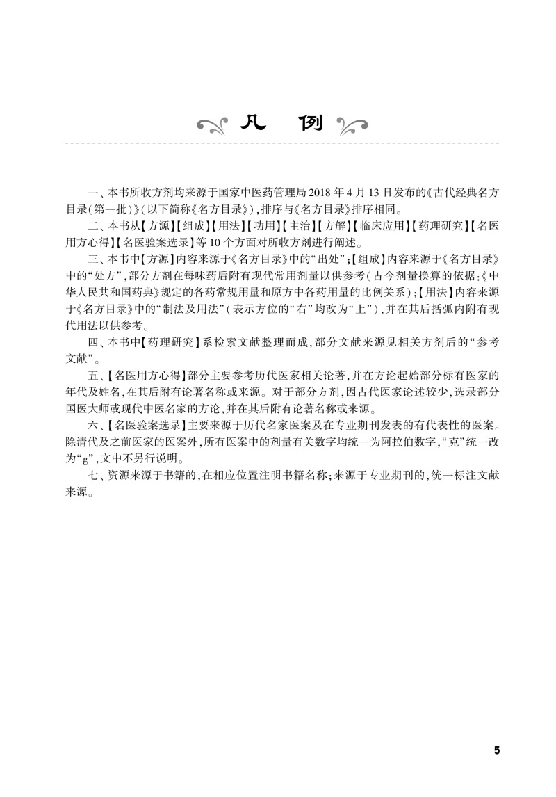 通过广泛搜集和整理文献,本书对《古代经典名方目录(**批)》中收载的100首名方的功用、主治进行了深入总结,对其组方配伍原理作了解析;结合现代中医的临床实际,对其临床运用进行了一定总结,对处方可能适用的现代医学意义上的疾病作了一定说明;同时重点对所载方剂的现代药理研究进行系统梳理总结,对研究较为充分、结果较为可靠的药理作用进行了分列说明(同时,由于部分方剂现代药理研究不够,文献较为匮乏,则未列出药理作用);另外,选录了历代名医对所载方剂的论述,对于部分方剂因创制时间较短,选录部分国医大师、现代中医名家的论述作为补充;最后,为示读者以方剂使用之规矩,选录了部分验案,其中既有古代名医经验,又有现代相关研究,给读者临证之时以直接参考。