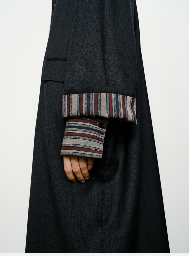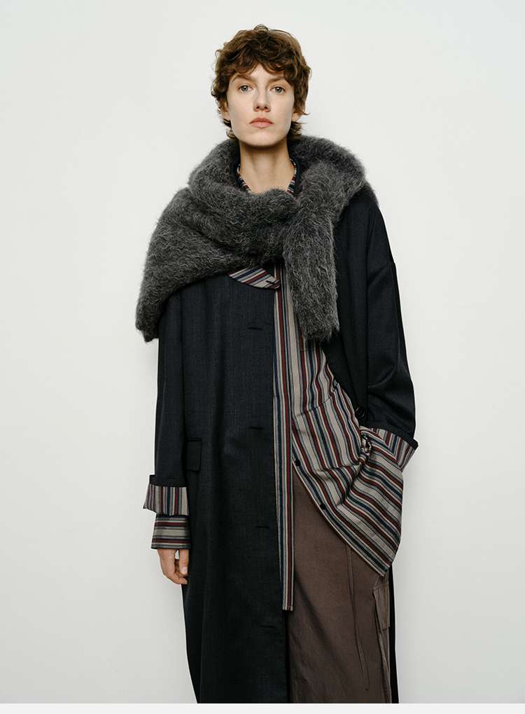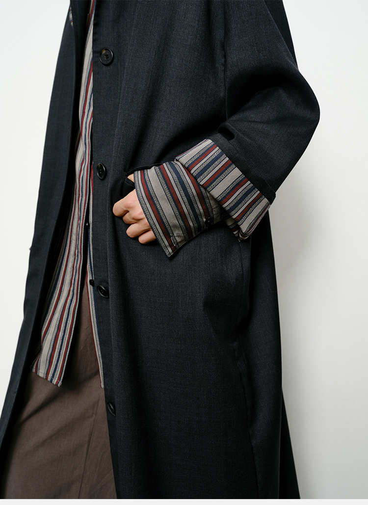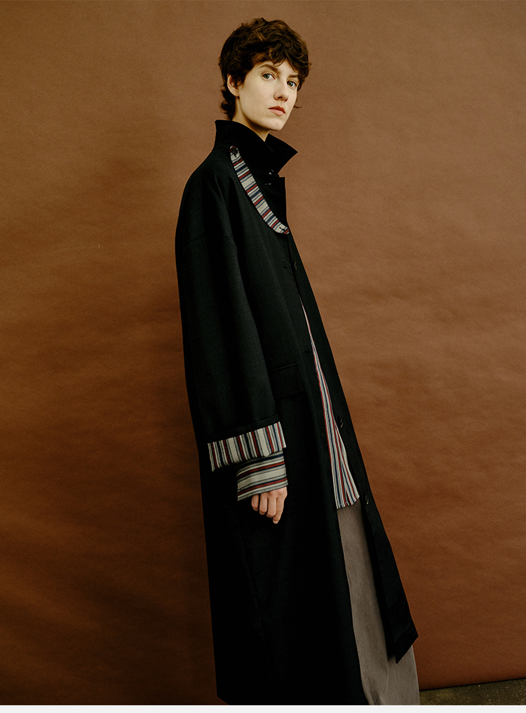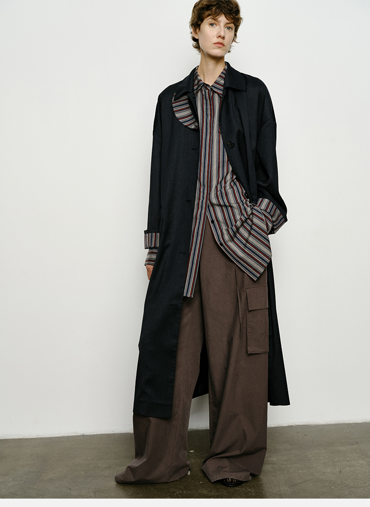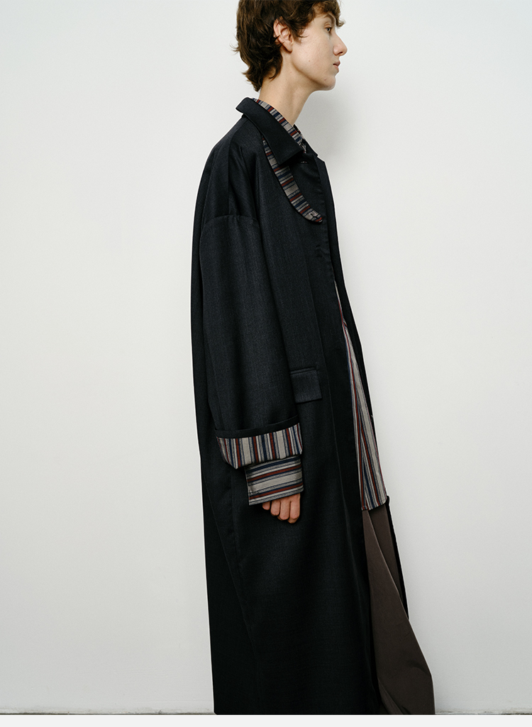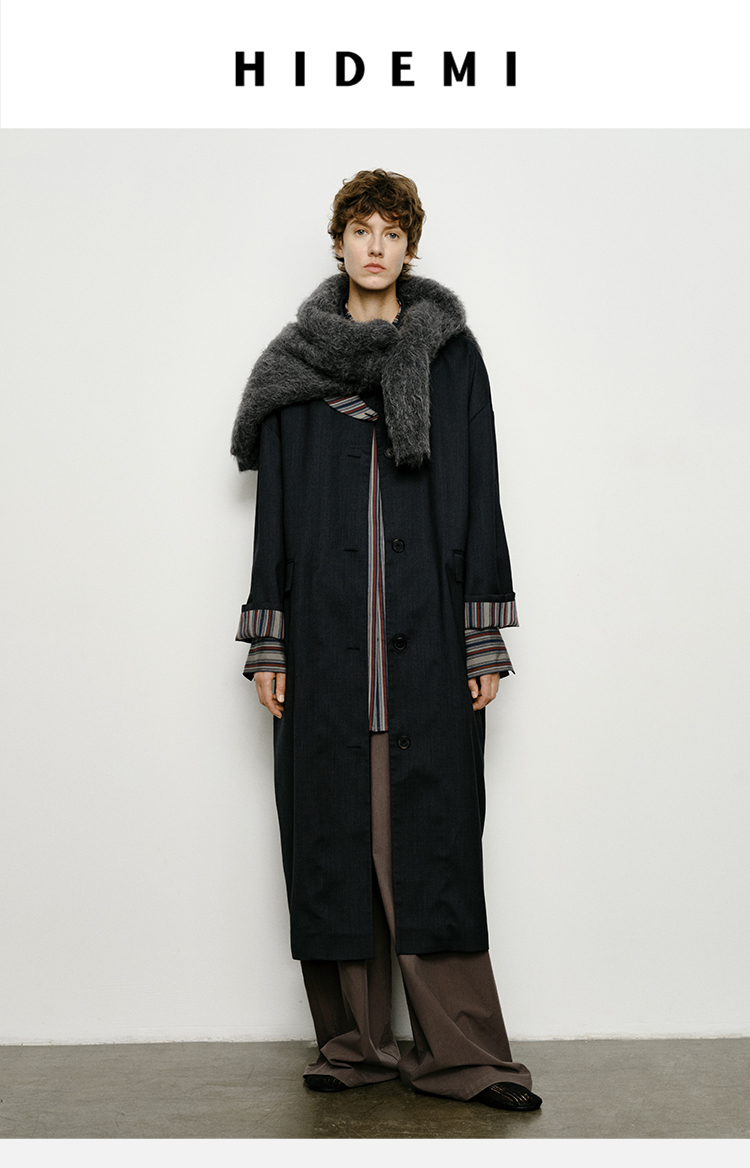 HIDEMI 精纺羊毛廓形条纹翻边复古长款飘领设计感风衣