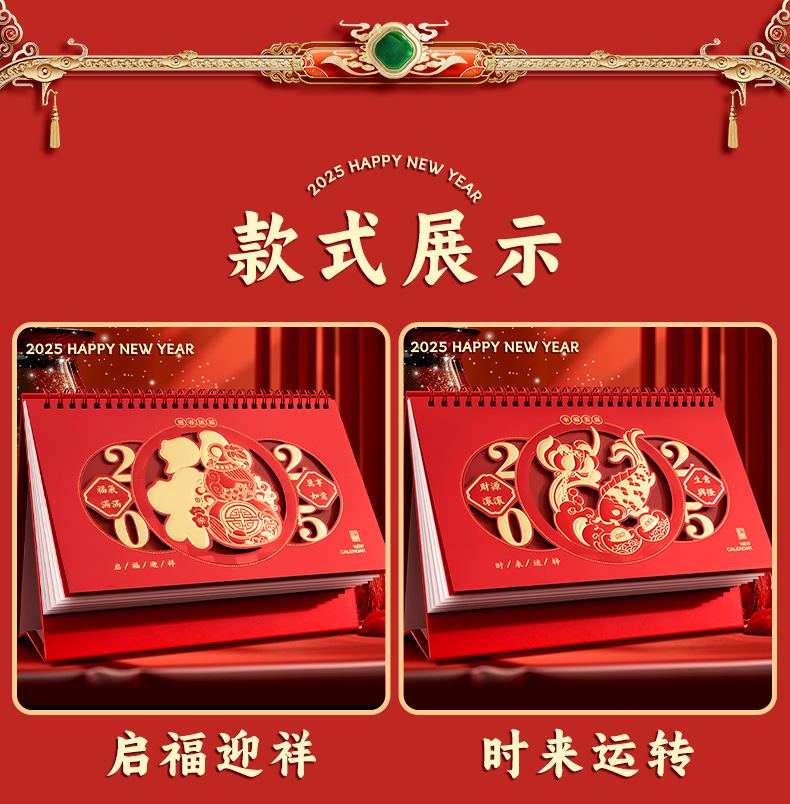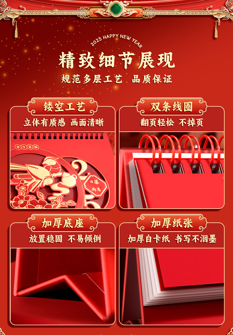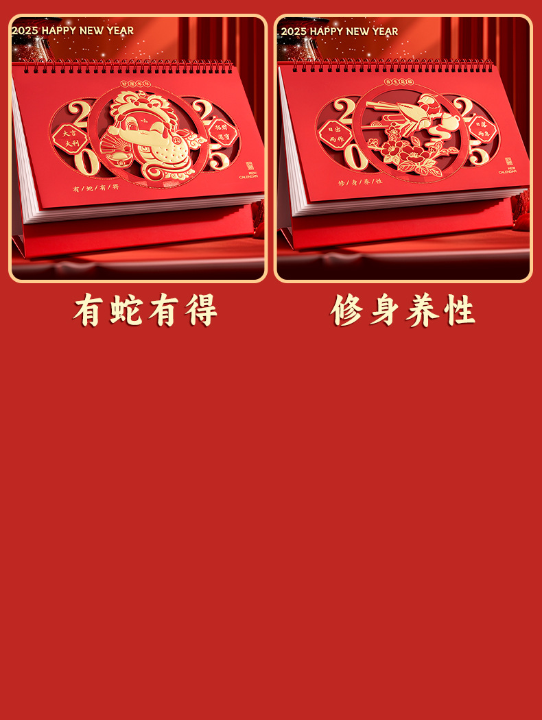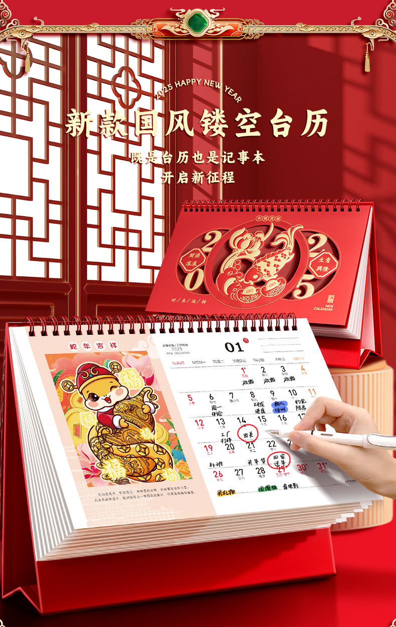 【既是台历也是记事本!开启新征程】2025年红色台历定制蛇年高端国潮中国风烫金镂空办公桌面日历月历。ry
