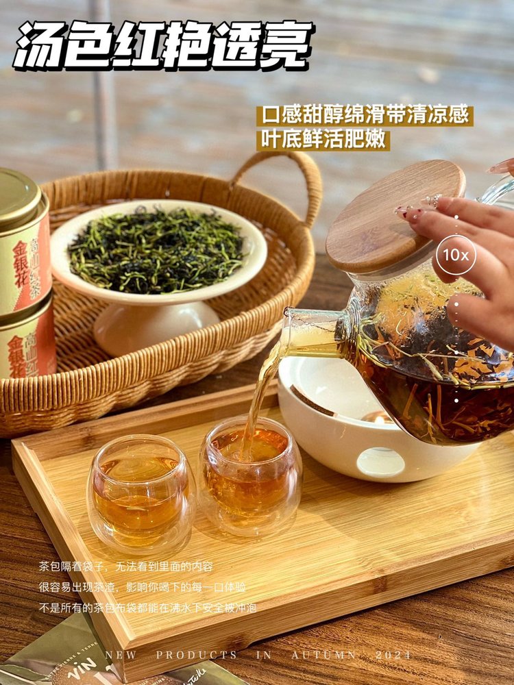 口感甜醇绵滑带清凉感经络清晰,无杂质,可见金银花和红茶交融,茶香四溢。