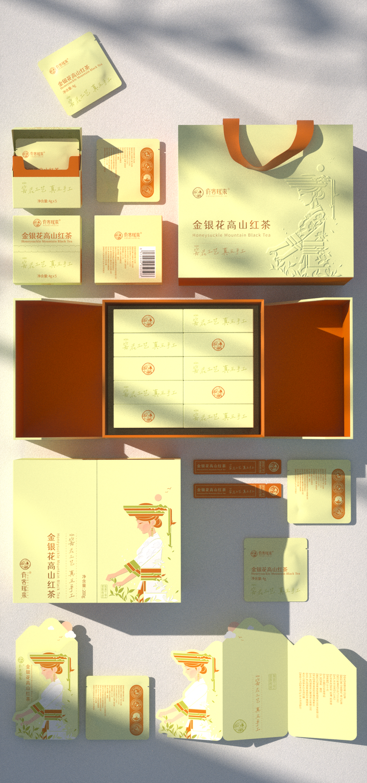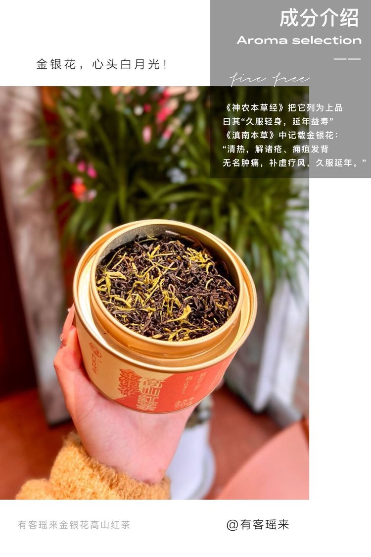 ♨金银花:高山红茶=2:8有茶,有花,有生活...茶引花香,花香茶骨...精选金银花和高山红茶经过科学配比,古法窨制。