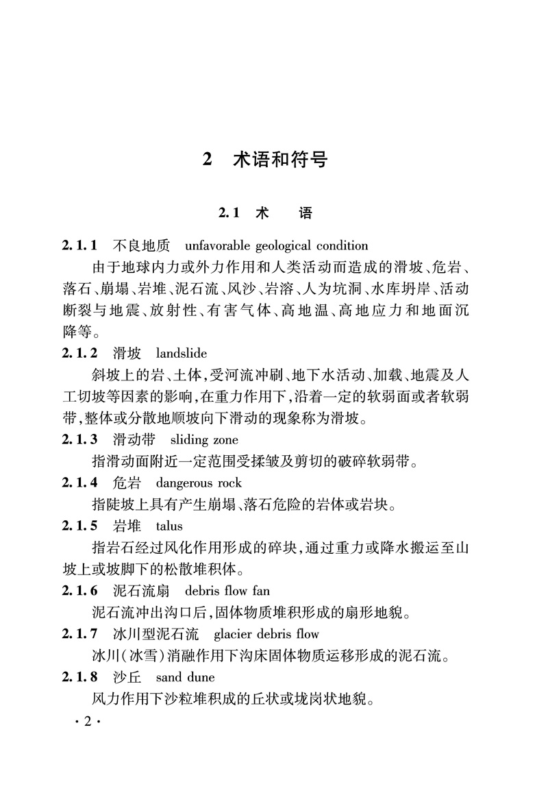 本规程共分17章,包括:总则,术语和符号,基本规定,滑坡,危岩、落石和崩塌,岩堆,泥石流,风沙,岩溶,人为坑洞,水库坍岸,活动断裂与地震,放射性,有害气体,高地温,高地应力,地面沉降等,另有8个附录。