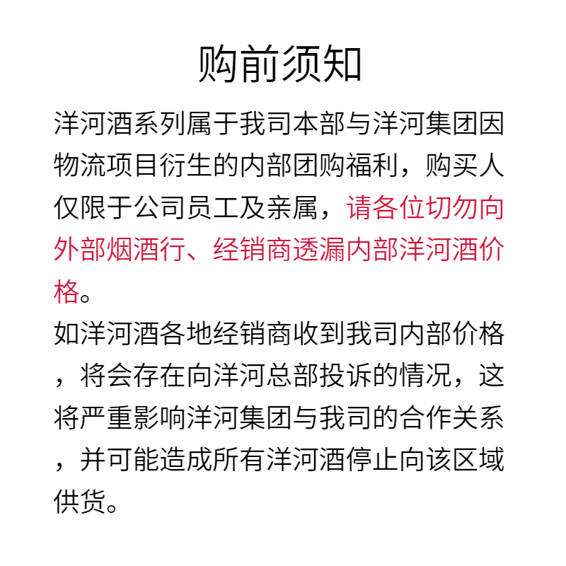 您以代售方的内部员工、合作客户、合作供应商等身份在本平台购买“洋河”系列酒已享受到特殊优惠,除经过代售方的特殊授权外,您不得以任何形式转售“洋河”系列酒。