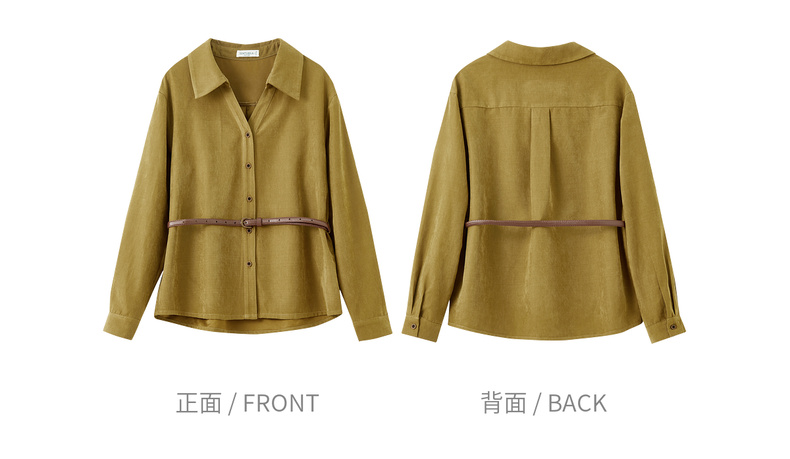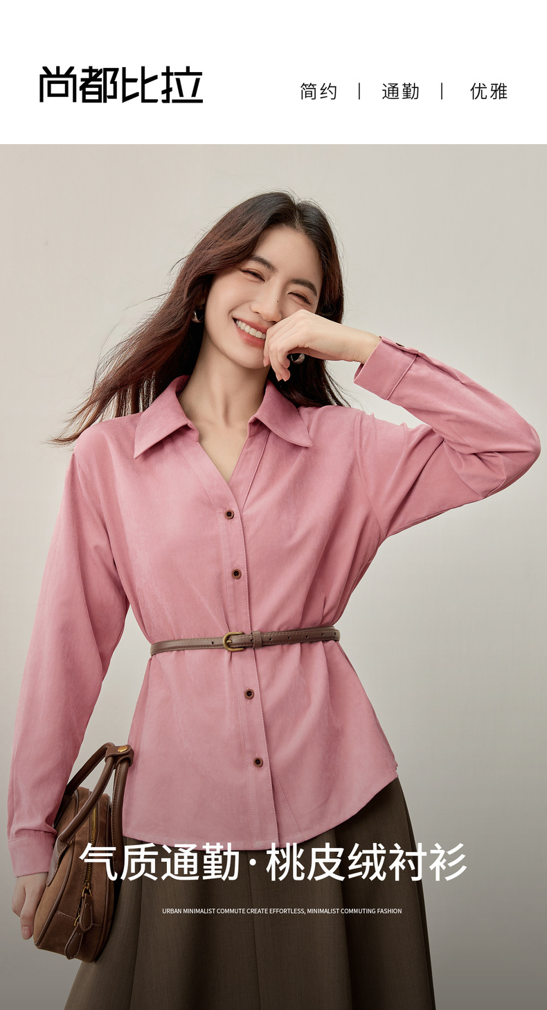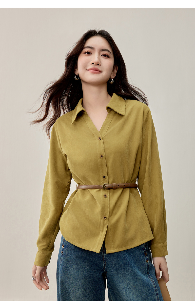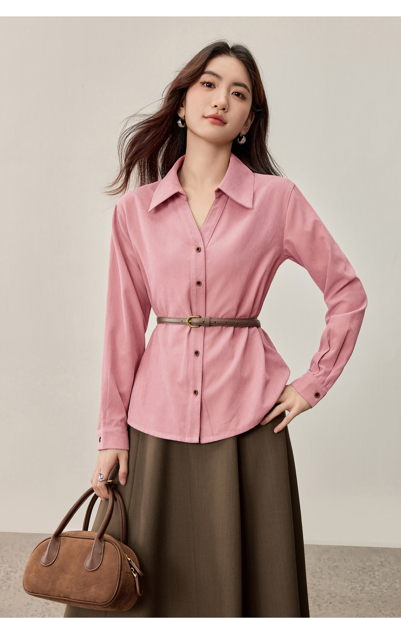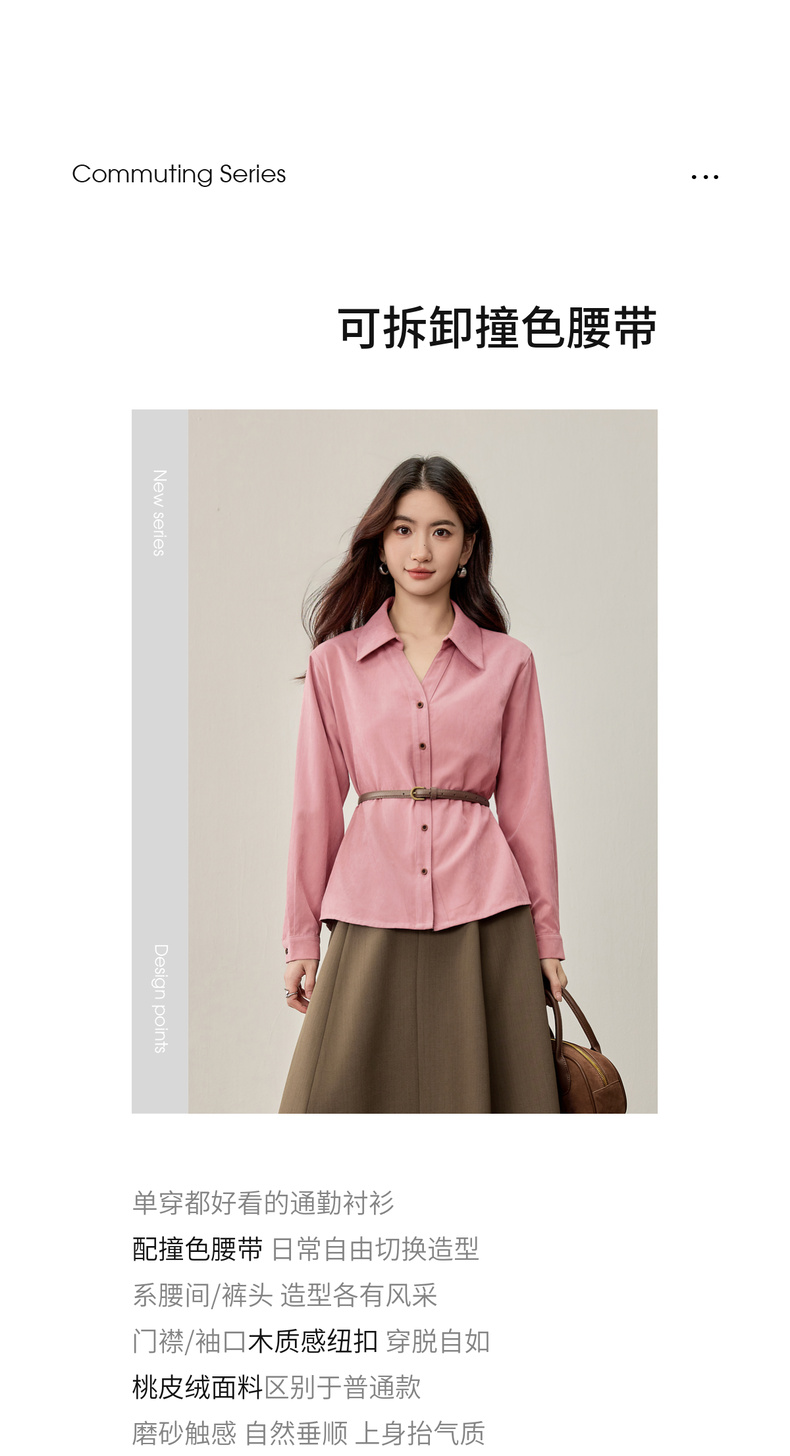 【内购】【撞色腰带】气质通勤V型翻领单排扣可拆卸腰带长袖桃皮绒衬衫-W53CA2862