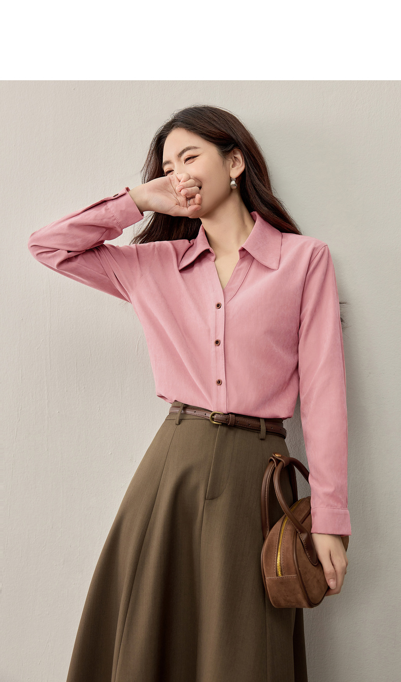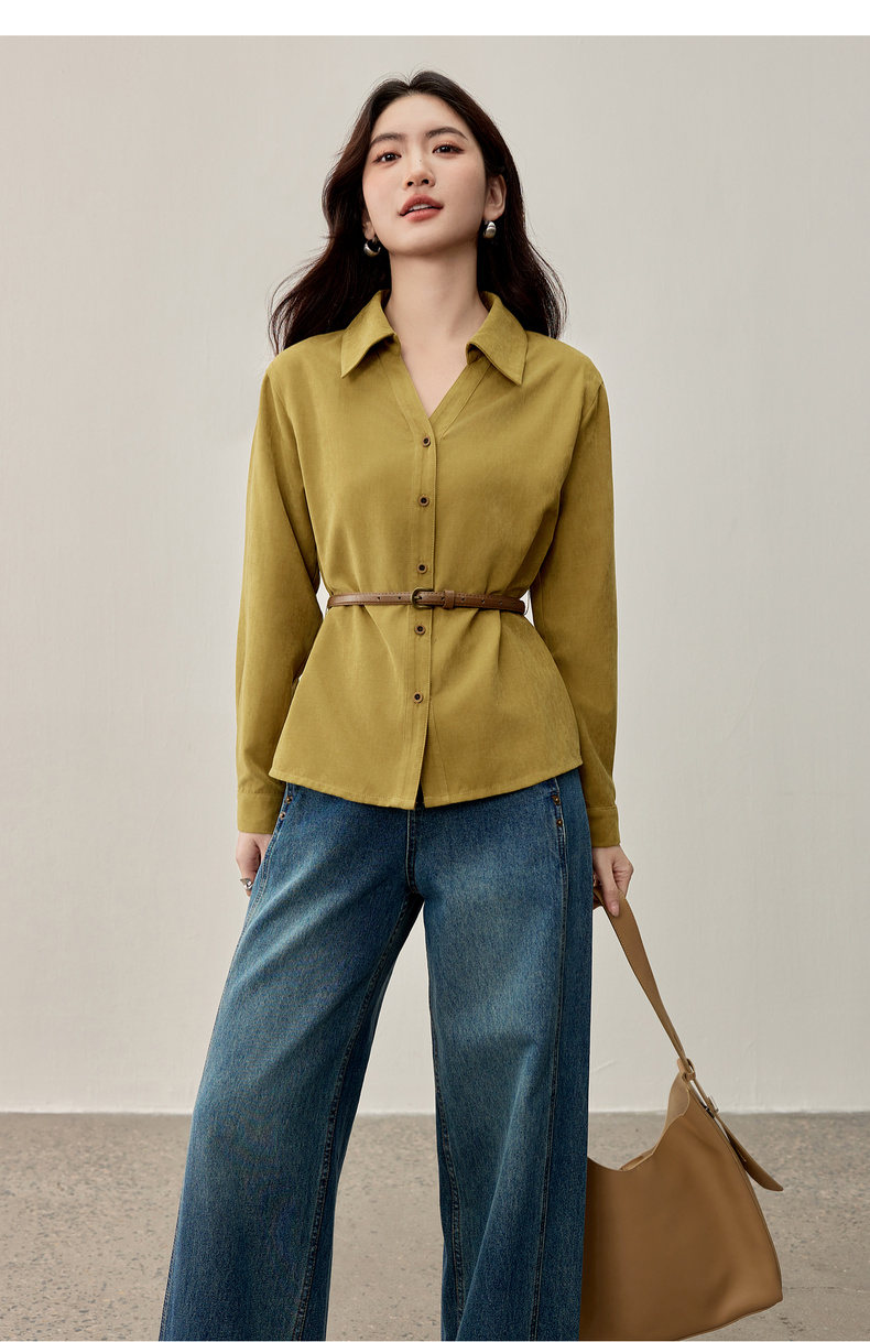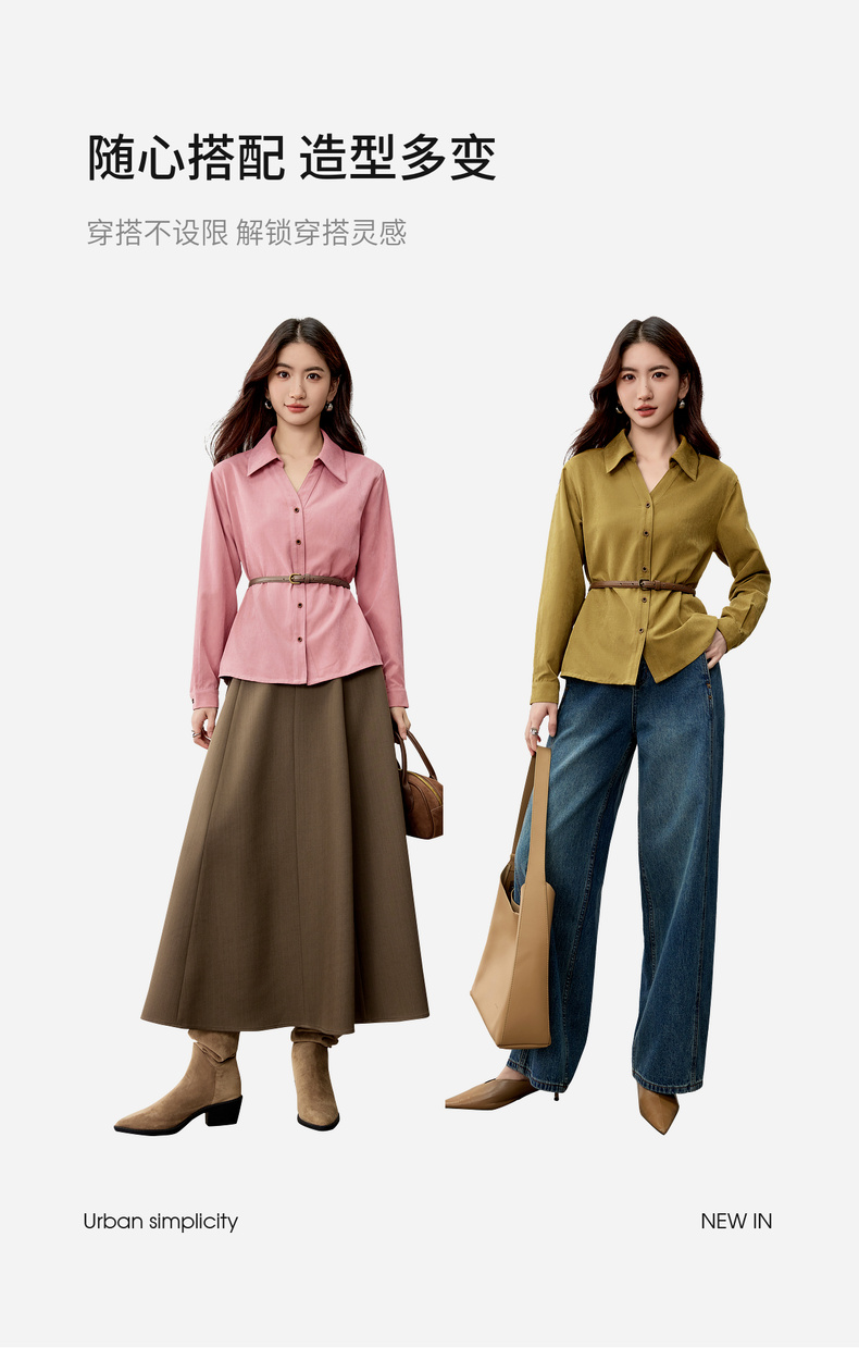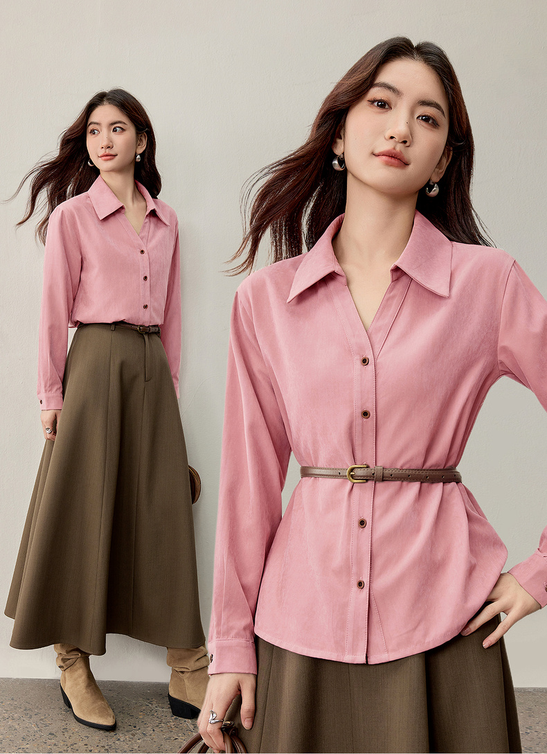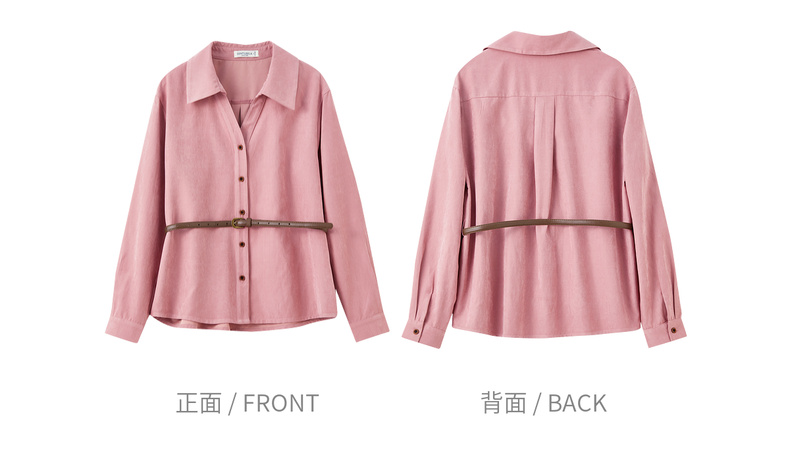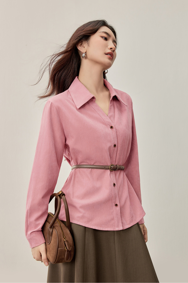 【内购】【撞色腰带】气质通勤V型翻领单排扣可拆卸腰带长袖桃皮绒衬衫-W53CA2862