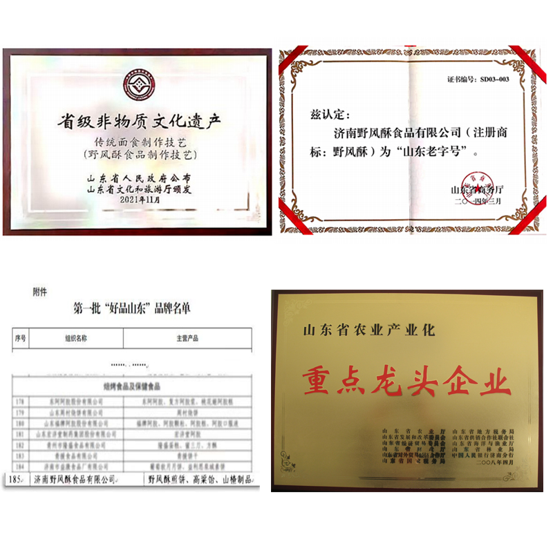 - 济南野风酥食品有限公司是一家从事绿色无公害农产品深加工,生产山东特产食品的企业。职工总人数586人,其中高中级技术人员56人。2007年济南野风酥食品有限公司被山东省人民政府授予省级农业产业化经营重点龙头企业。我公司生产的糖酥煎饼等系列产品曾连续获农业部、山东省优质产品奖,被人民大会堂定为国宴用品。“九顶塔”牌商标获得“省优”“部优”商标称号。全国著名的营养学家于若木曾来厂视察并亲笔题词,姜春云、苏毅然等国家、省级领导先后来厂视察。“野风酥”被中国食品协会评为“优秀民族食品”,获得“中华名吃”称号。产品连续获得国家级食品展销会的畅销产品奖,成为山东省的特色食品,省、市旅游局的十佳旅游商品。“山东煎饼”和“山东烧饼” 被认证为绿色食品。