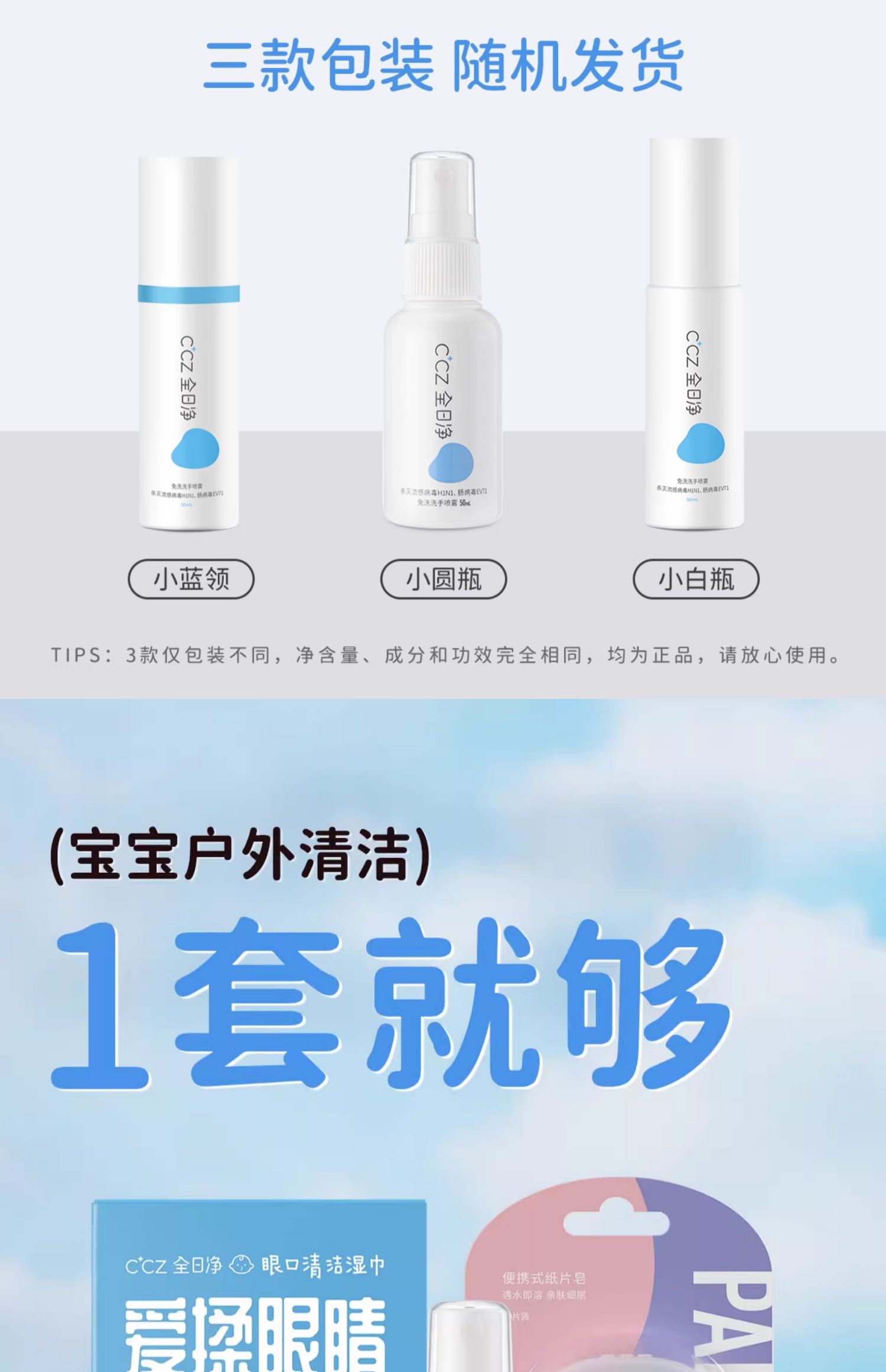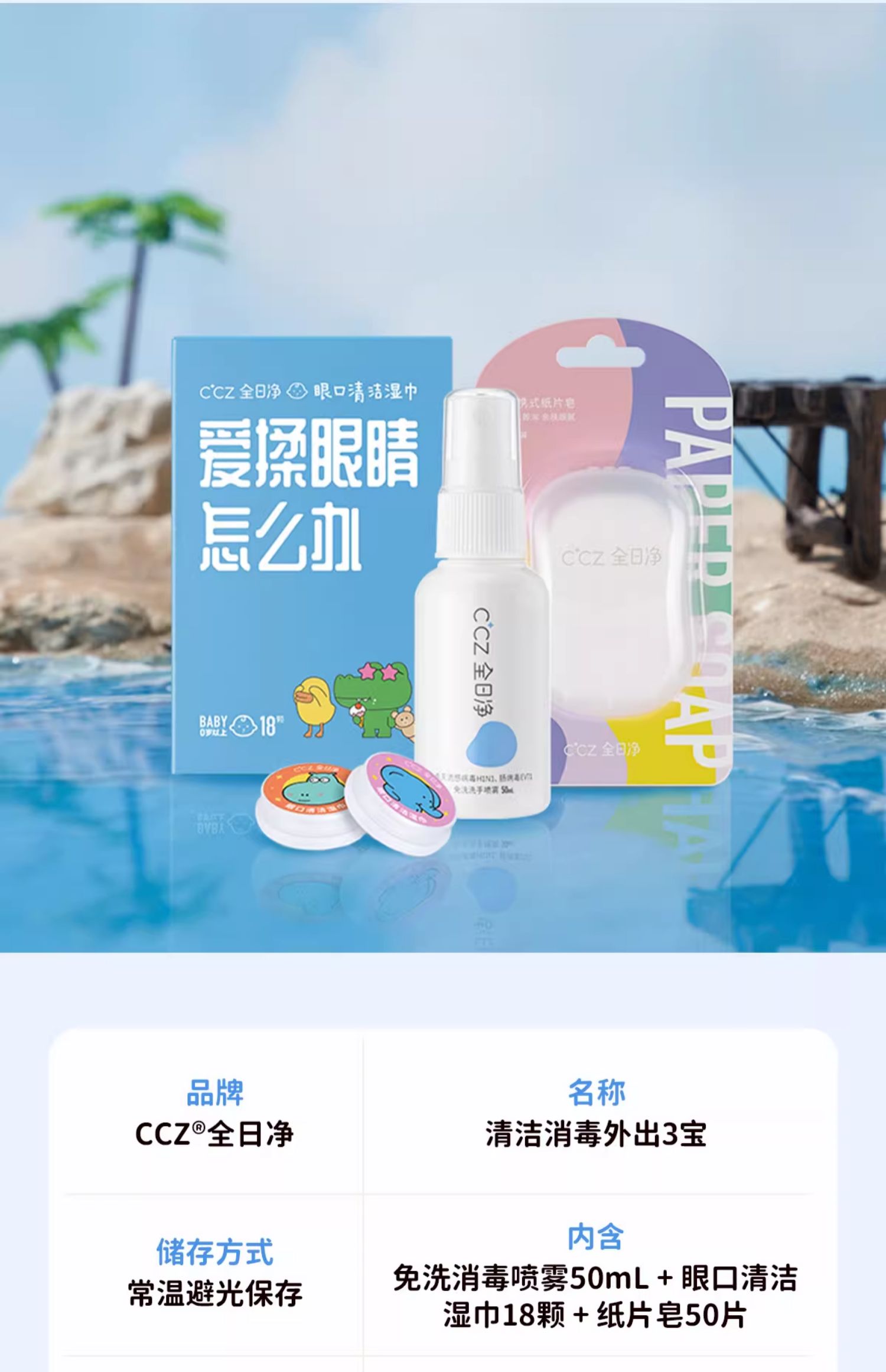 CCZ 全日净清洁消毒外出三宝(免洗手消毒喷案 50mL+眼口清洁湿巾 18 枚/盒+纸片皂 50片/盒)