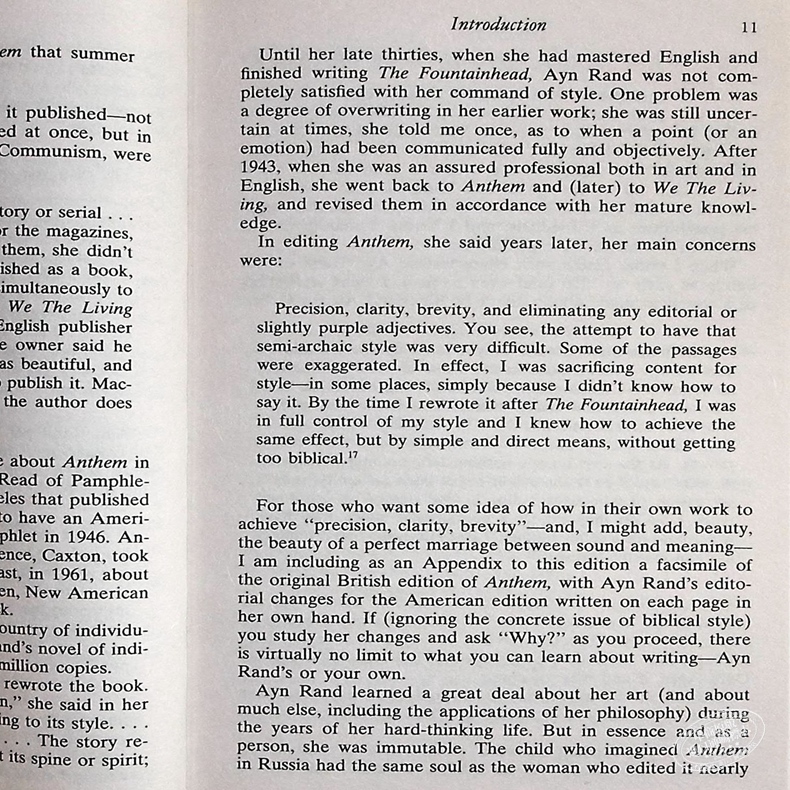 Born February 2, 1905, Ayn Rand published her first novel, We the Living, in 1936. Anthem followed in 1938. It was with the publication of The Fountainhead (1943) and Atlas Shrugged (1957) that she achieved her spectacular success. Ms. Rand’s unique philosophy, Objectivism, has gained a worldwide audience. The fundamentals of her philosophy are put forth in three nonfiction books, Introduction to Objectivist Epistemology, The Virtue of Selfishness, and Capitalism: The Unknown Ideal. They are all available in Signet editions, as is the magnificent statement of her artistic credo, The Romantic Manifesto.