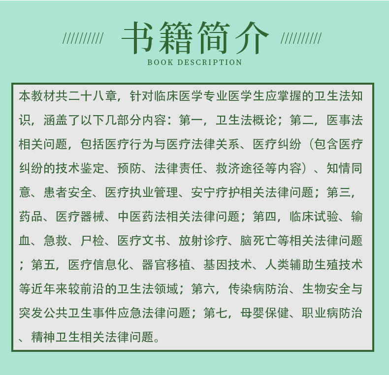 本教材共二十八章,针对临床医学专业医学生应掌握的卫生法知识,涵盖了以下几部分内容:**,卫生法概论;**,医事法相关问题,包括医疗行为与医疗法律关系、医疗纠纷(包含医疗纠纷的技术鉴定、预防、法律责任、救济途径等内容)、知情同意、患者安全、医疗执业管理、安宁疗护相关法律问题;第三,药品、医疗器械、中医药法相关法律问题;第四,临床试验、输血、急救、尸检、医疗文书、放射诊疗、脑死亡等相关法律问题;第五,医疗信息化、器官移植、基因技术、人类辅助生殖技术等近年来较前沿的卫生法领域;第六,传染病防治、生物安全与突发公共卫生事件应急法律问题;第七,母婴保健、职业病防治、精神卫生相关法律问题。