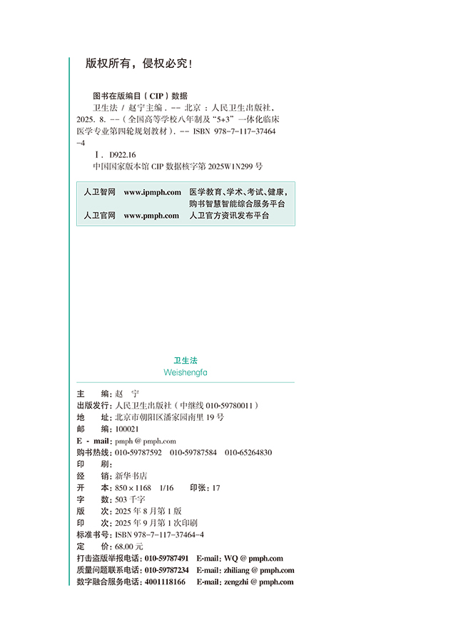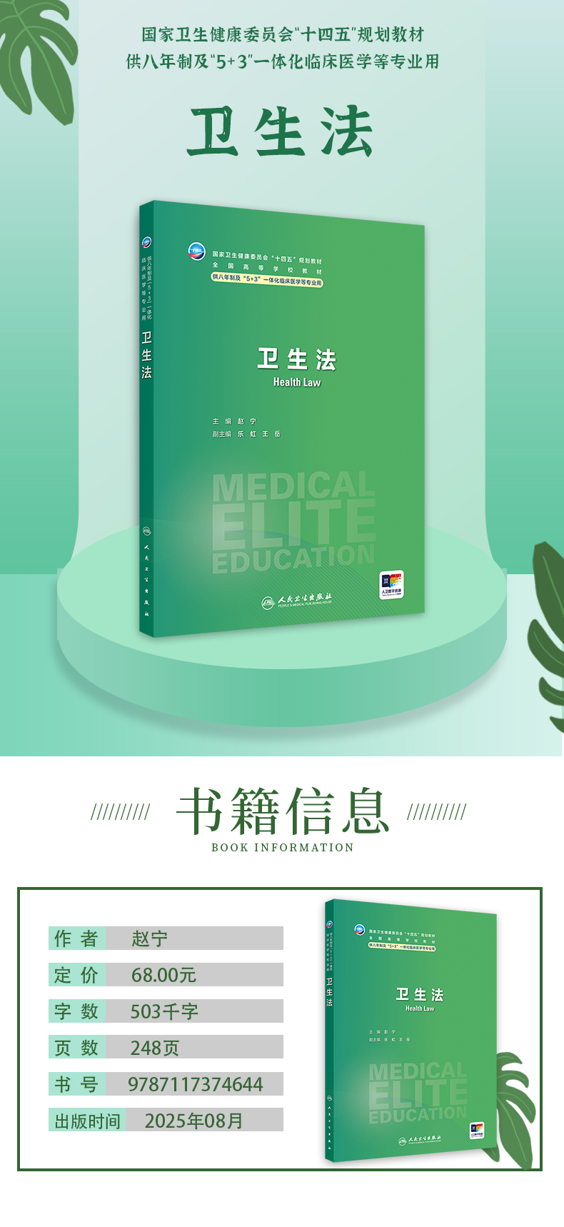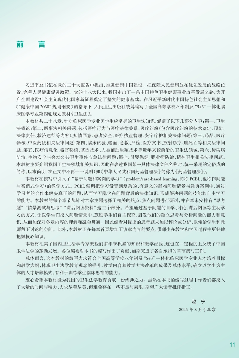 卫生法 十四五规划教材 全国高等学校教材 赵宁 主编 供八年制及“5+3"一体化临床医学等专业用 9787117374644人民卫生出版社