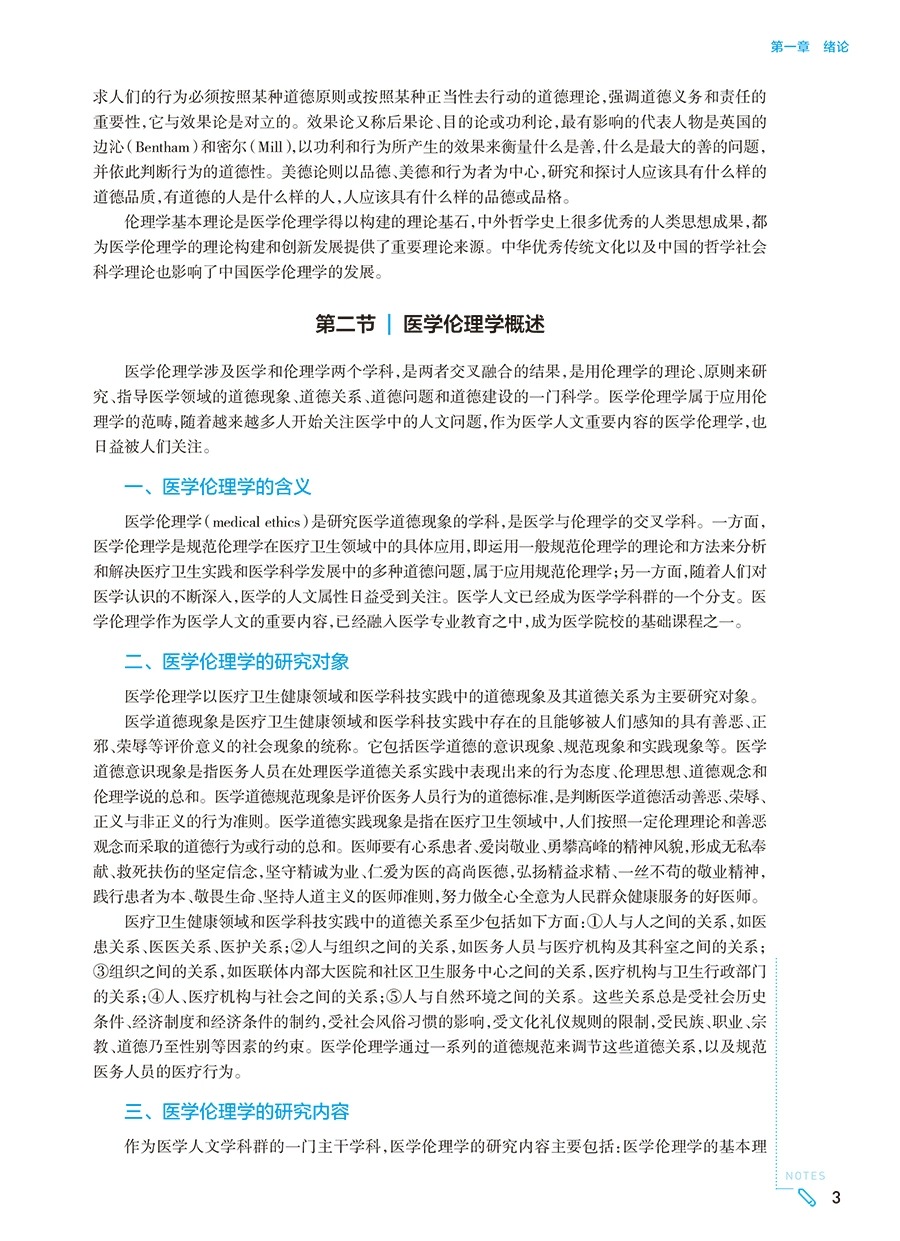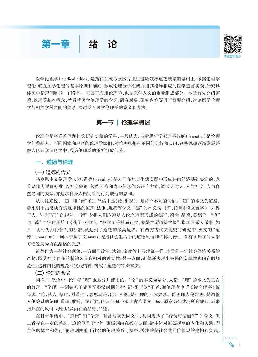 内容①突出政治性:以习近平新时代中国特色社会主义思想、党的二十大精神及中华优秀传统文化作为一个整体线索贯穿整个教材。围绕我国医学发展面临的重要伦理问题,除了介绍西方伦理学基本理论,还需着力提出能够体现中国立场、中国智慧、中国价值的理念、主张、方案。②彰显时代性:强化医学生对医学道德规范的认知和学习。体现为进一步丰富第四章”医学伦理规范体系“和第五章”医学道德规范“内容。更新医学科研伦理相关内容。新增积极生育观、医学人工智能、医疗大数据伦理等。③强化实践性:医学伦理学除了理论学习,更重要的是理论结合实际,指导医学生及医护人员的临床实践、伦理认同及医德践行。第6版教材将紧密结合临床工作、医患关系、医改实践、医德修养的养成等内容,在理论介绍的基础上,补充丰富的相关案例供学生讨论和思考。充分利用数字手段提供医疗情境,让学生身临其境去思考问题,并结合伦理理论和原则去认识问题和处理问题,最终指导医学生正确处理临床中的伦理问题,达到从认知、认同到践行的目的。