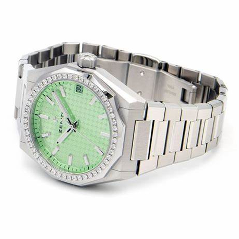 镜面 材质 | 蓝宝石水晶玻璃 | 表盘 | 八边形精钢表壳,精钢表圈镶嵌52颗VVS明亮式切割钻石 幸运绿色太阳纹金属表盘,表盘上饰有夜光时标 日期显示 透底 |