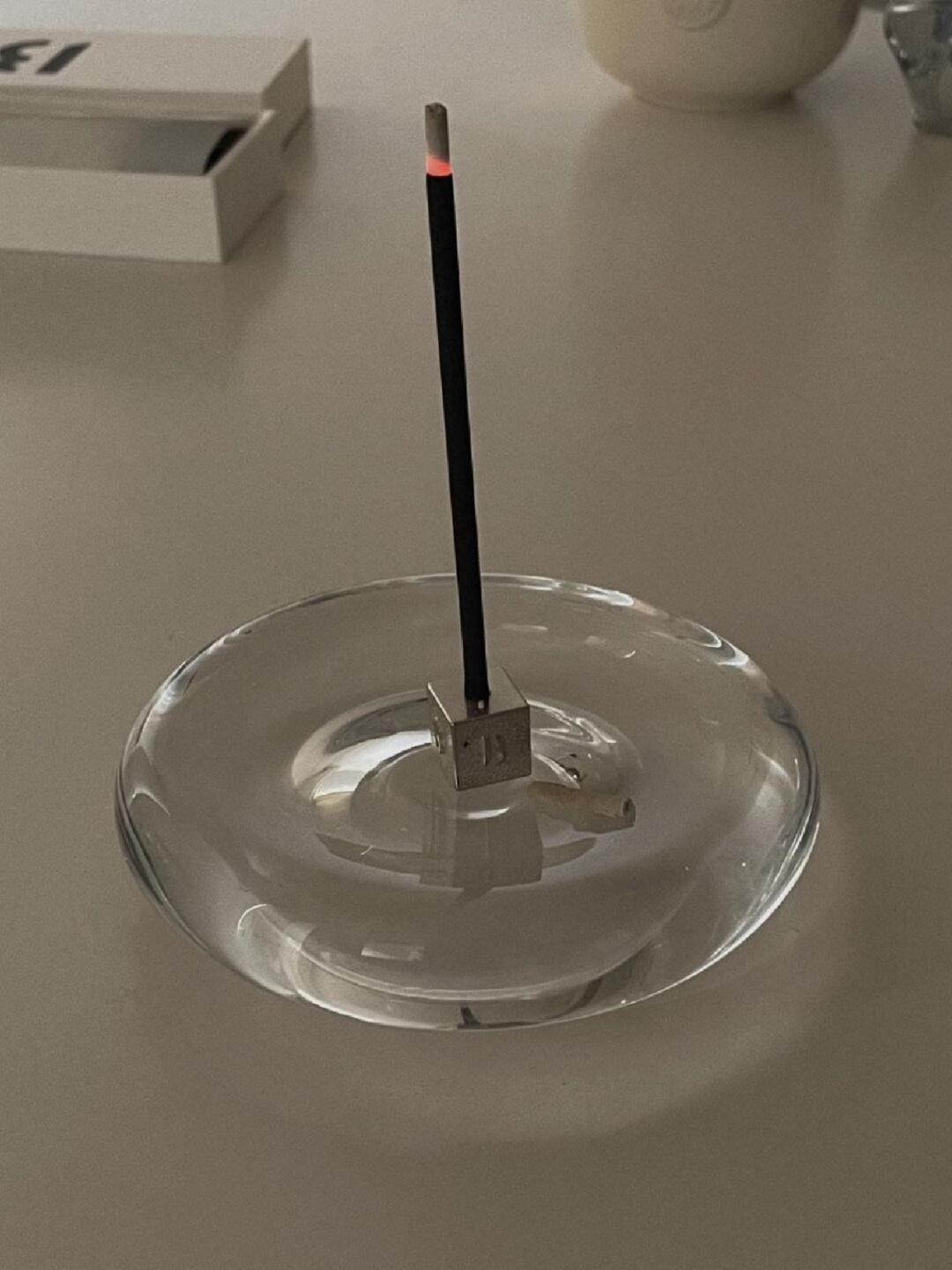 点燃香棒,轻轻挥灭,插入器皿。