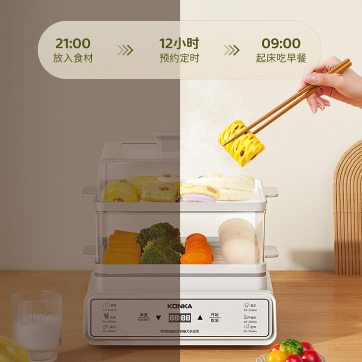 康佳电蒸锅,支持12小时超长时间预约,早八晚八打工人的一日三餐,它都能轻松承包: