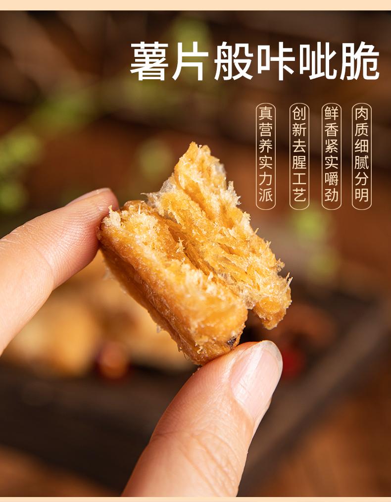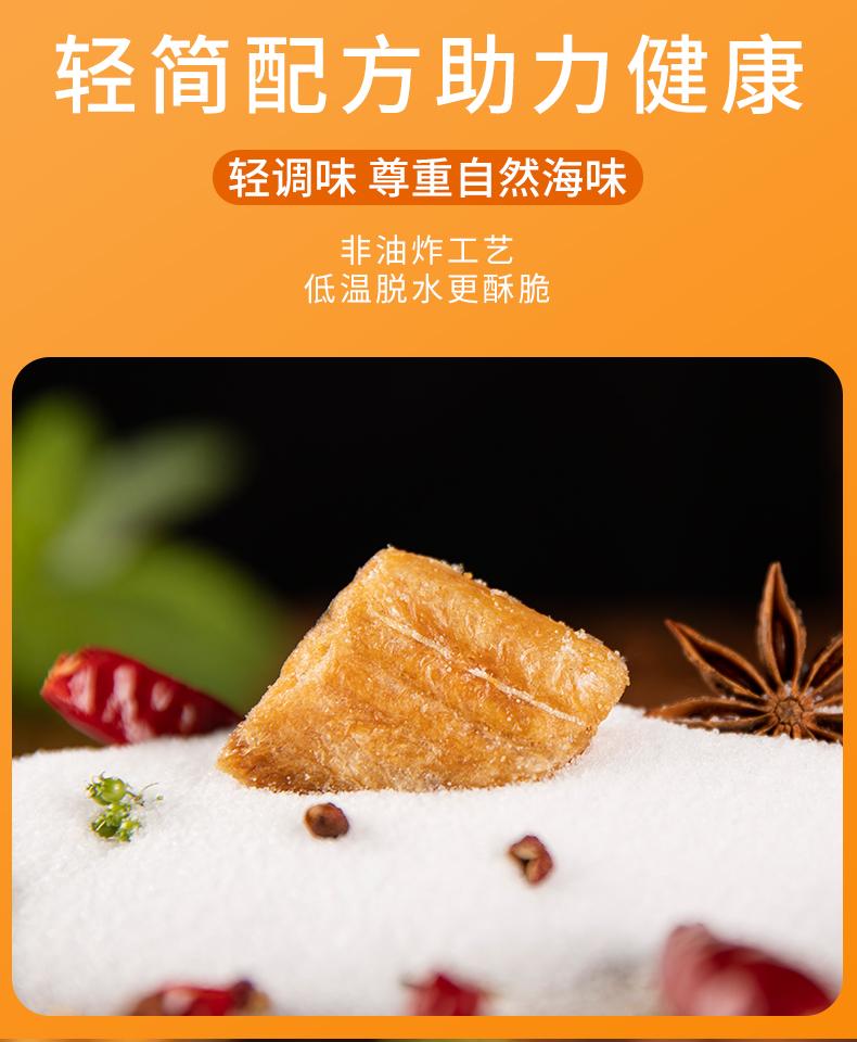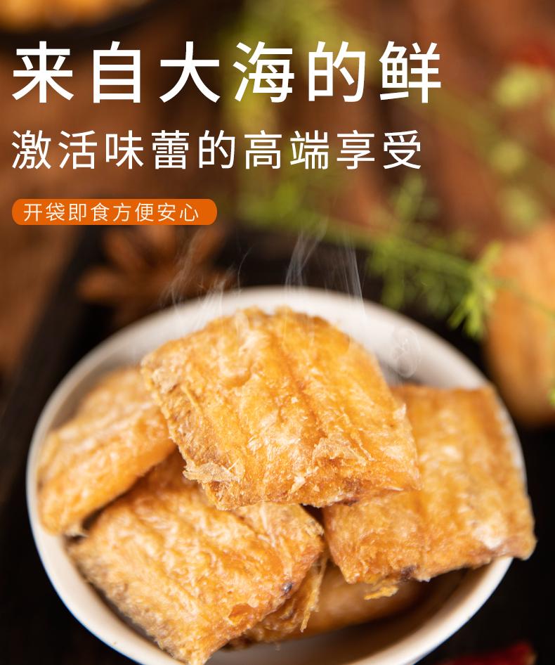 2.制作工艺:低温烘烤制成,真空脱水轻调味,去掉内脏,切成块状,块块酥脆, 多道工艺去腥留香3.口感:口感鲜香酥脆,酥若无骨,肉质酥脆,肥美紧实,鲜香味美,保留纯鱼肉,无需吐刺,层层激发地道浓郁海味