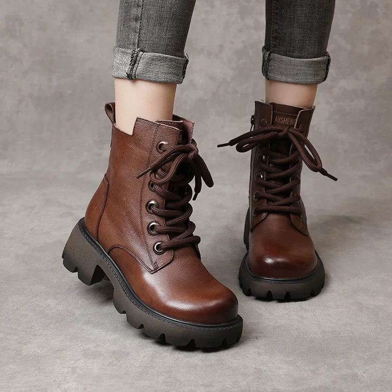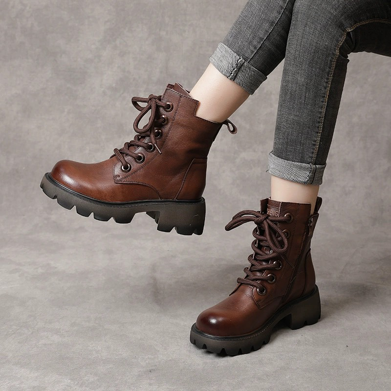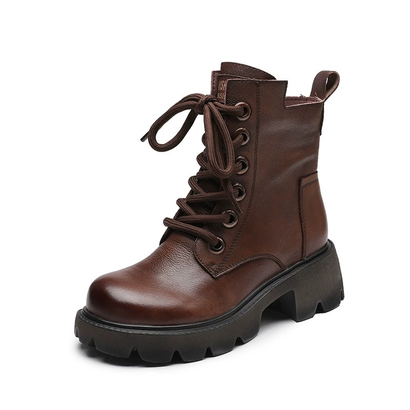 康珊2023年秋冬真皮英伦风马丁靴女粗跟防滑短靴复古百搭休闲加绒棉靴