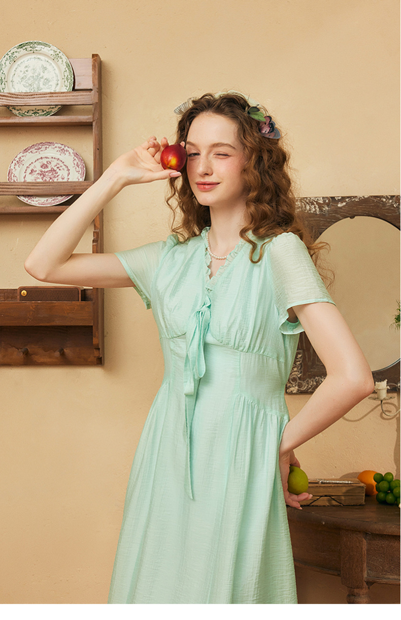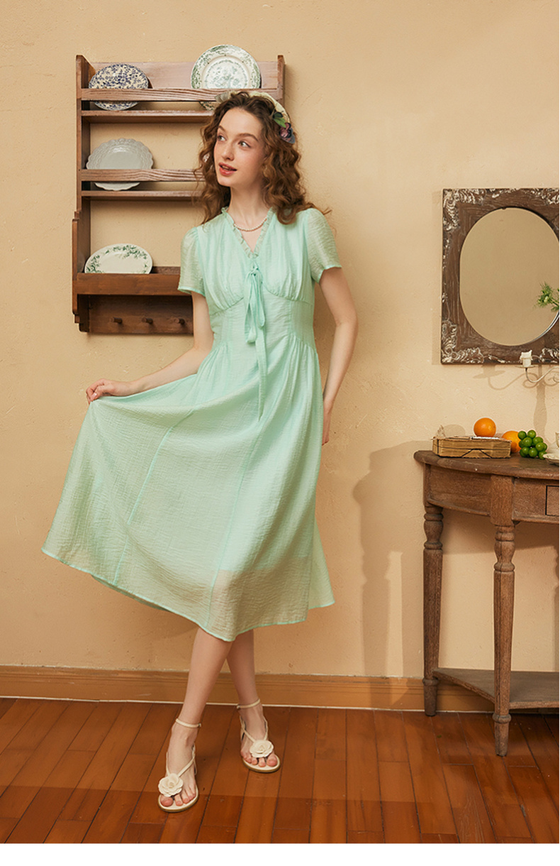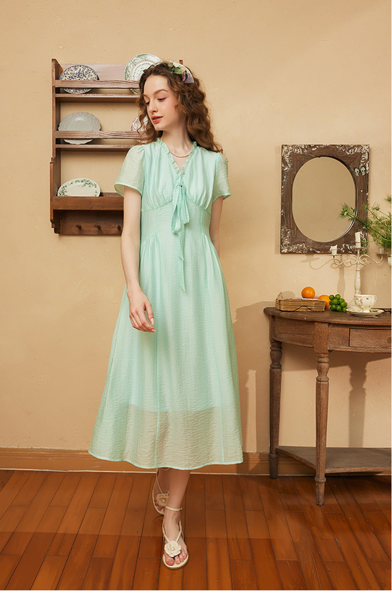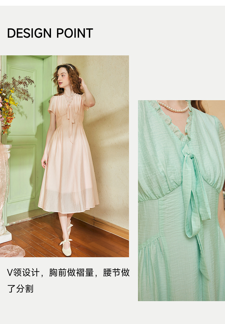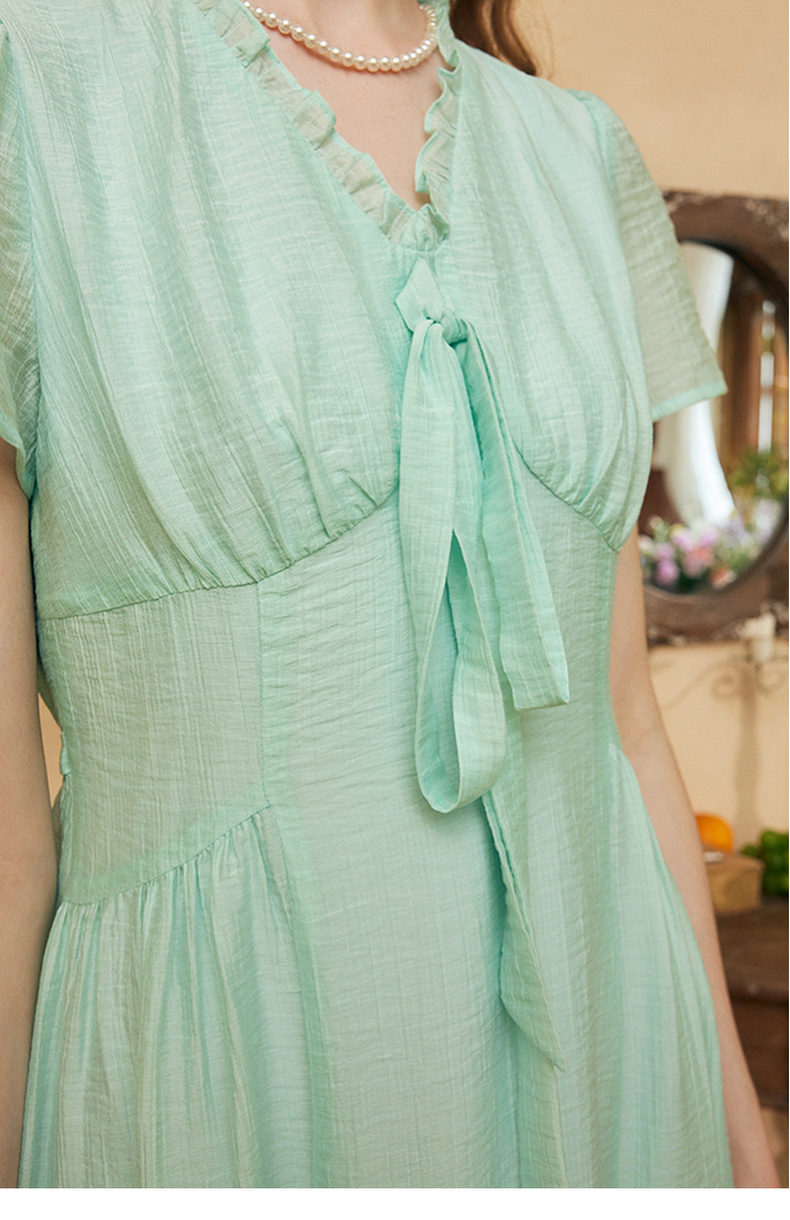 两三事 风也温柔 2024夏季新款小清新荷叶边v领绑带a字连衣裙