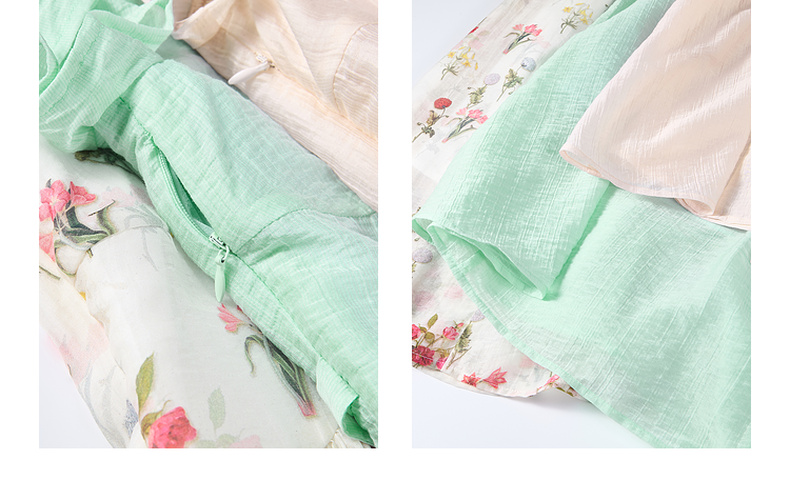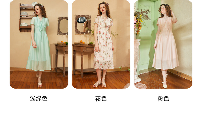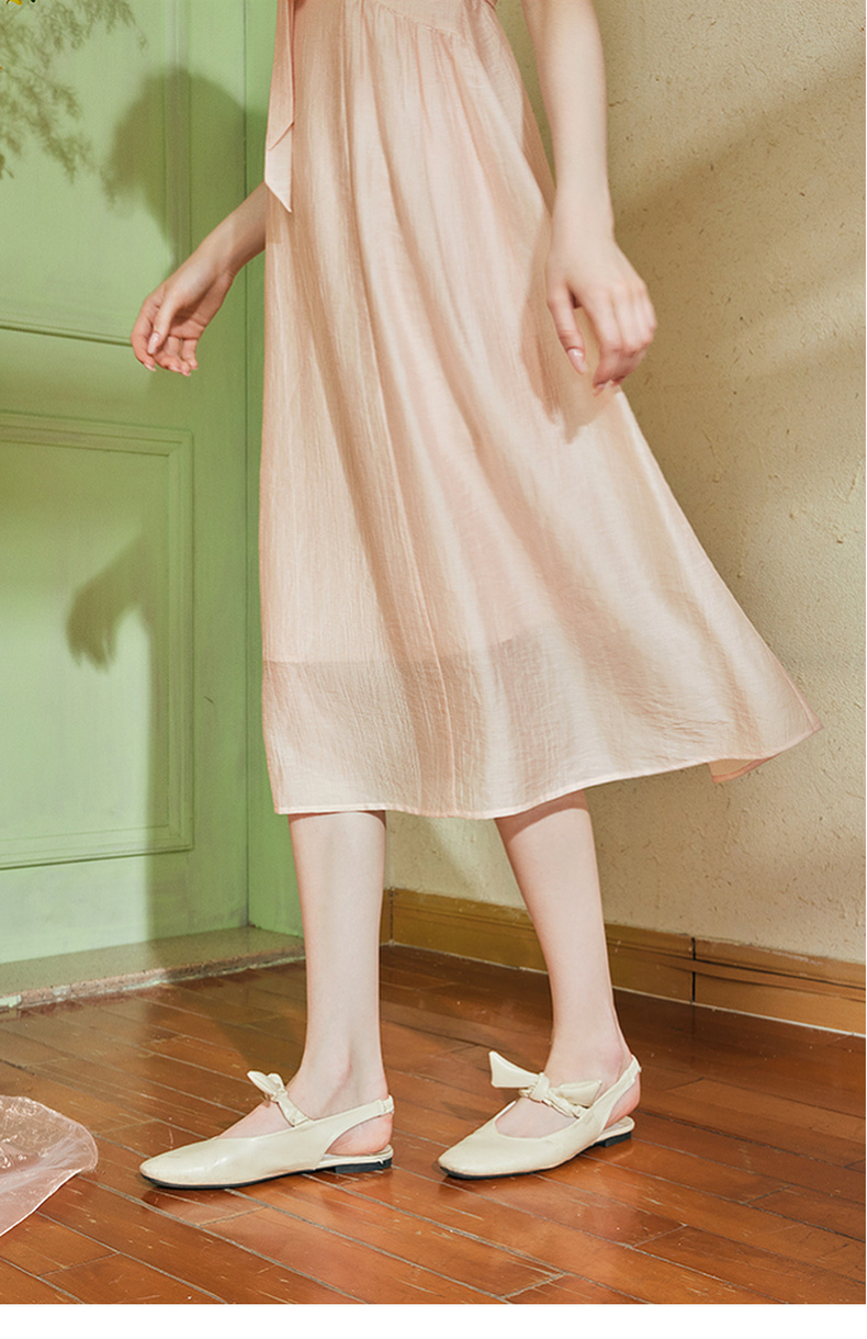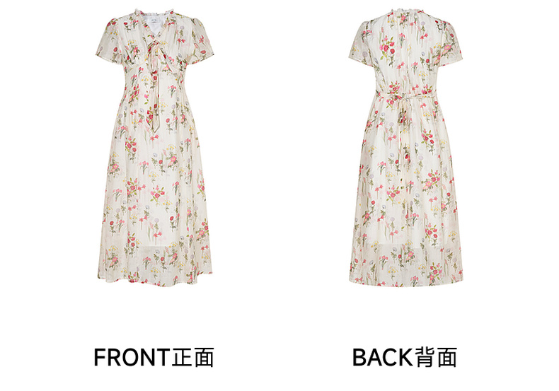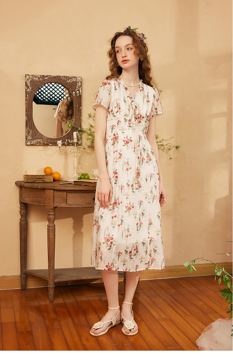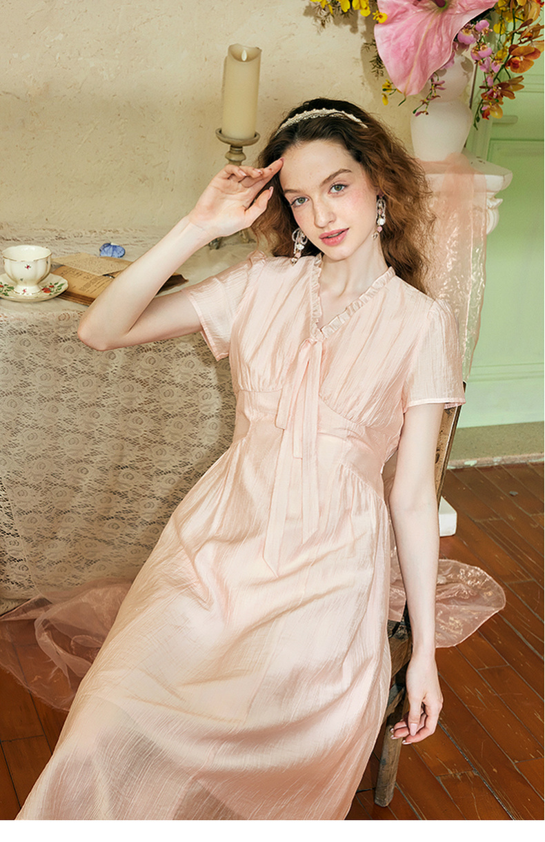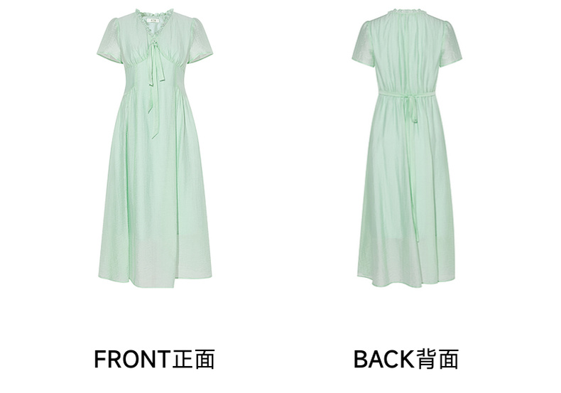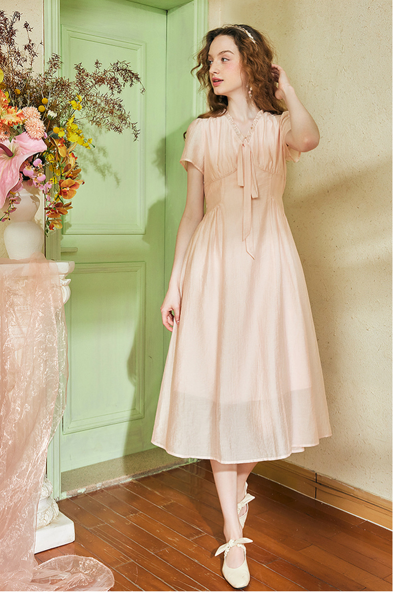 两三事 风也温柔 2024夏季新款小清新荷叶边v领绑带a字连衣裙